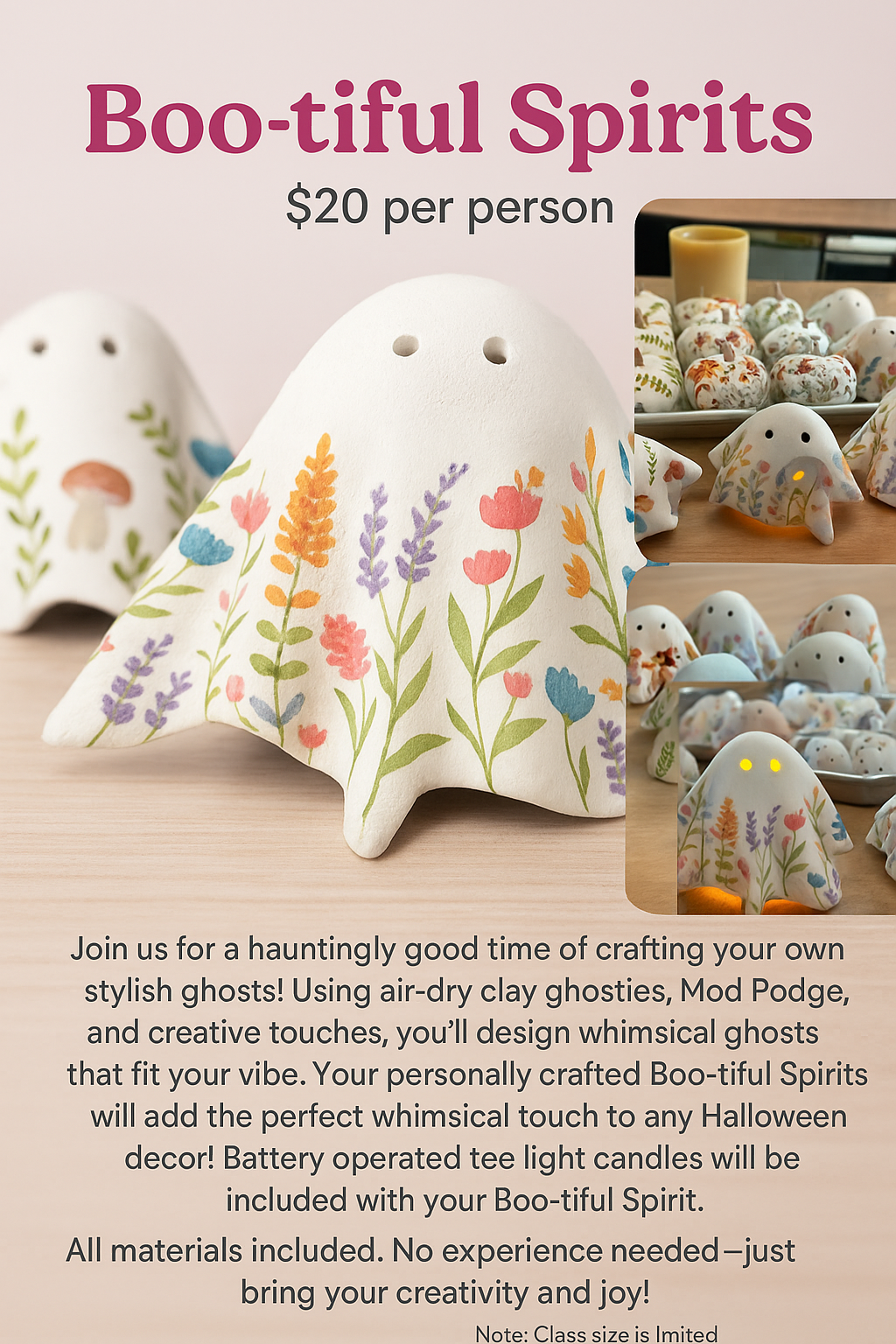 Join us for a hauntingly good time of crafting your own stylish ghosts! Using air-dry clay ghosties, Mod Podge, and creative touches, you’ll design whimsical ghosts that fit your vibe. Your personally crafted Boo-tiful Spirits will add the perfect whimsical touch to any Halloween décor! Battery operated tea light candles will be included with your Boo-tiful Spirit.