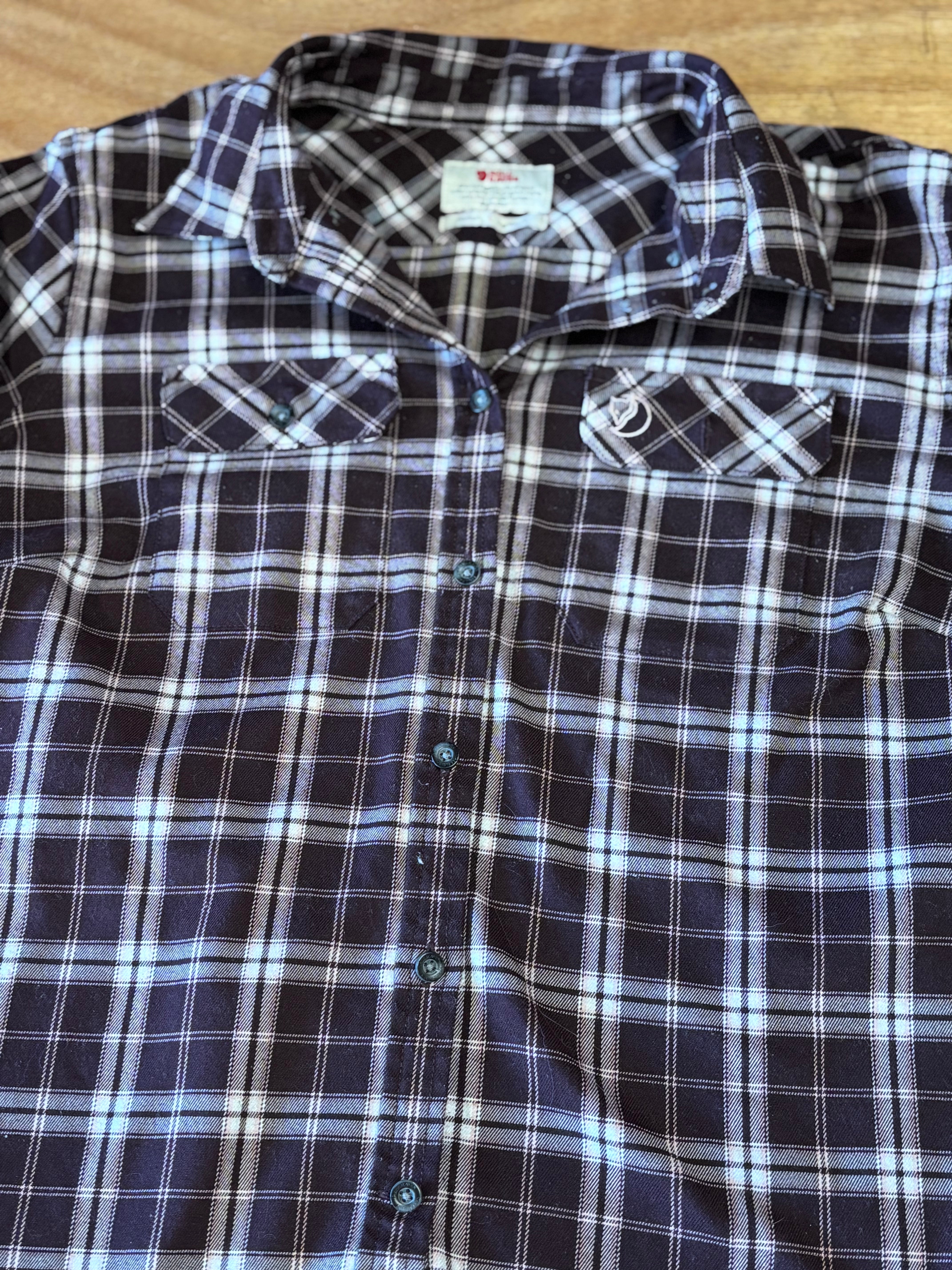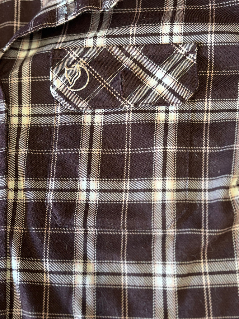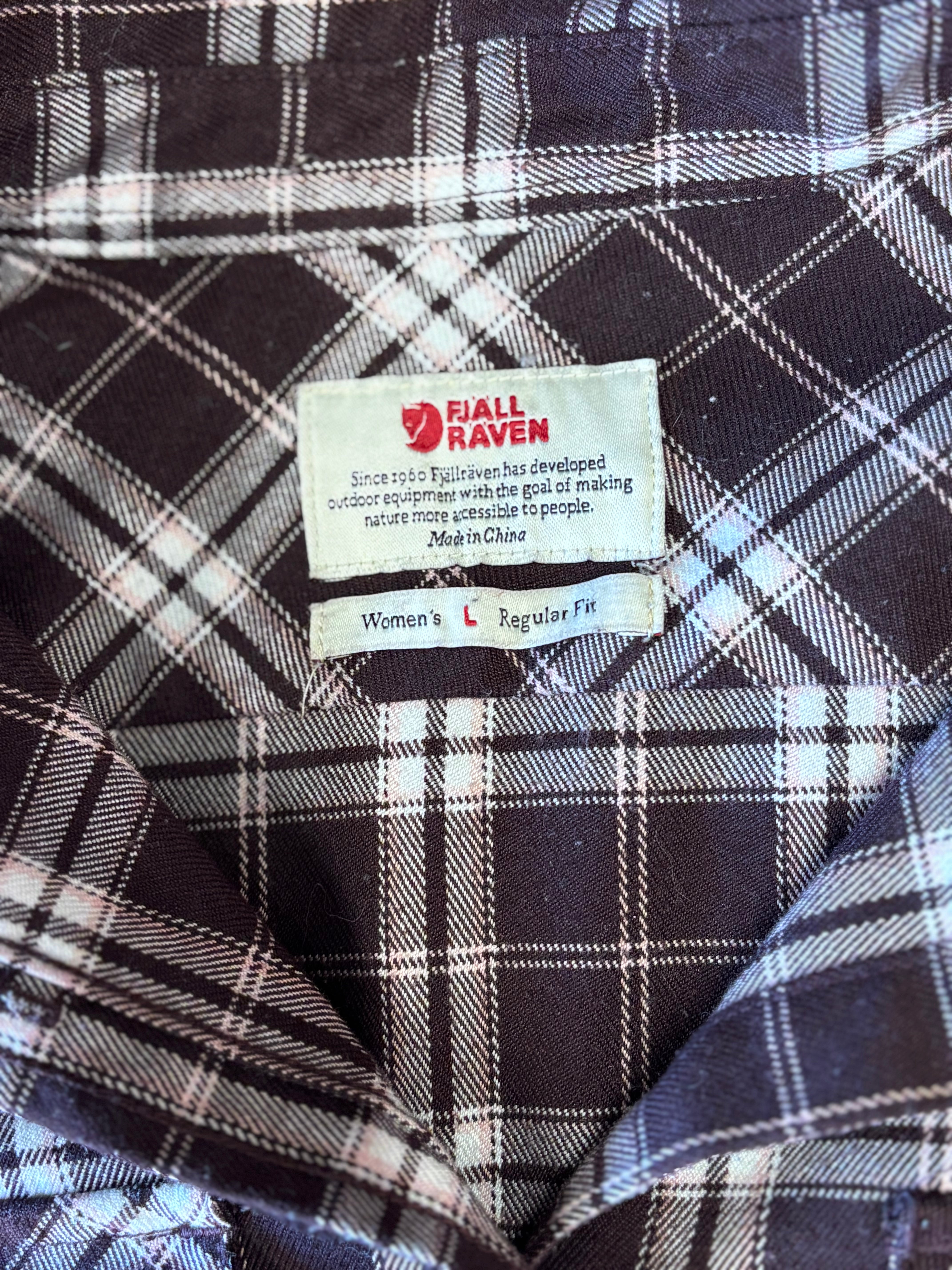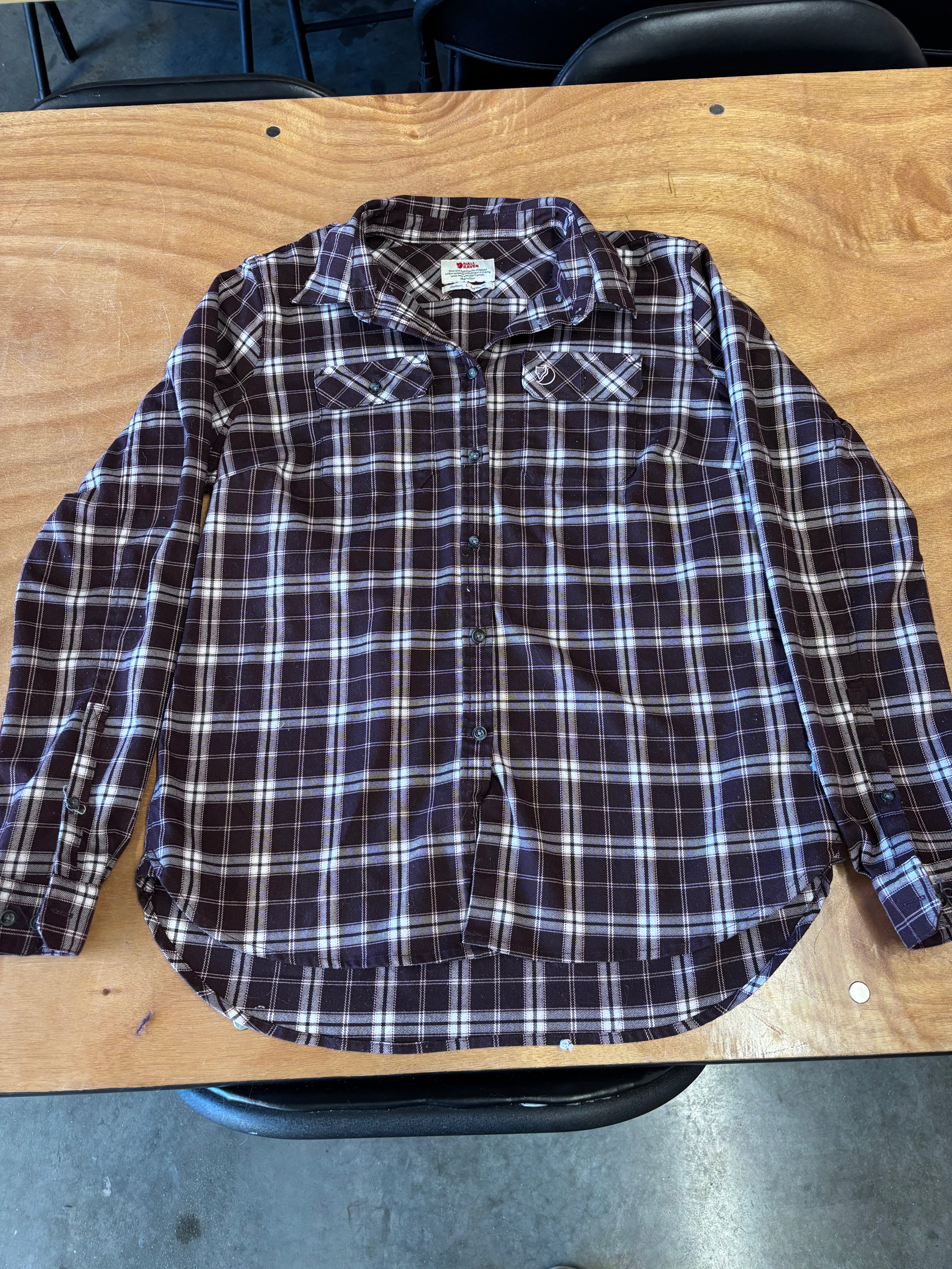 Cozy, high-quality flannel from Fjällräven — the legendary Swedish outdoor brand known for timeless design and durable comfort. This long-sleeve button-down features a classic plaid pattern in deep brown, cream, and soft white tones. The material feels soft yet sturdy, ideal for layering or wearing on its own during chilly weather. It has dual chest pockets, one with the signature Fjällräven Arctic fox logo embroidered on the flap.