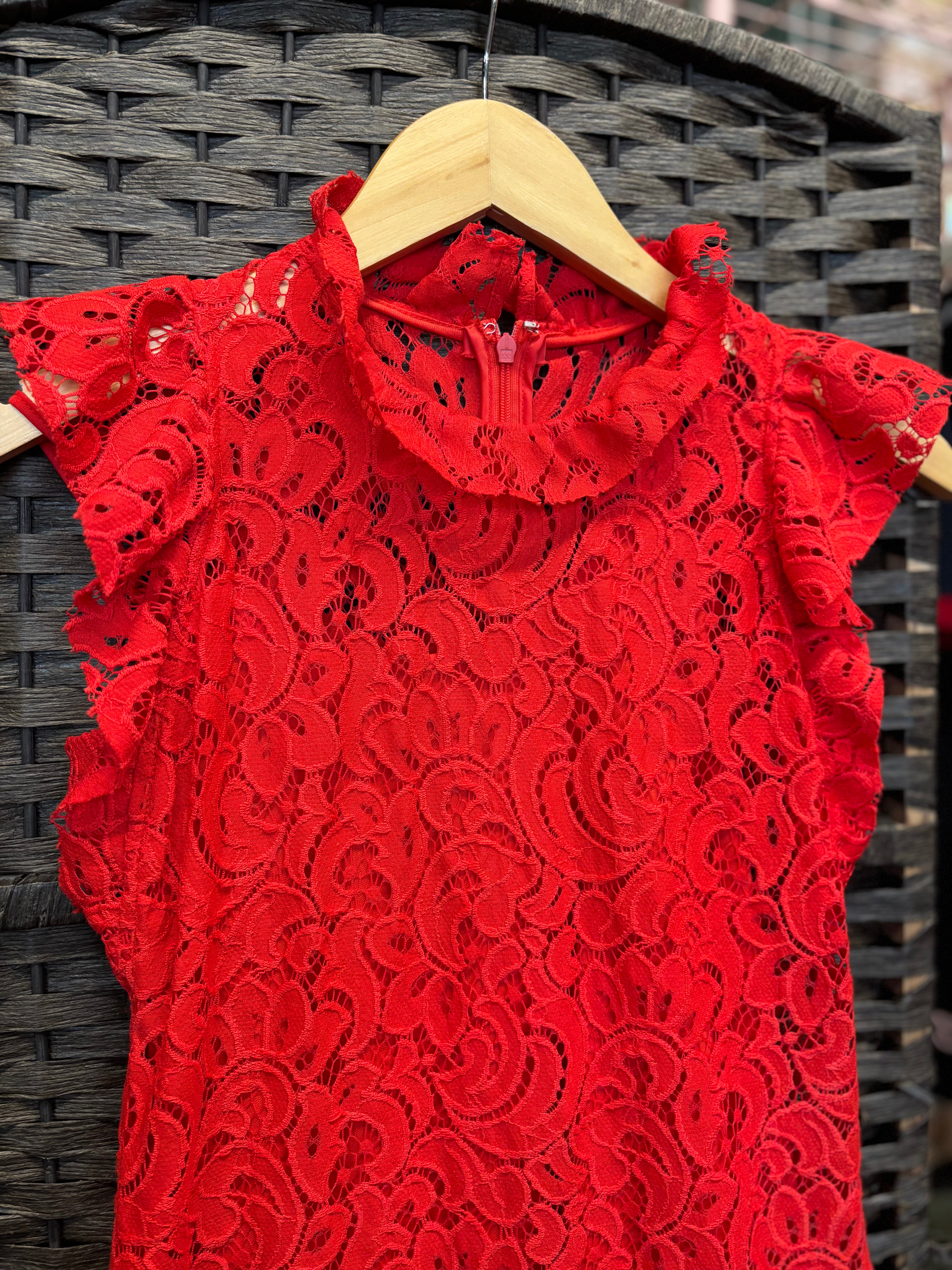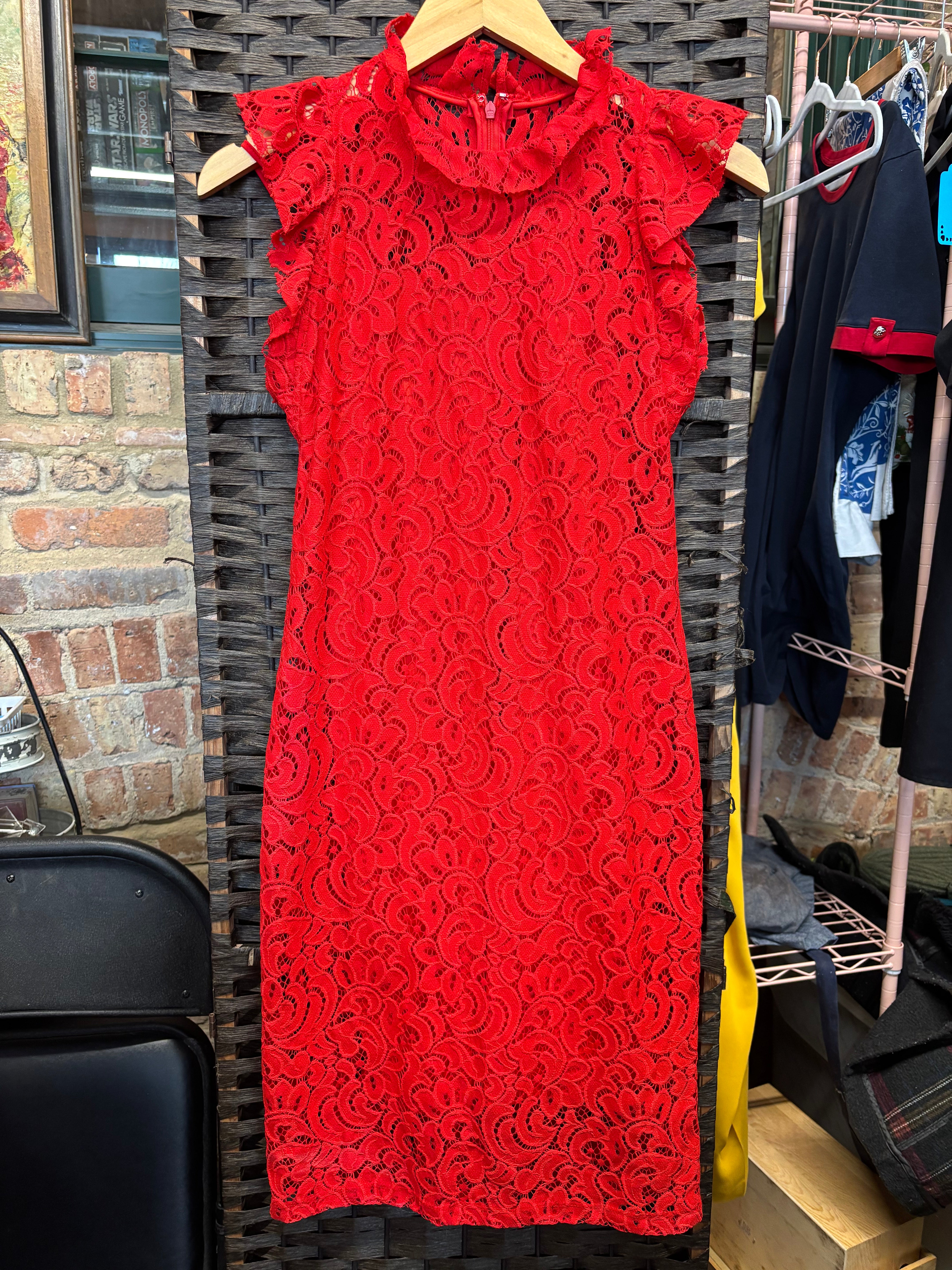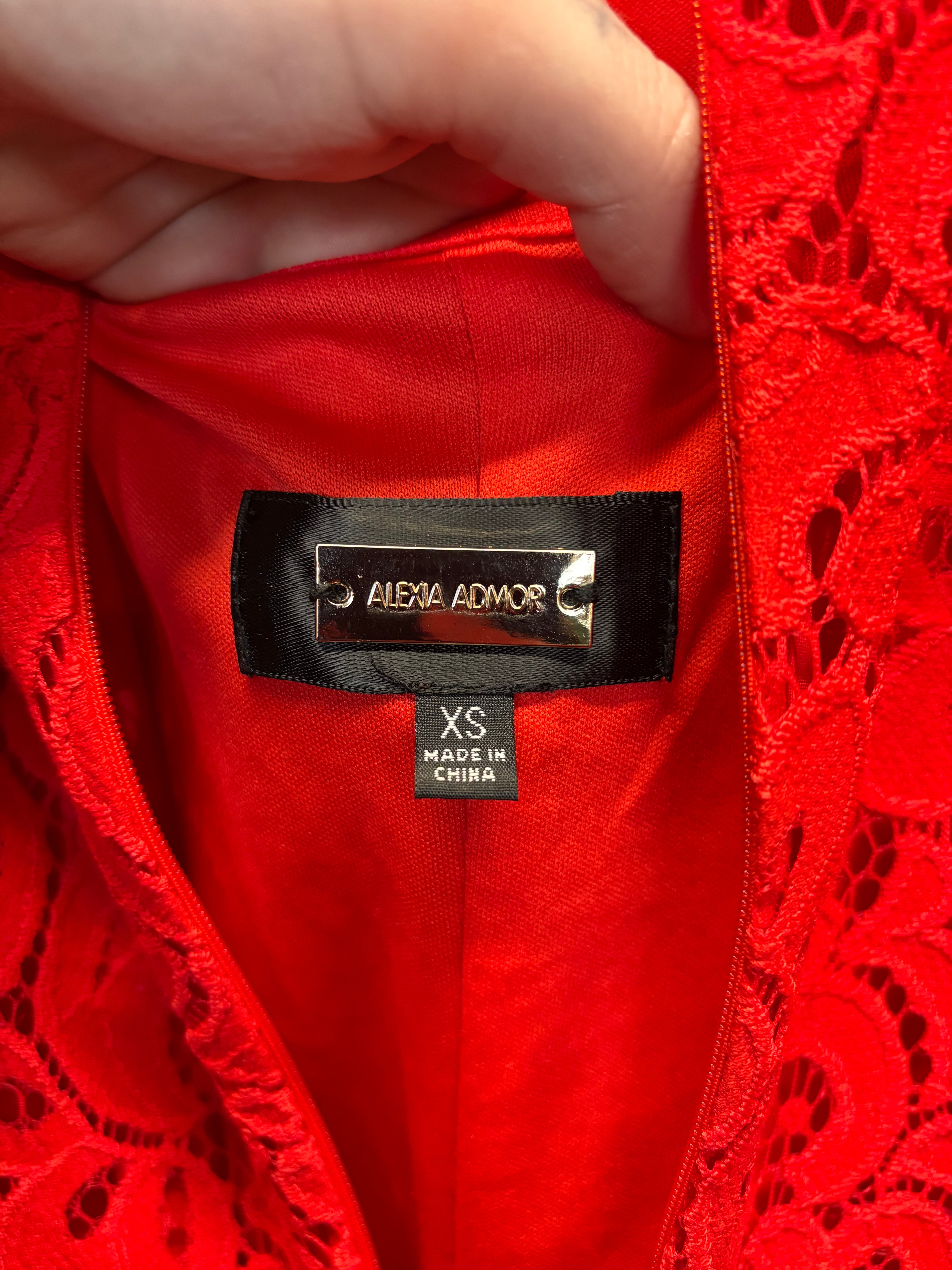 Stunning Alexia Admor red lace cocktail dress in size XS. This piece features a bold and romantic bright-red lace overlay, a fitted sheath silhouette, flutter cap sleeves, and a gorgeous high ruffle neckline. Perfect for holiday parties, weddings, Valentine’s Day looks, date nights, or any event where you want a standout dress.