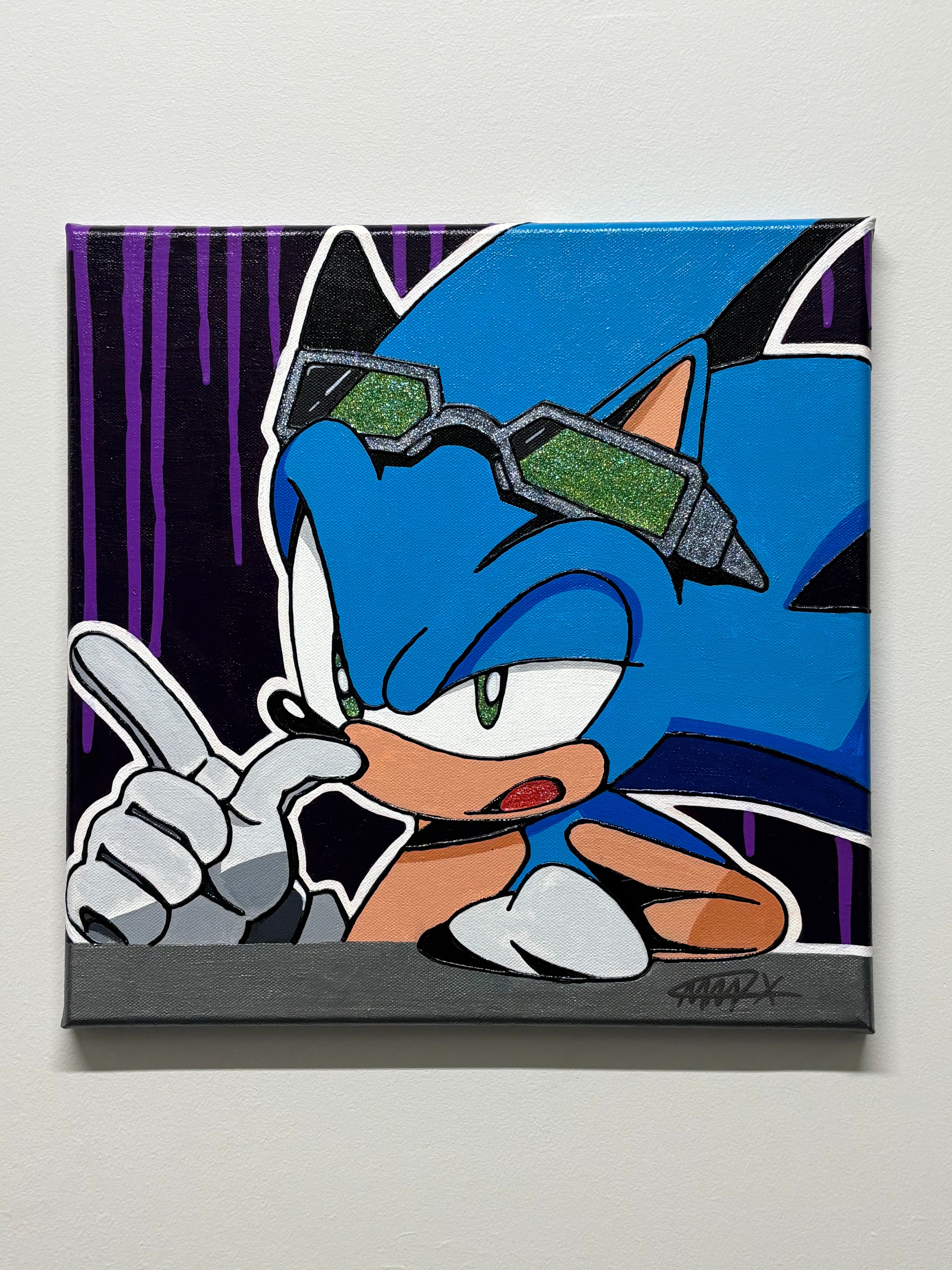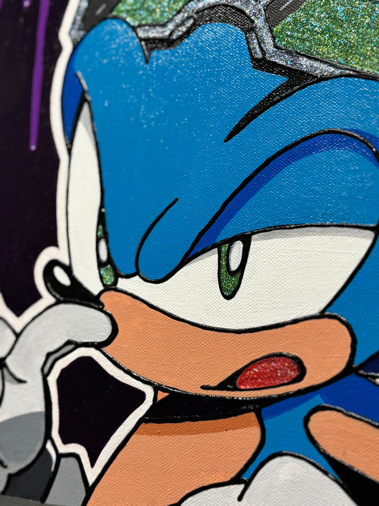 Blast into HYPRDRIVE — an original, hand-painted piece by MartianMucus, bringing a bold pop-art take on Sonic’s unstoppable energy.