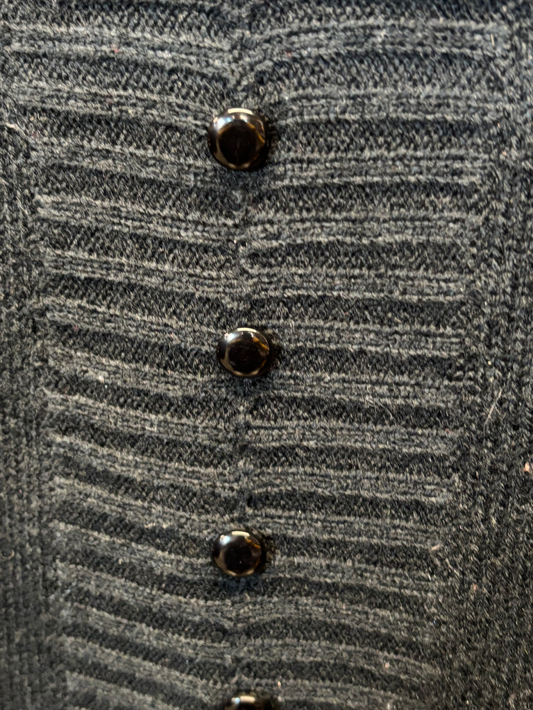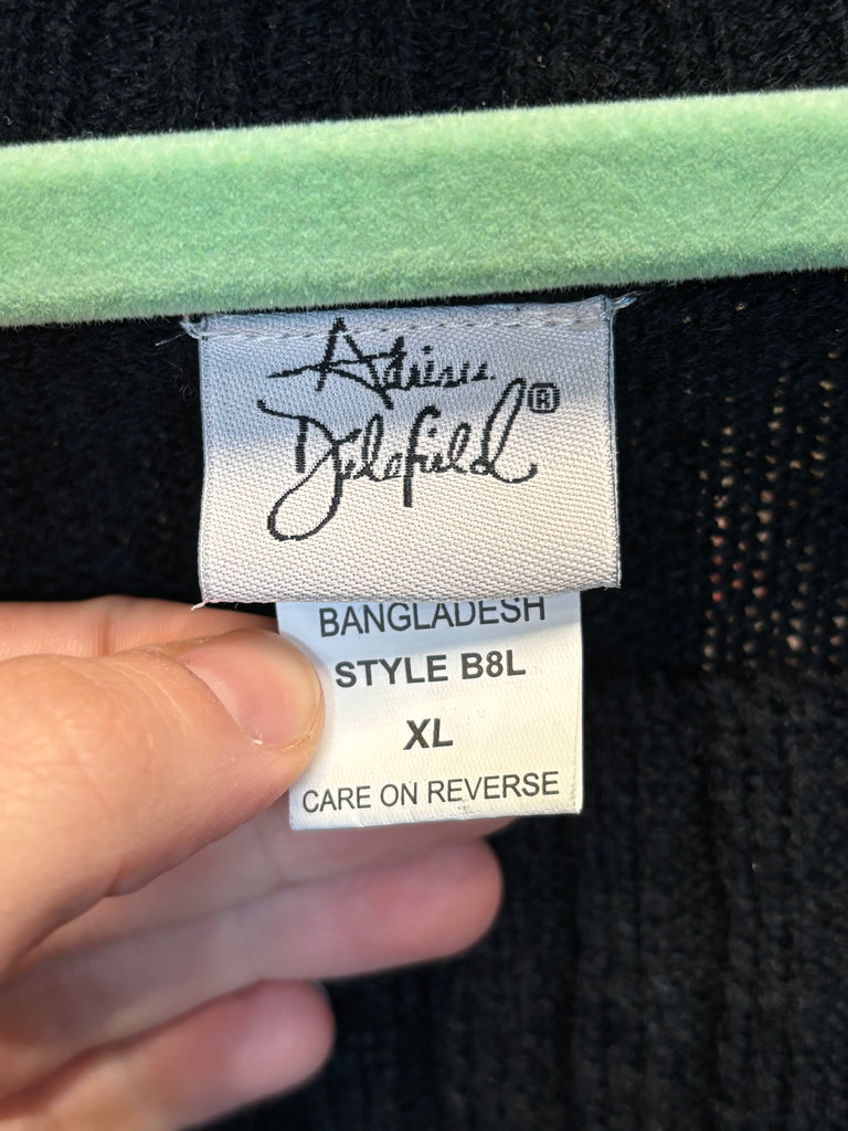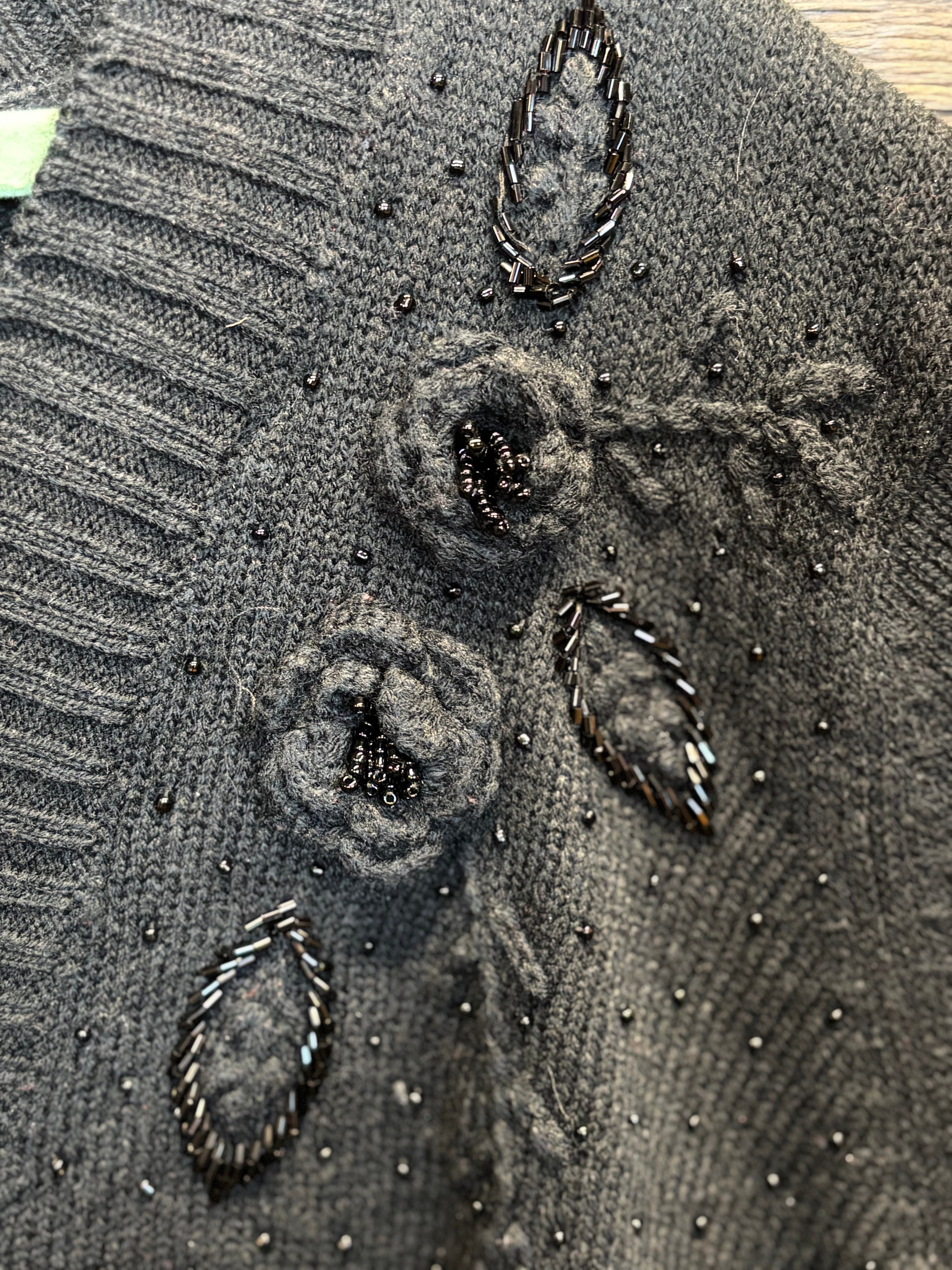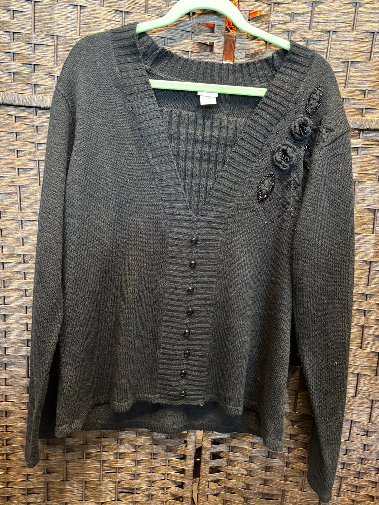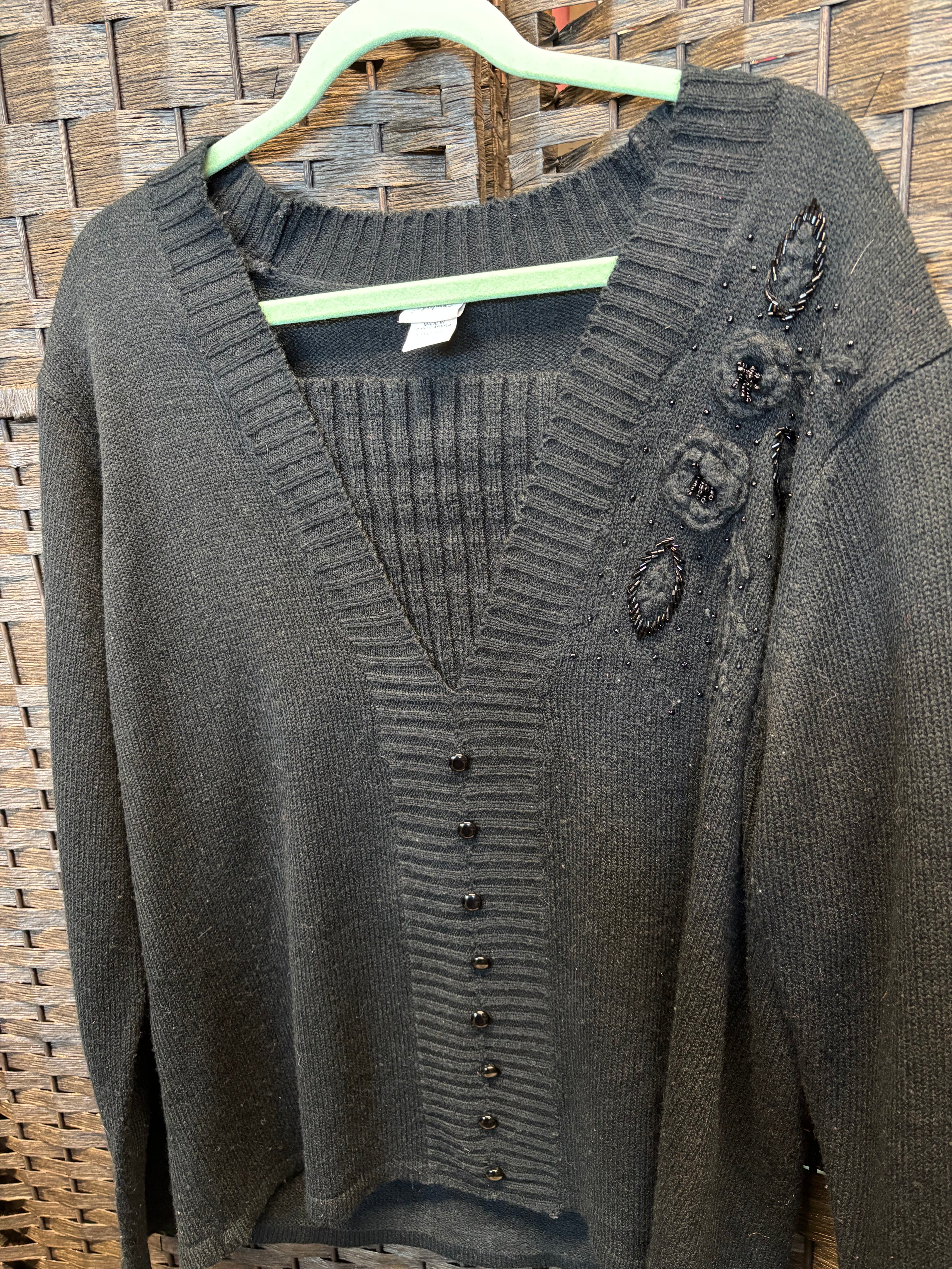 Elegant and timeless, this Adrienne Vitadelfield black knit sweater set features stunning hand-beaded floral embellishments and a ribbed inset panel for a layered look without the bulk. The deep V-neckline and front button accents create a flattering silhouette that transitions easily from day to evening. A perfect mix of cozy and classy — ideal for dinner dates, holidays, or office wear.
