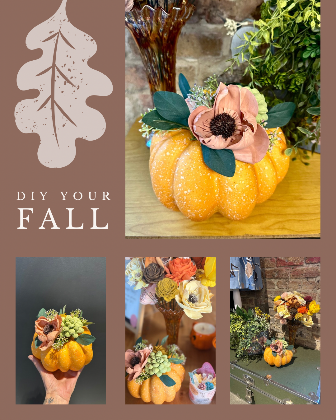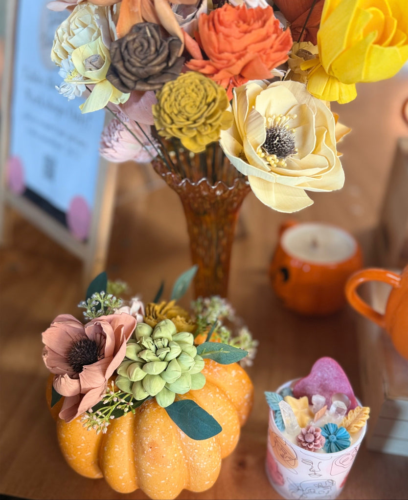 Elevate your pumpkin game and unleash your inner artisan! Join us for a magical workshop where we’re blending the rustic charm of a pumpkin with the hottest material in crafting: **wood flowers!**