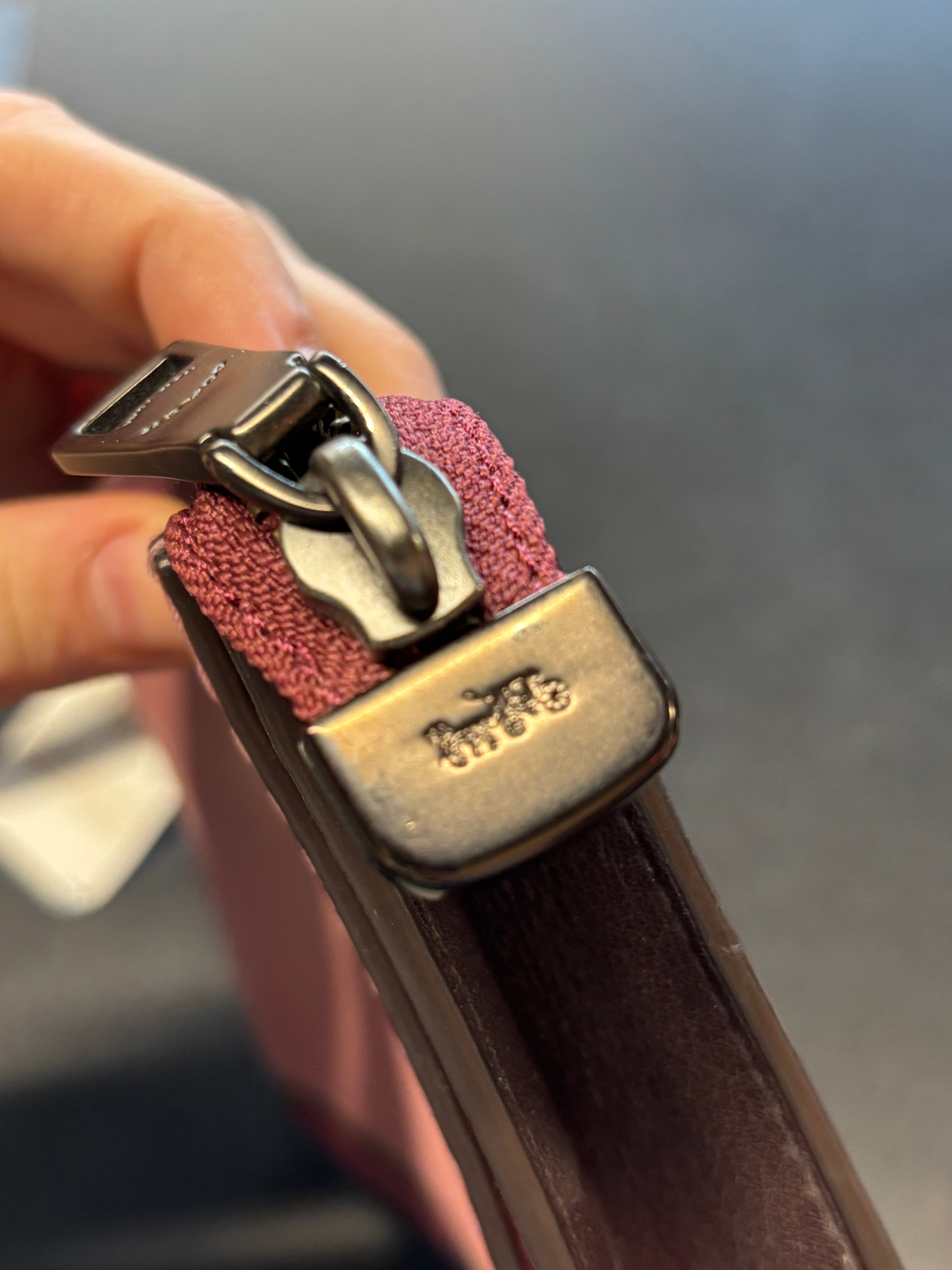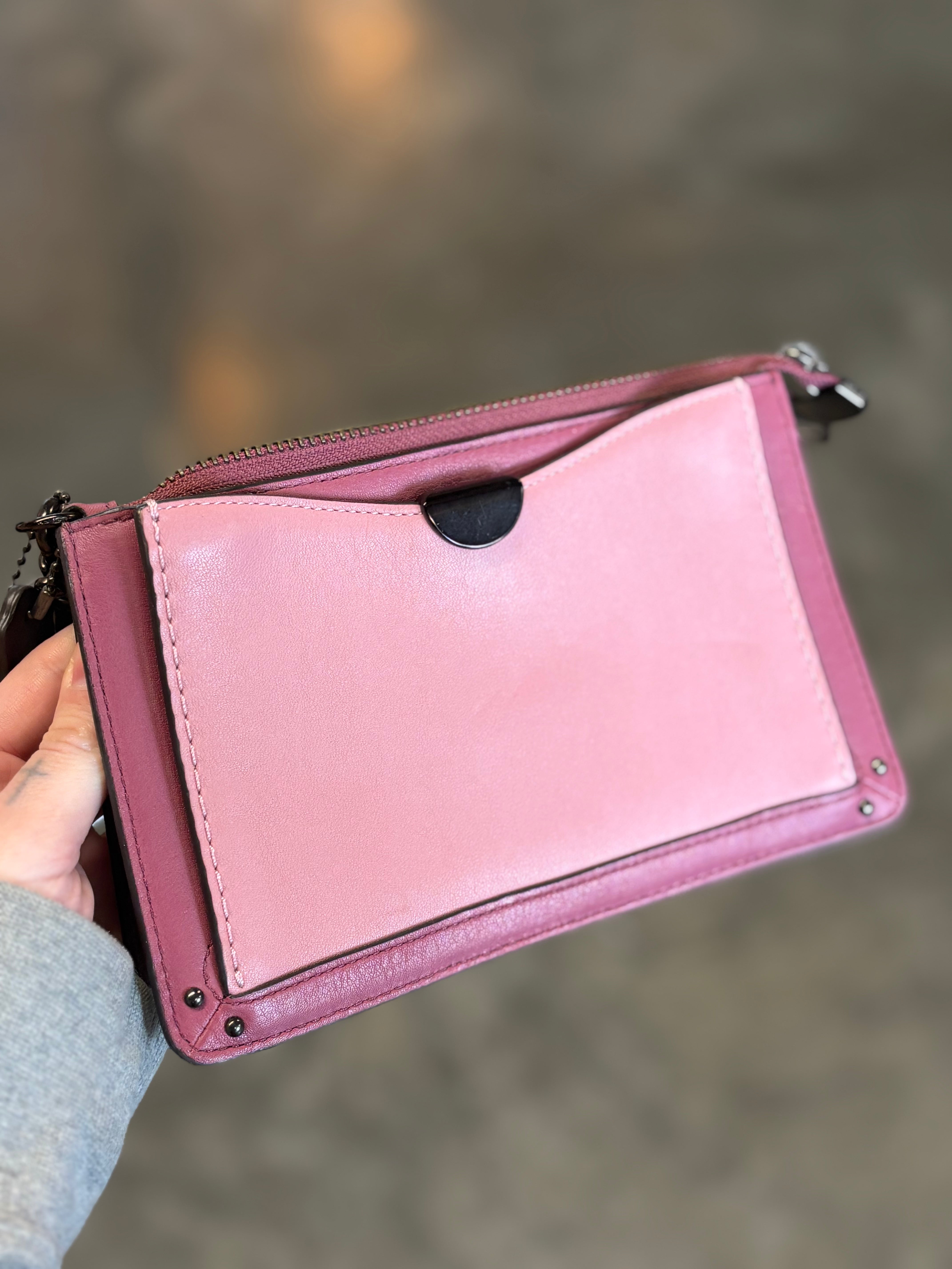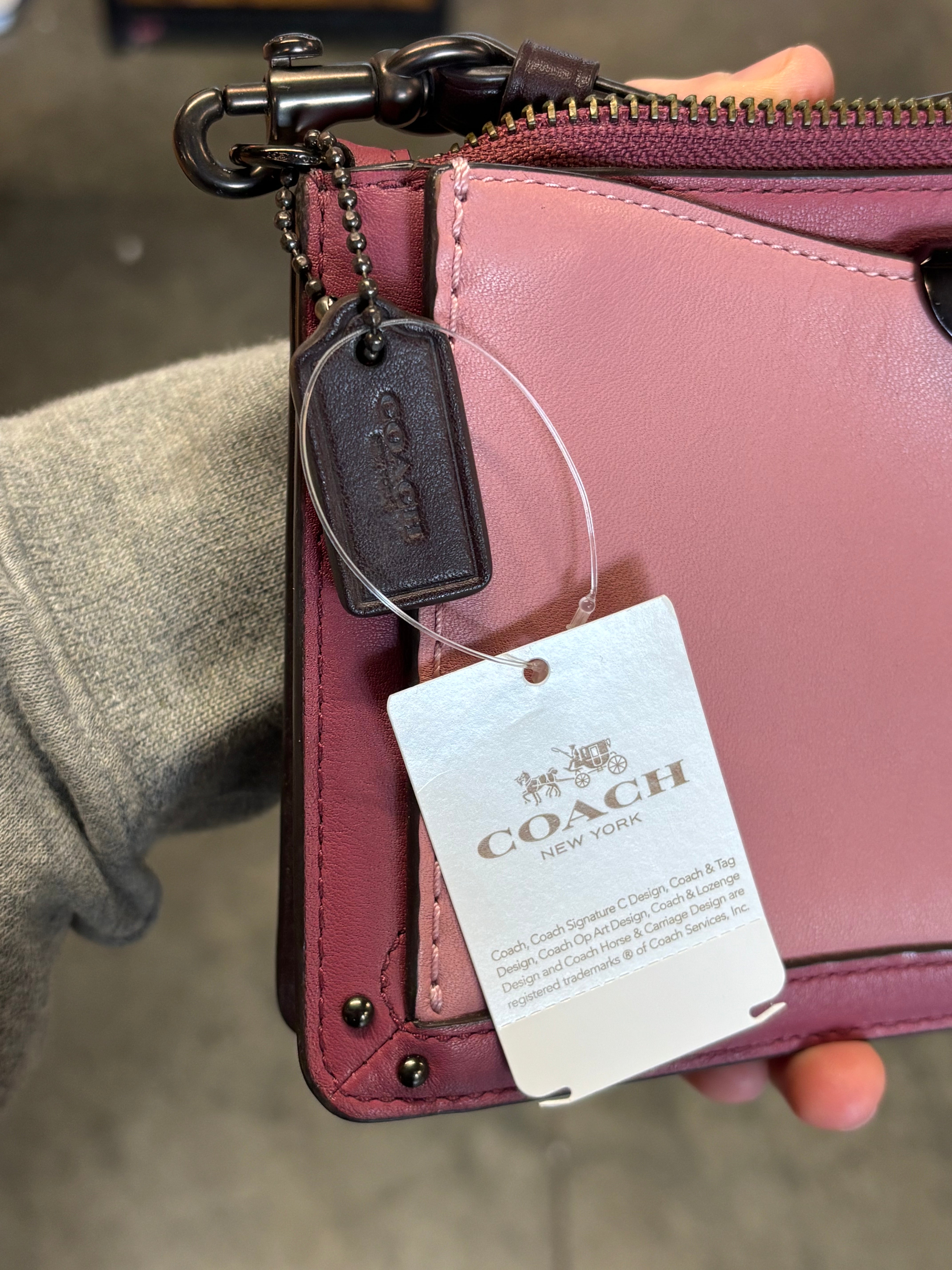 Bright, bold, and incredibly cute — this Coach Colorblock Leather Wristlet in True Pink Multi is the perfect pop of color for everyday essentials. Comes brand new with original Coach tags, featuring gorgeous soft leather and gunmetal hardware.