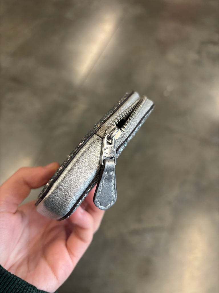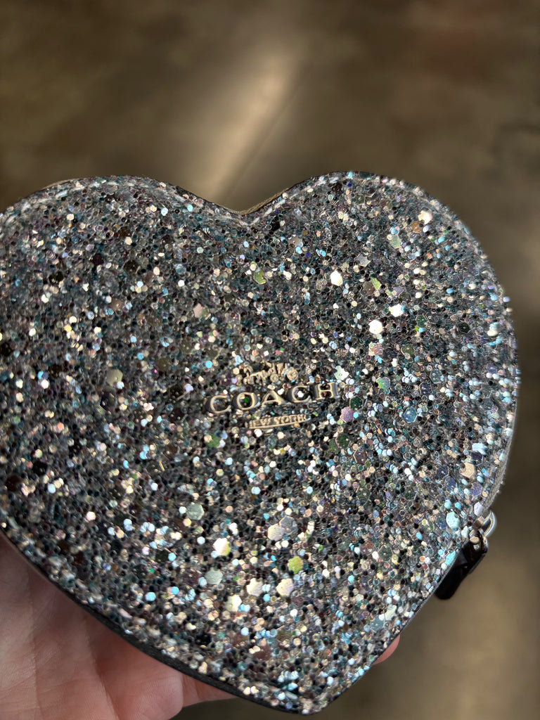 COACH Glitter Heart Coin Purse – Silver Holographic Sparkle – Zip Wallet