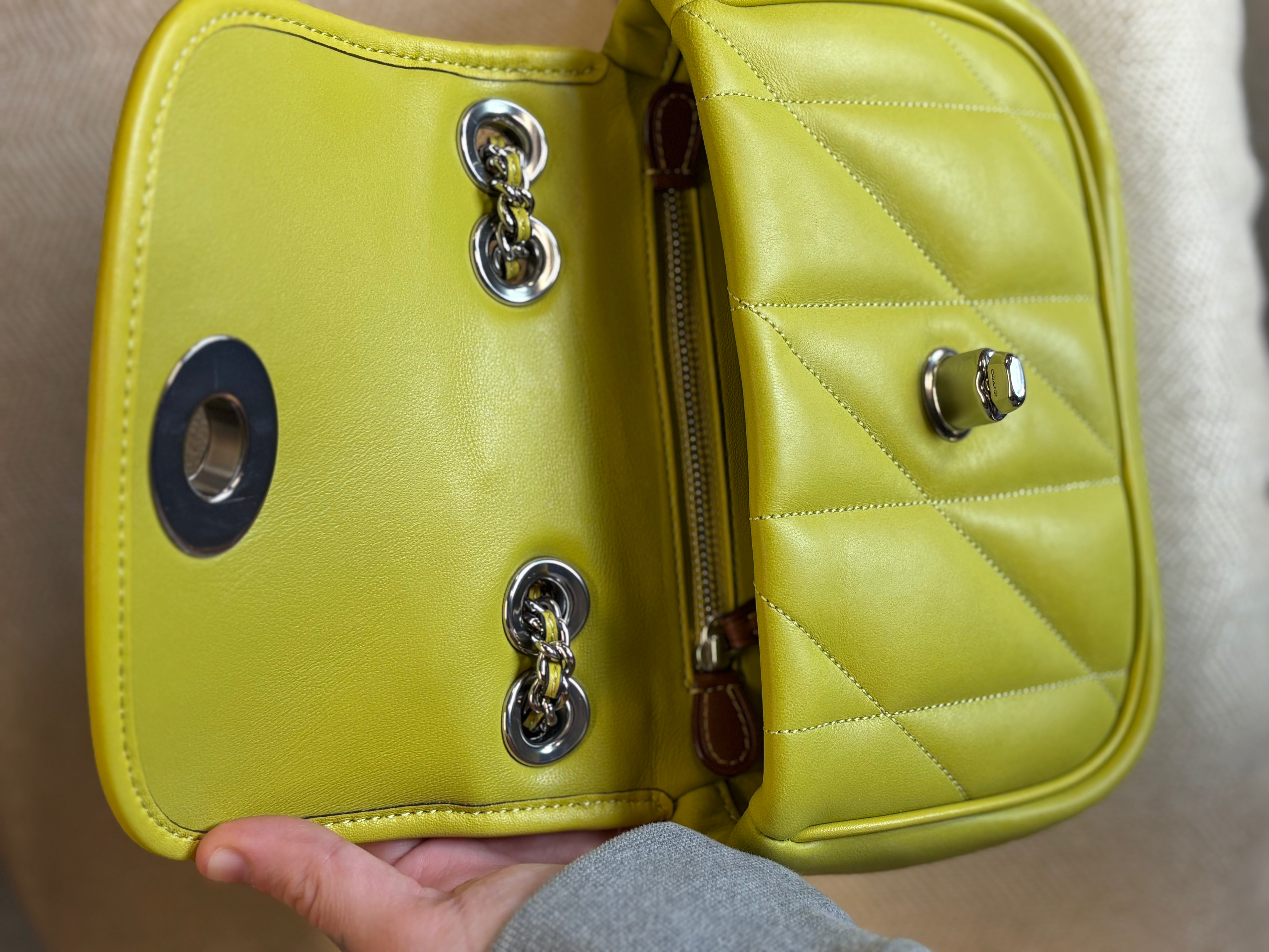 • Quilted glove-tanned leather in a vibrant chartreuse mustard-lime shade