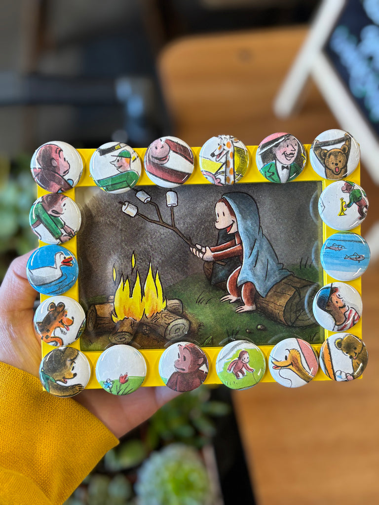 Bring a spark of nostalgia and warmth to your space with this one-of-a-kind handmade picture frame! This piece features a cozy Curious George campfire illustration, surrounded by hand-made buttons crafted from vintage Curious George storybook pages. Each button has been individually pressed, glued, and arranged on a bright yellow wooden frame — giving it a playful, cheerful look that’s perfect for any shelf, nursery, or collector’s nook.