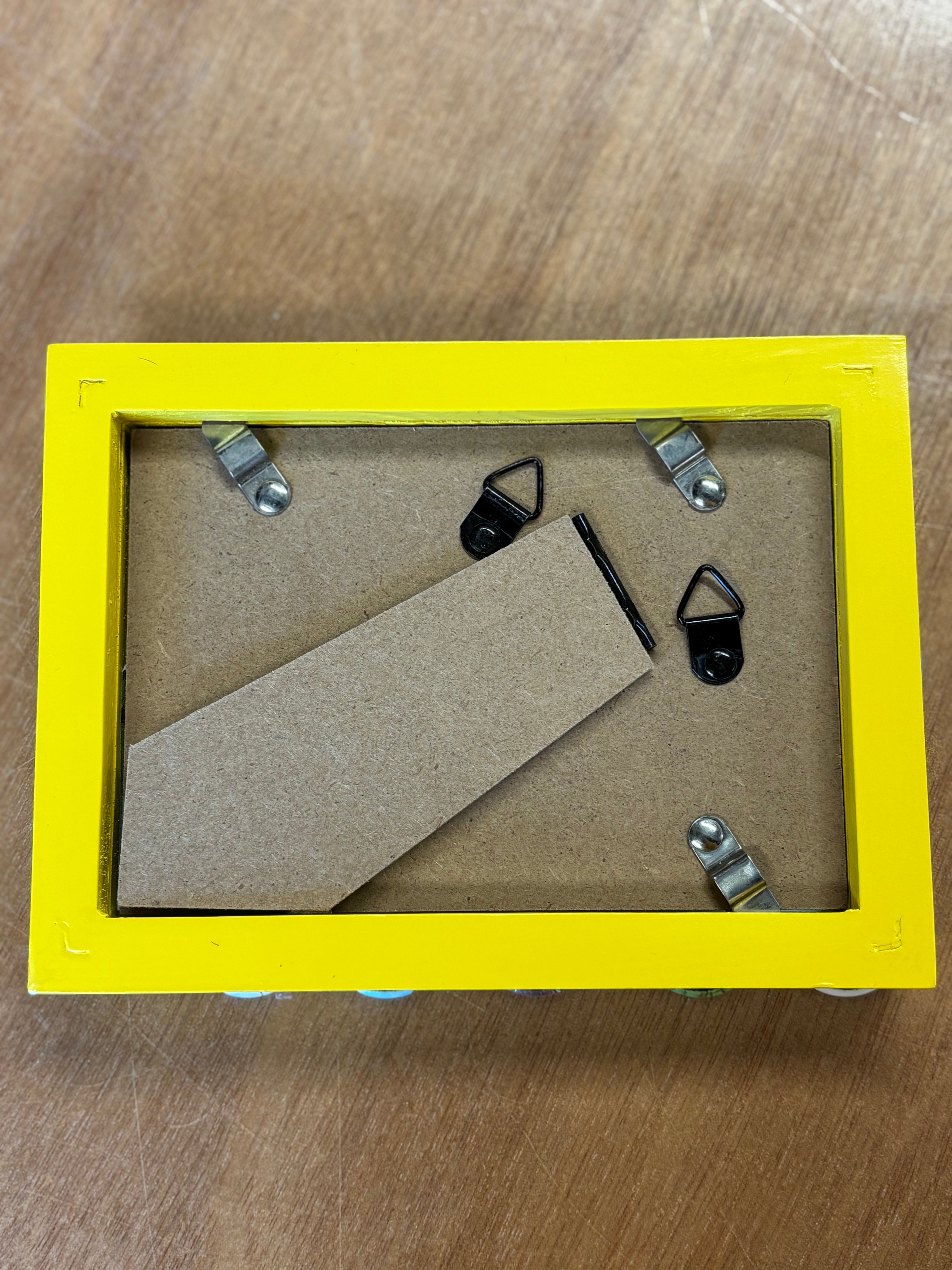 - Materials: Wood frame, glossy hand-pressed buttons, glue sealant