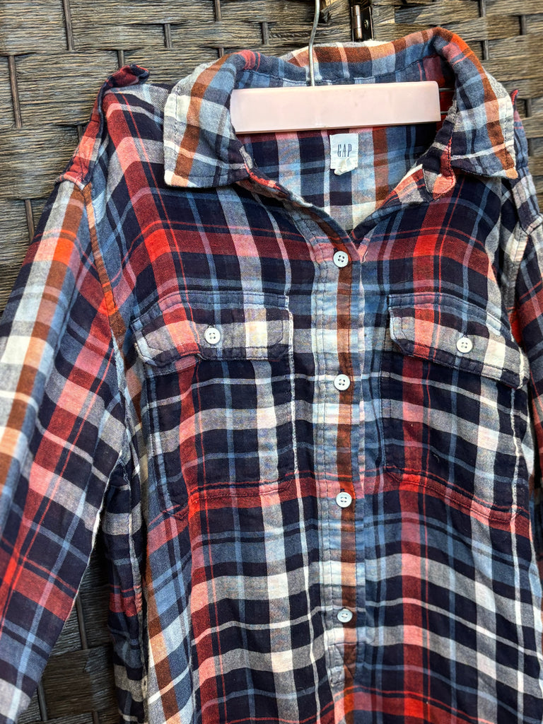 Cozy meets classic in this GAP plaid flannel shirtdress featuring soft cotton fabric in rich red, navy, and cream tones. Designed with a relaxed fit, full button front, and dual chest pockets — this piece works perfectly as a standalone dress or layered open as a long flannel jacket. A fall staple that combines comfort and effortless style.