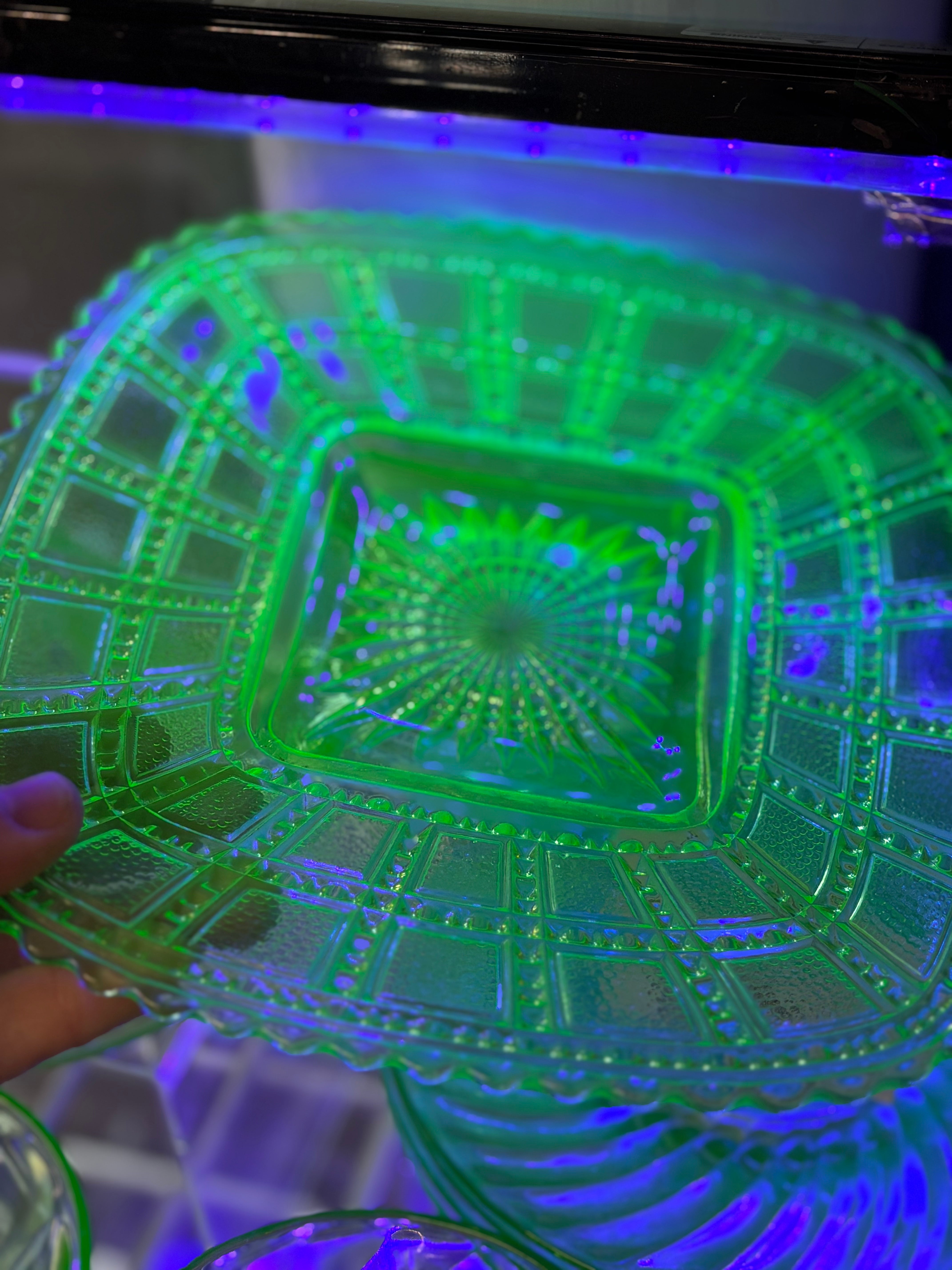 This stunning 8-inch uranium glass plate features a bold checkered paneled pattern with tiny raised beading and a radiant pressed starburst center. Under UV/blacklight it glows an intense neon green — a true showstopper for collectors of uranium, EAPG, or depression-era glass.