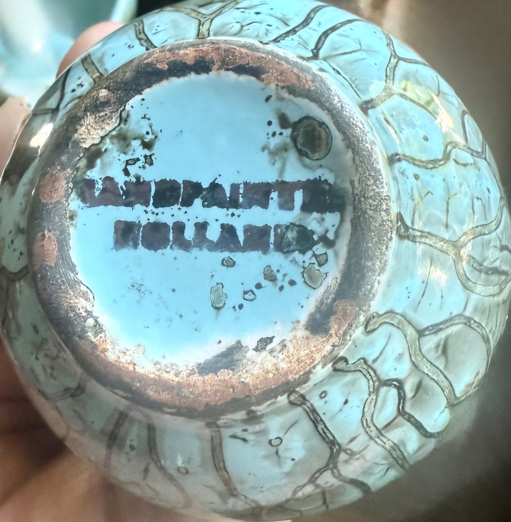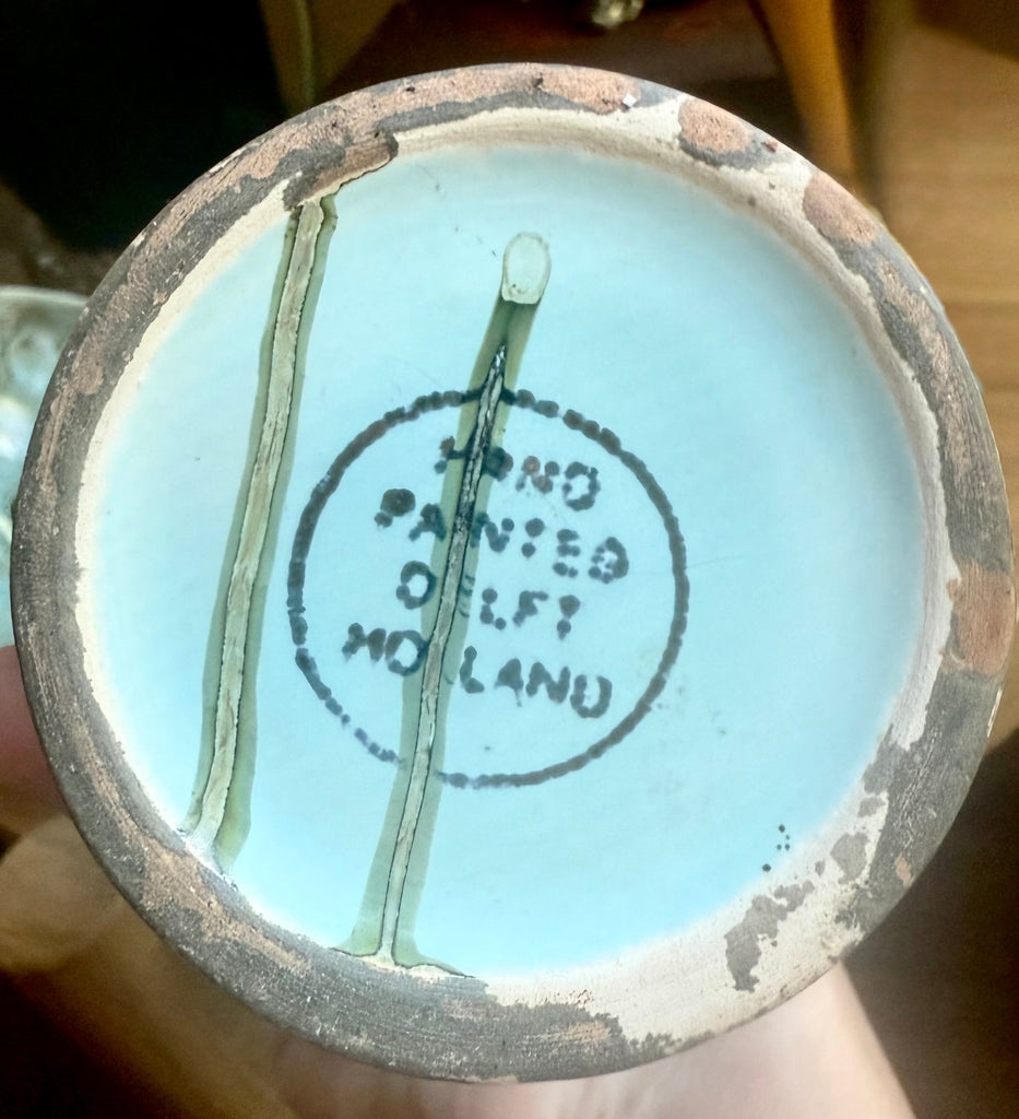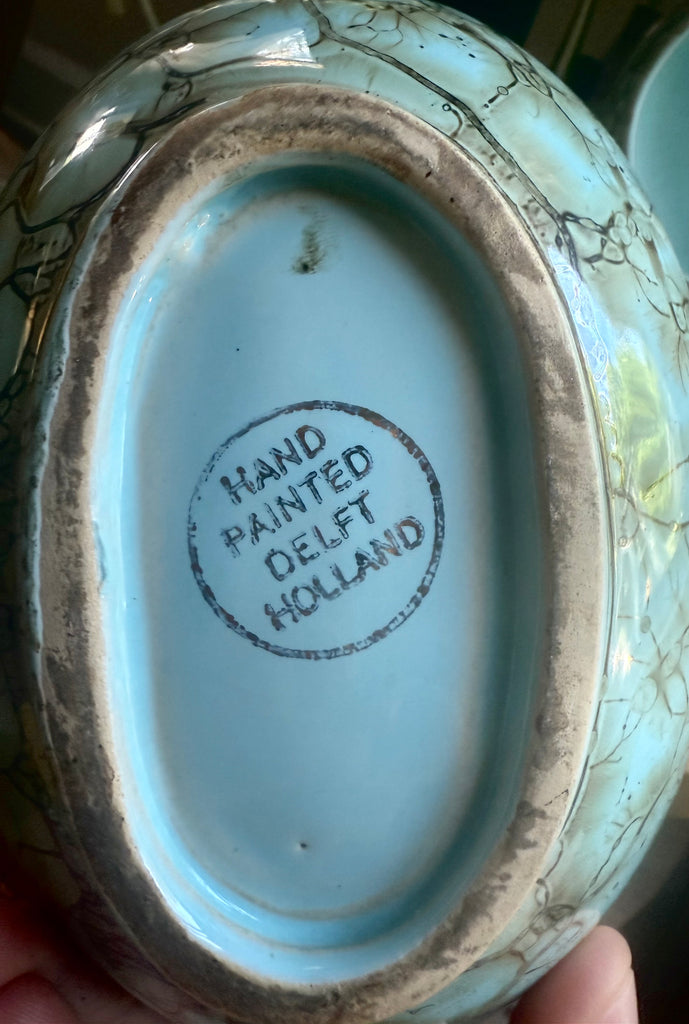 Bring timeless Dutch craftsmanship into your home with this striking vintage Delft Holland set. Each piece is hand-painted in a distinctive aqua crackle glaze with dark veining, creating a textured and artistic finish.