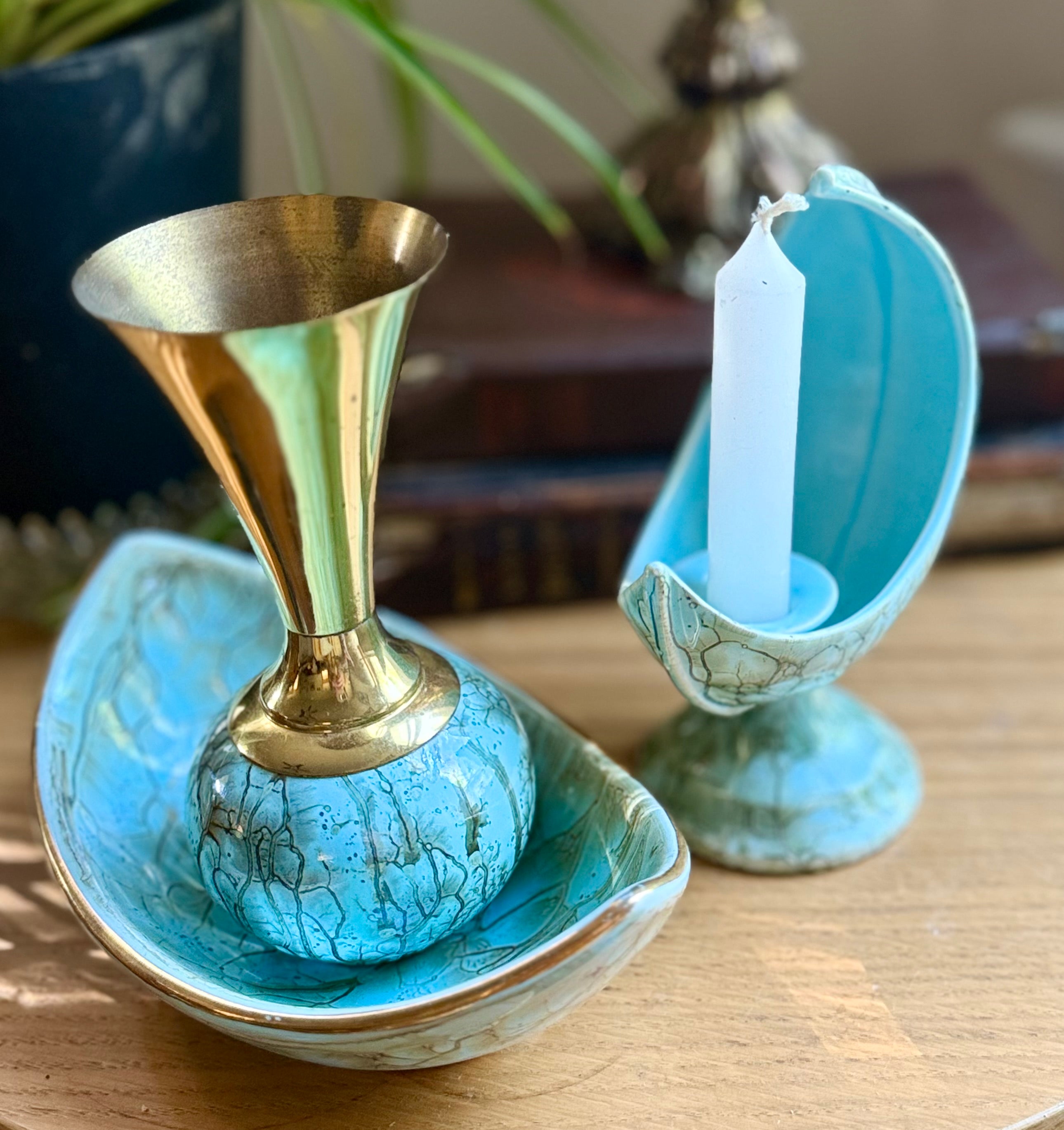 - Material: Hand-painted ceramic with brass accent on vase