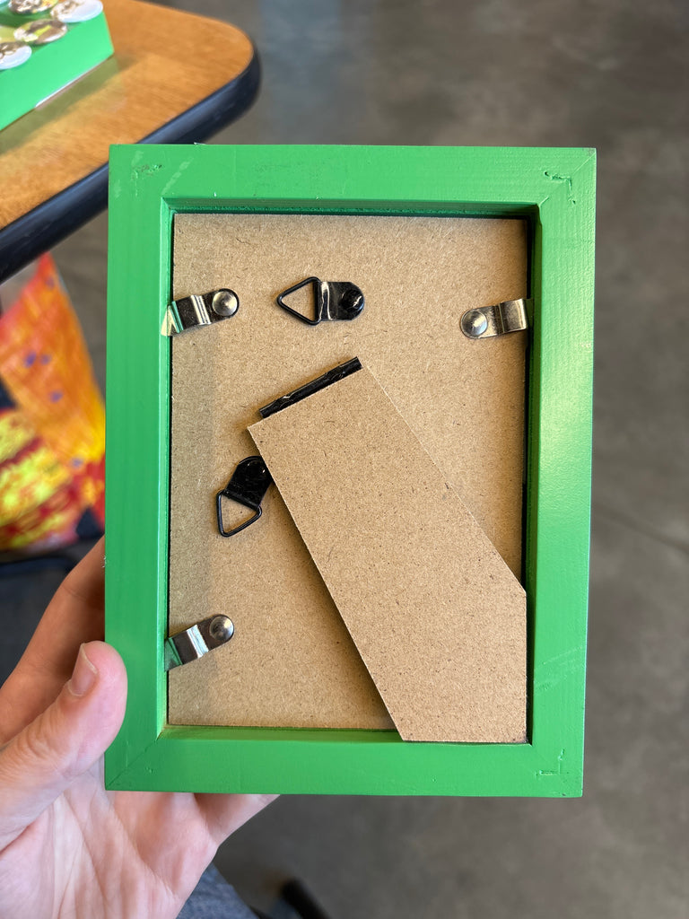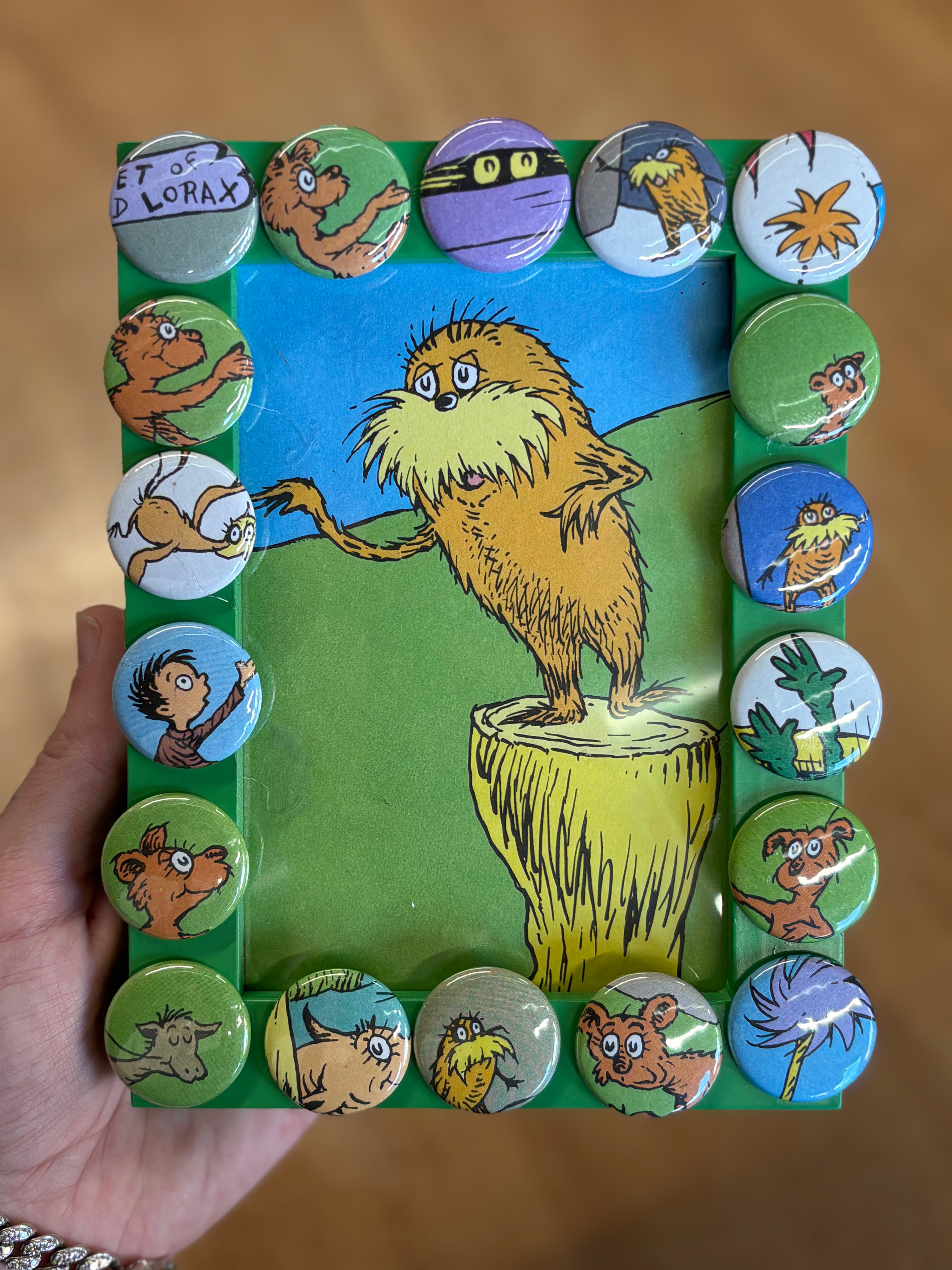 Celebrate the timeless message of The Lorax with this unique, handmade frame. Each button along the border is crafted with a button maker, featuring colorful illustrations of Dr. Seuss’s classic characters — from the Lorax himself to the Brown Bar-ba-loots, Swomee-Swans, and Truffula trees. Every button is carefully placed and securely glued around the bright green frame for a bold, eye-catching look.