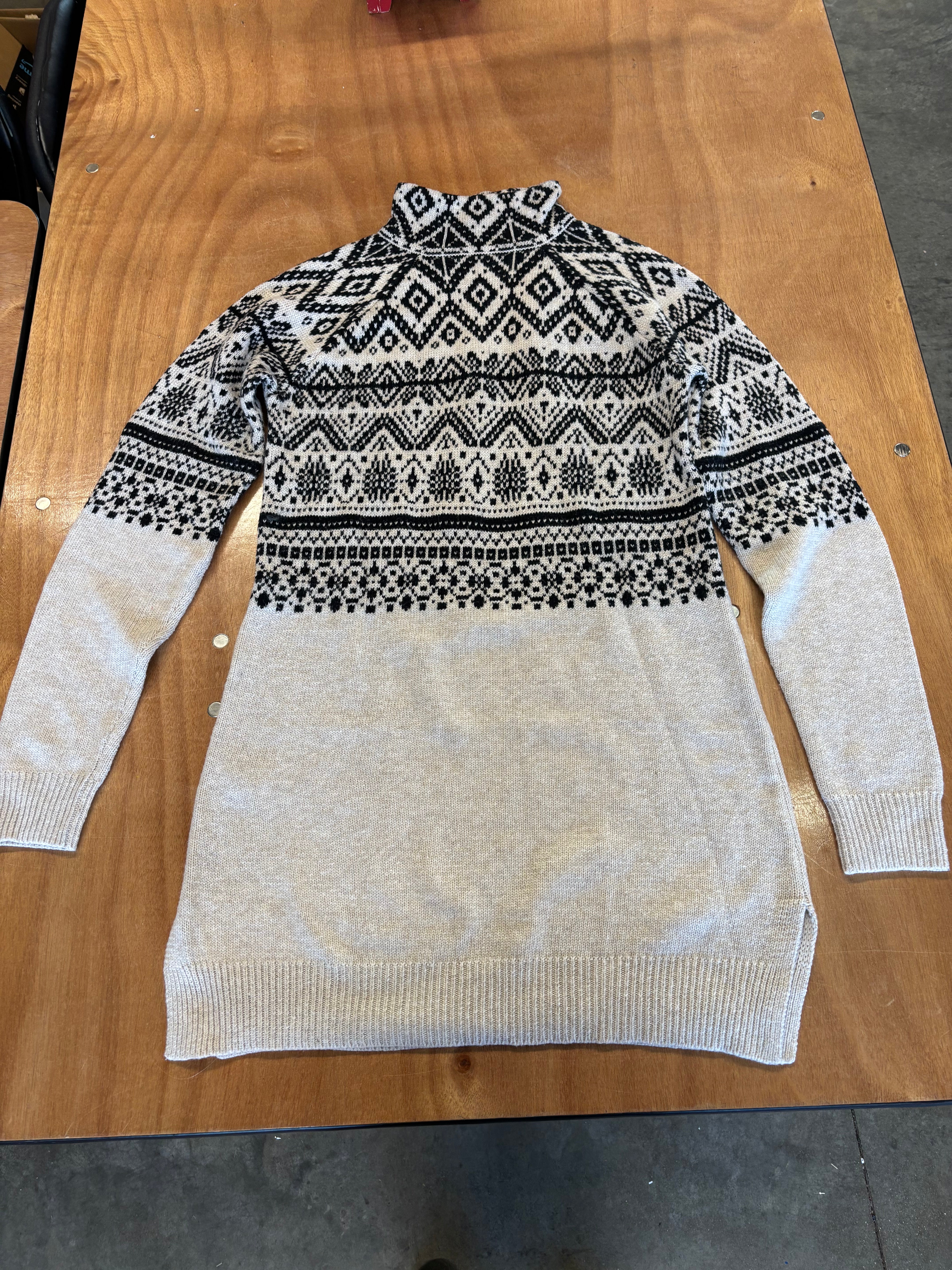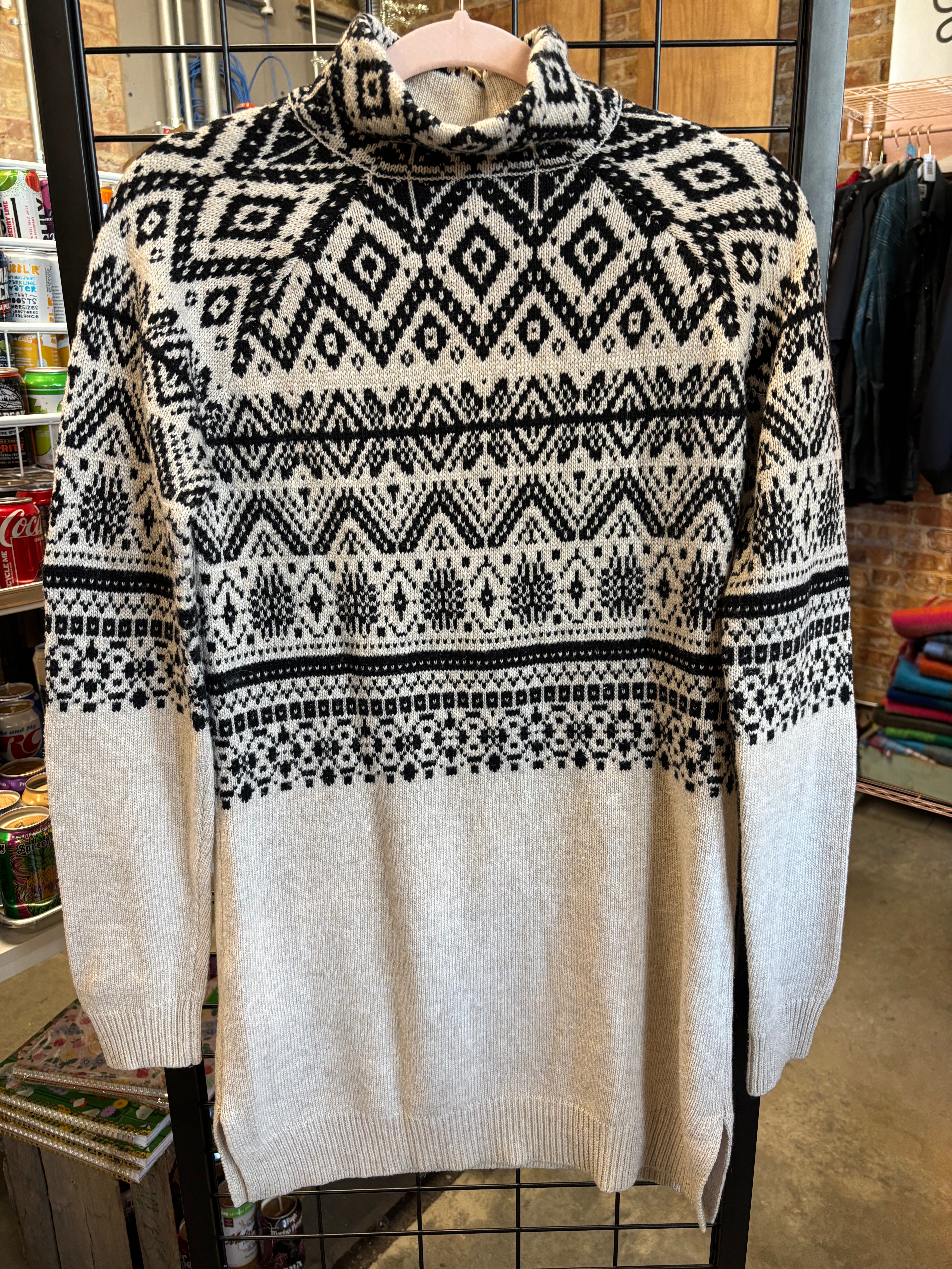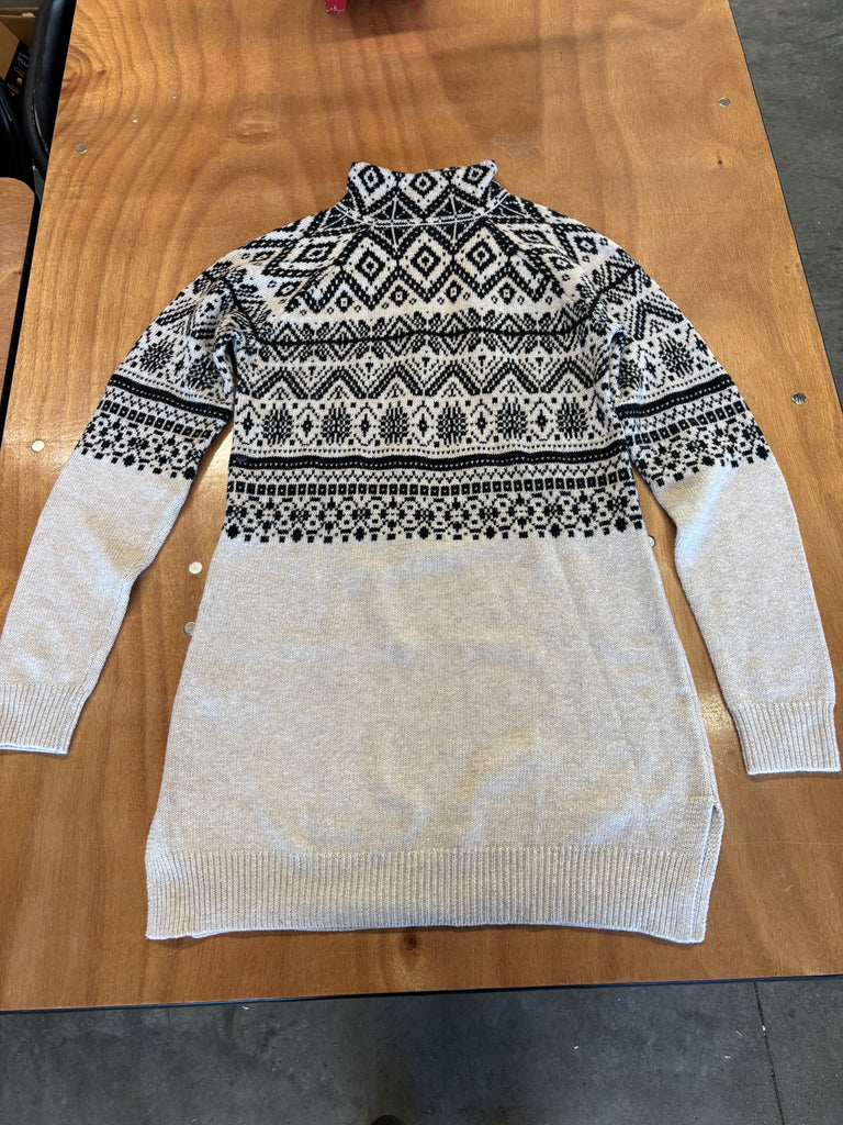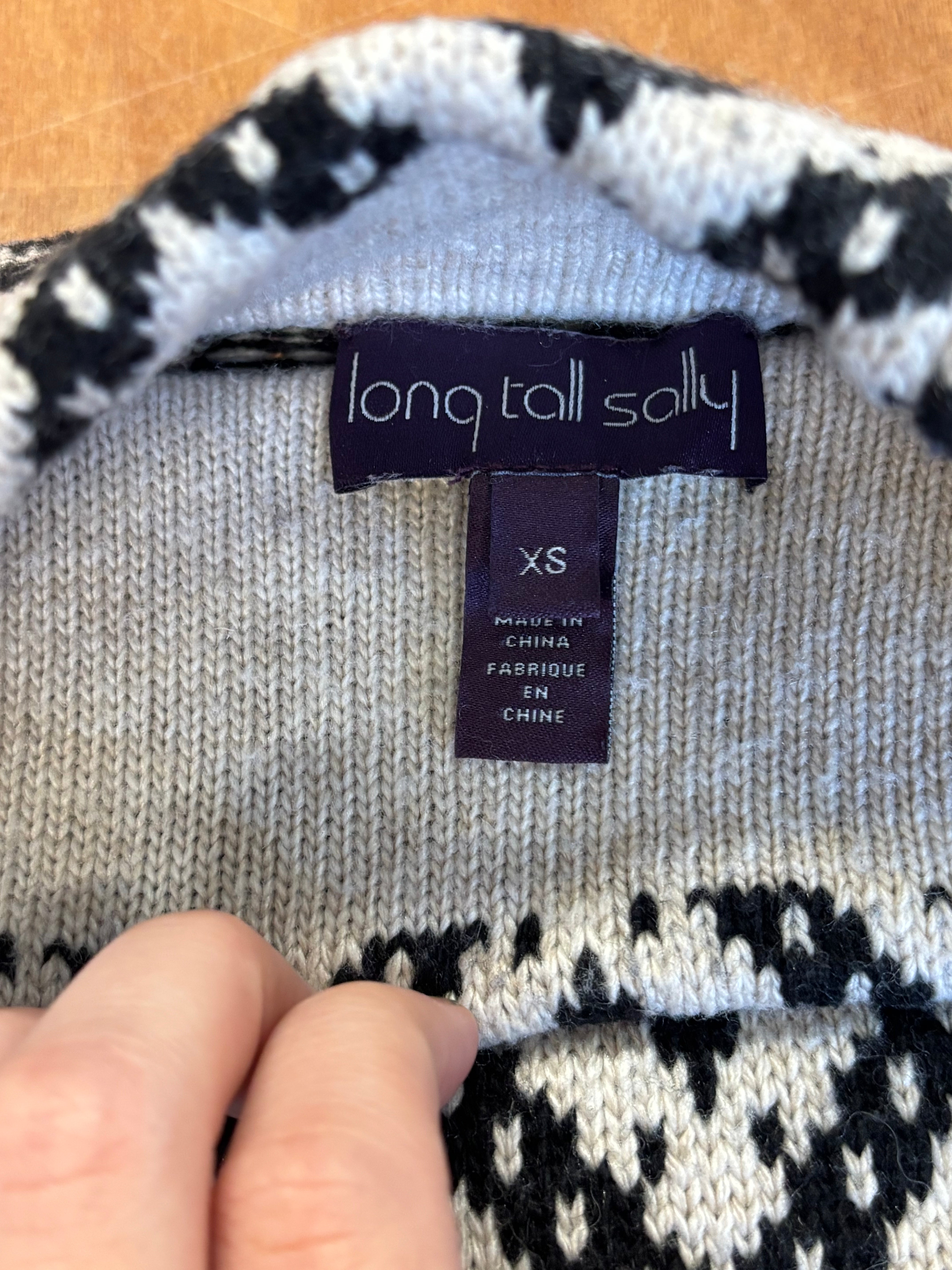 Cozy up in this Long Tall Sally Fair Isle sweater — the perfect mix of timeless Nordic style and modern comfort. Featuring a black-and-cream geometric knit pattern, soft medium-weight yarn, and a slouchy cowl neck for extra warmth. Designed for tall proportions but flattering on most frames.