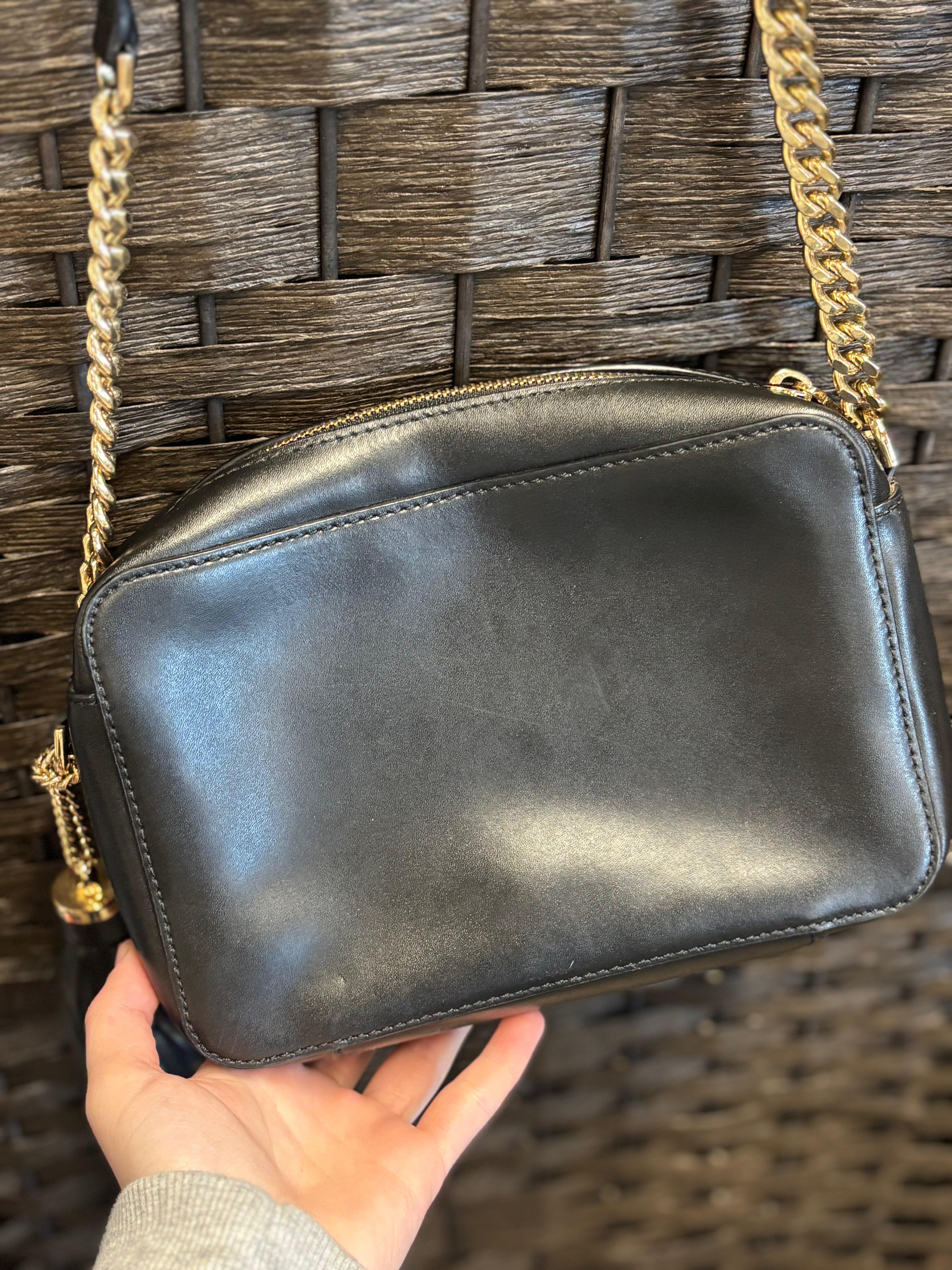 Details include a leather-and-chain adjustable strap, logo zipper pulls, gold Michael Kors logo plate, and a leather tassel charm on the side.
