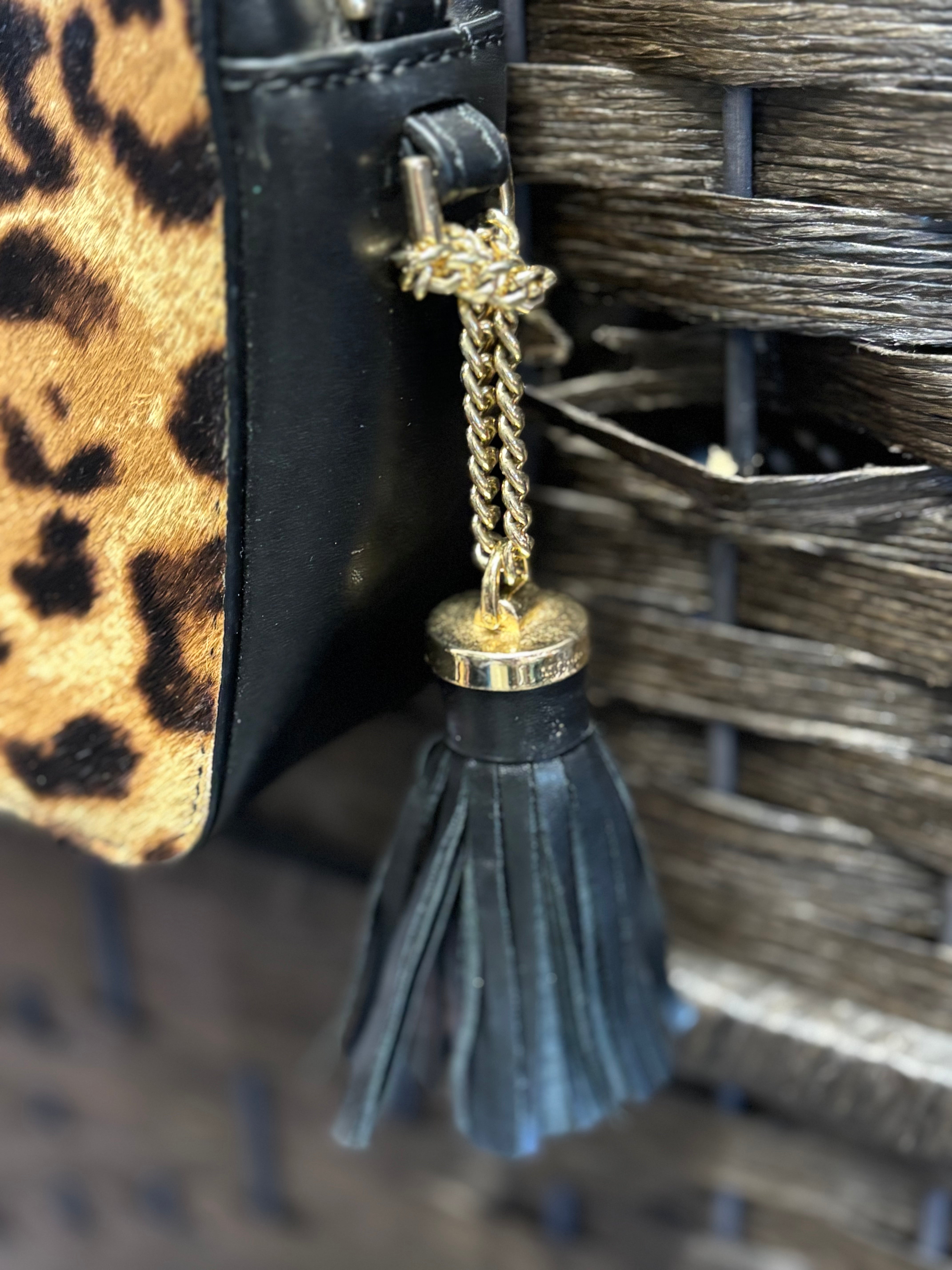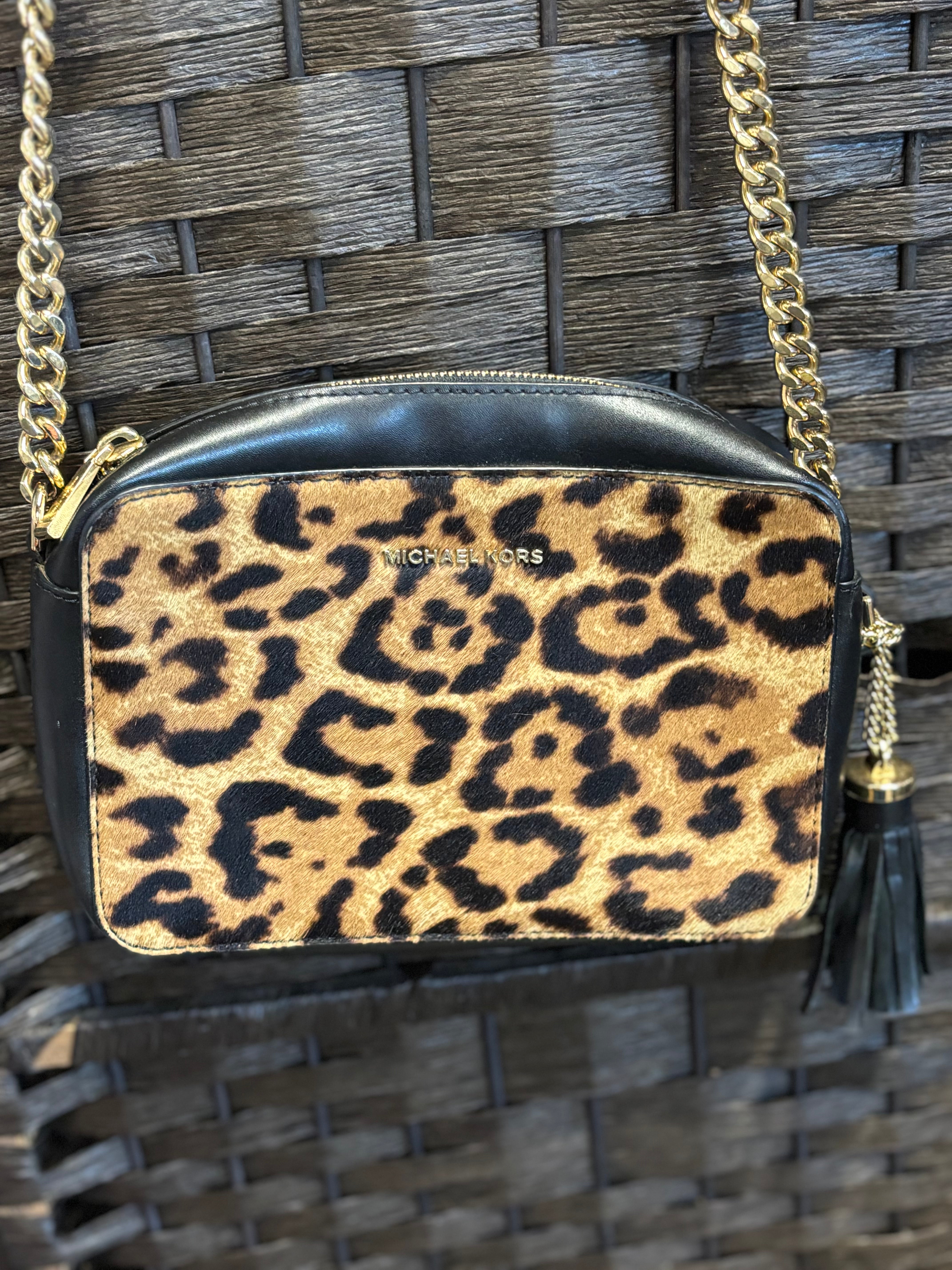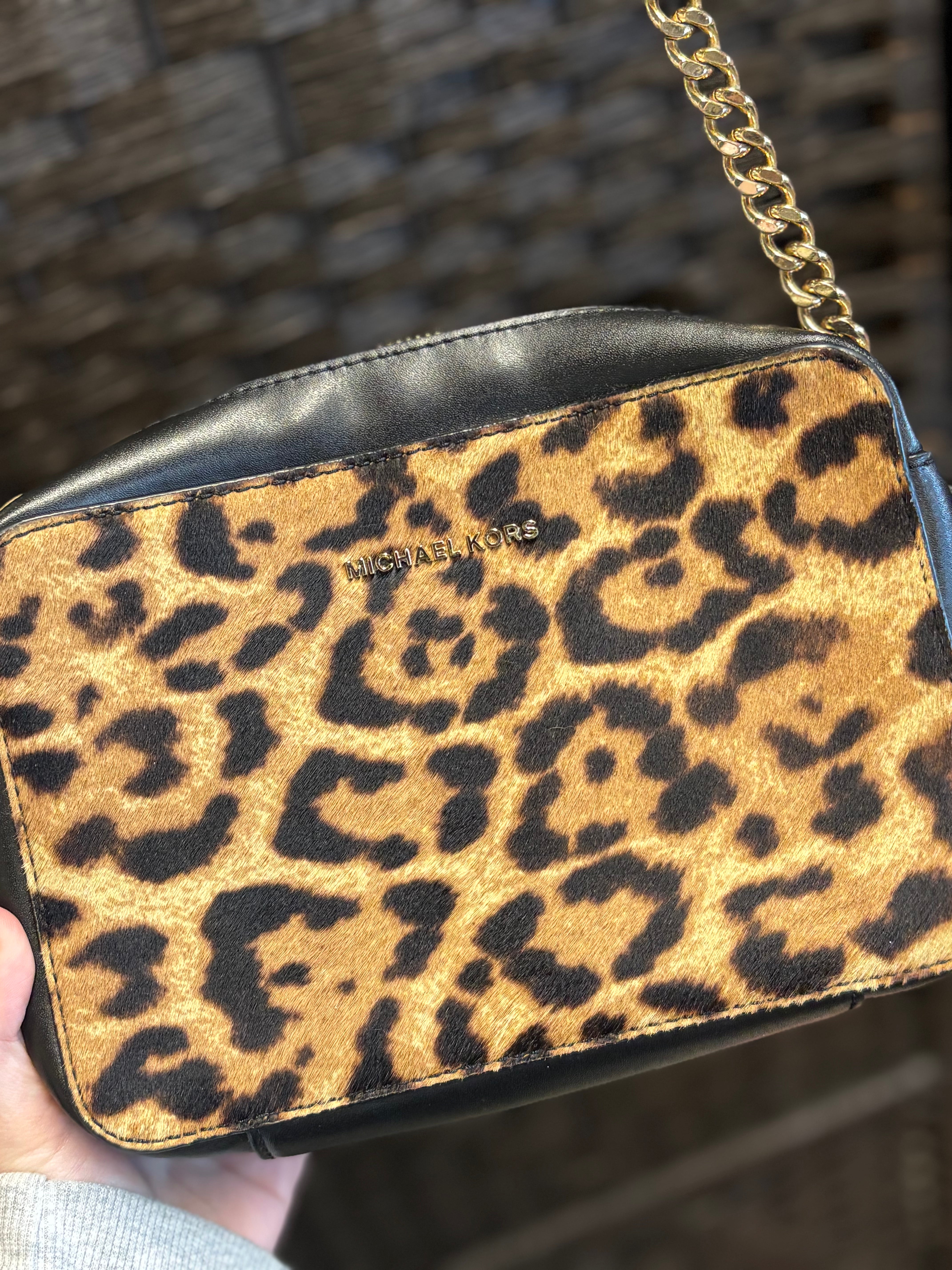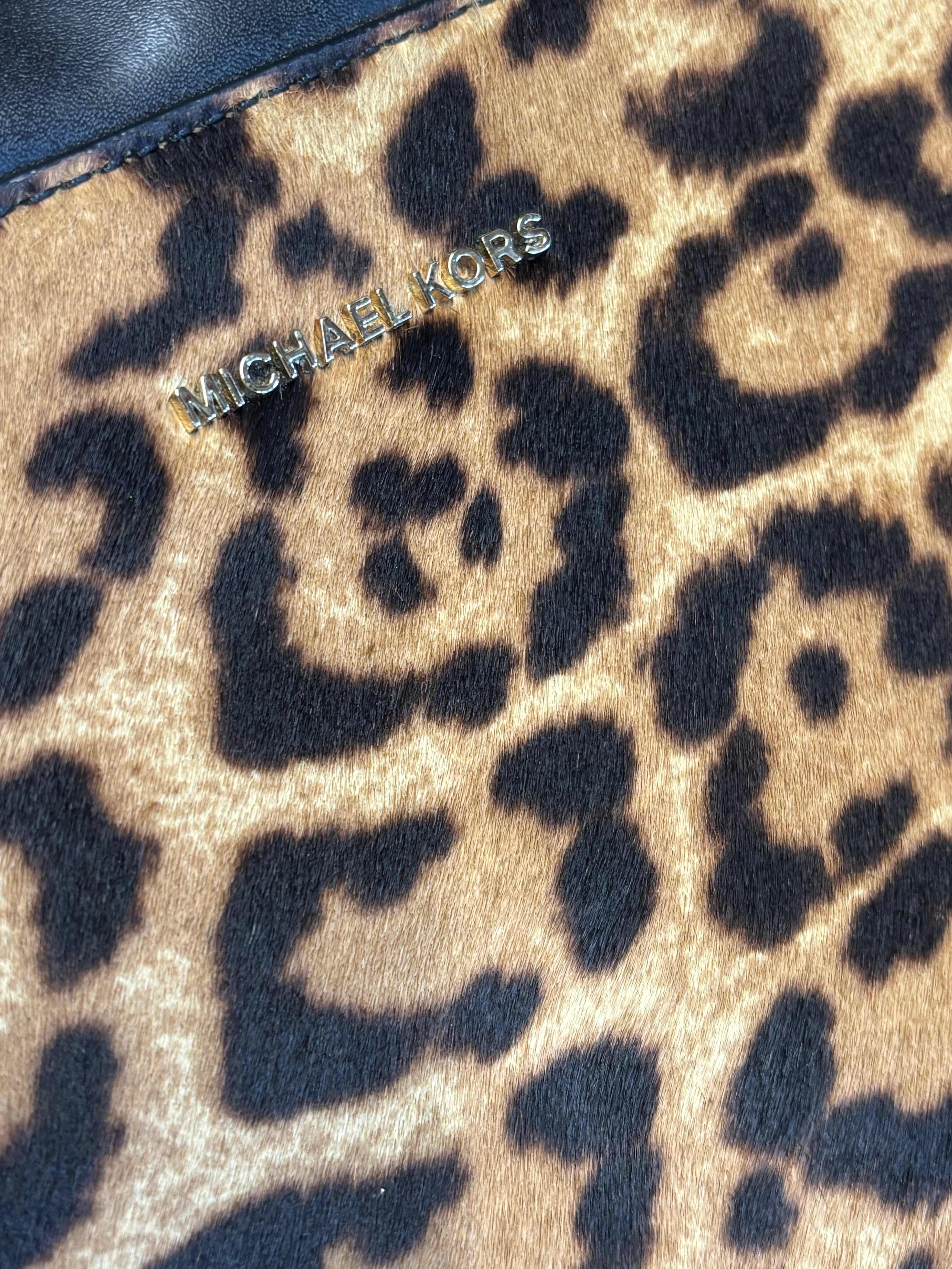 Gorgeous Michael Kors crossbody bag featuring a luxe leopard haircalf front panel with smooth black leather trim and gold-tone hardware.