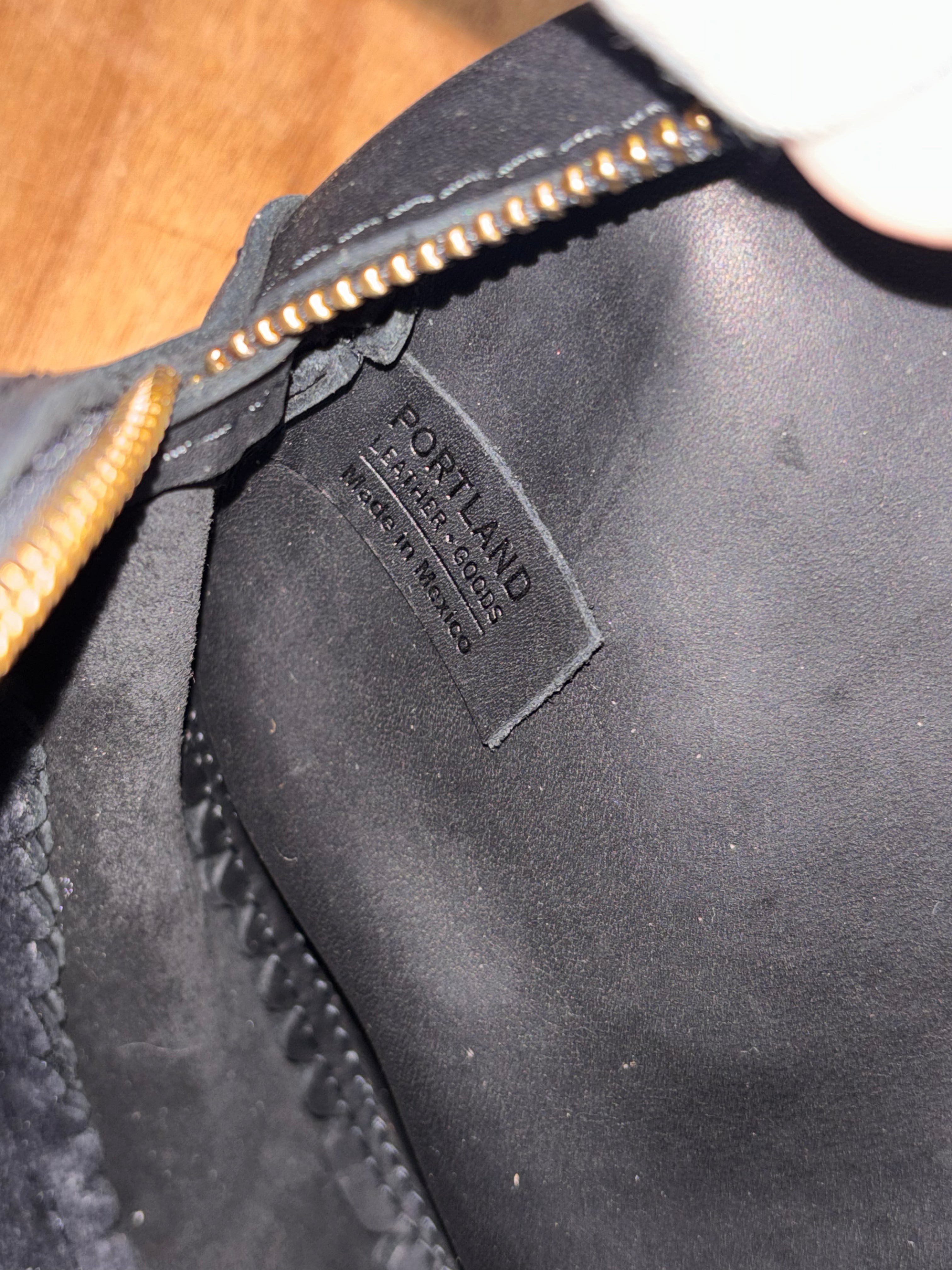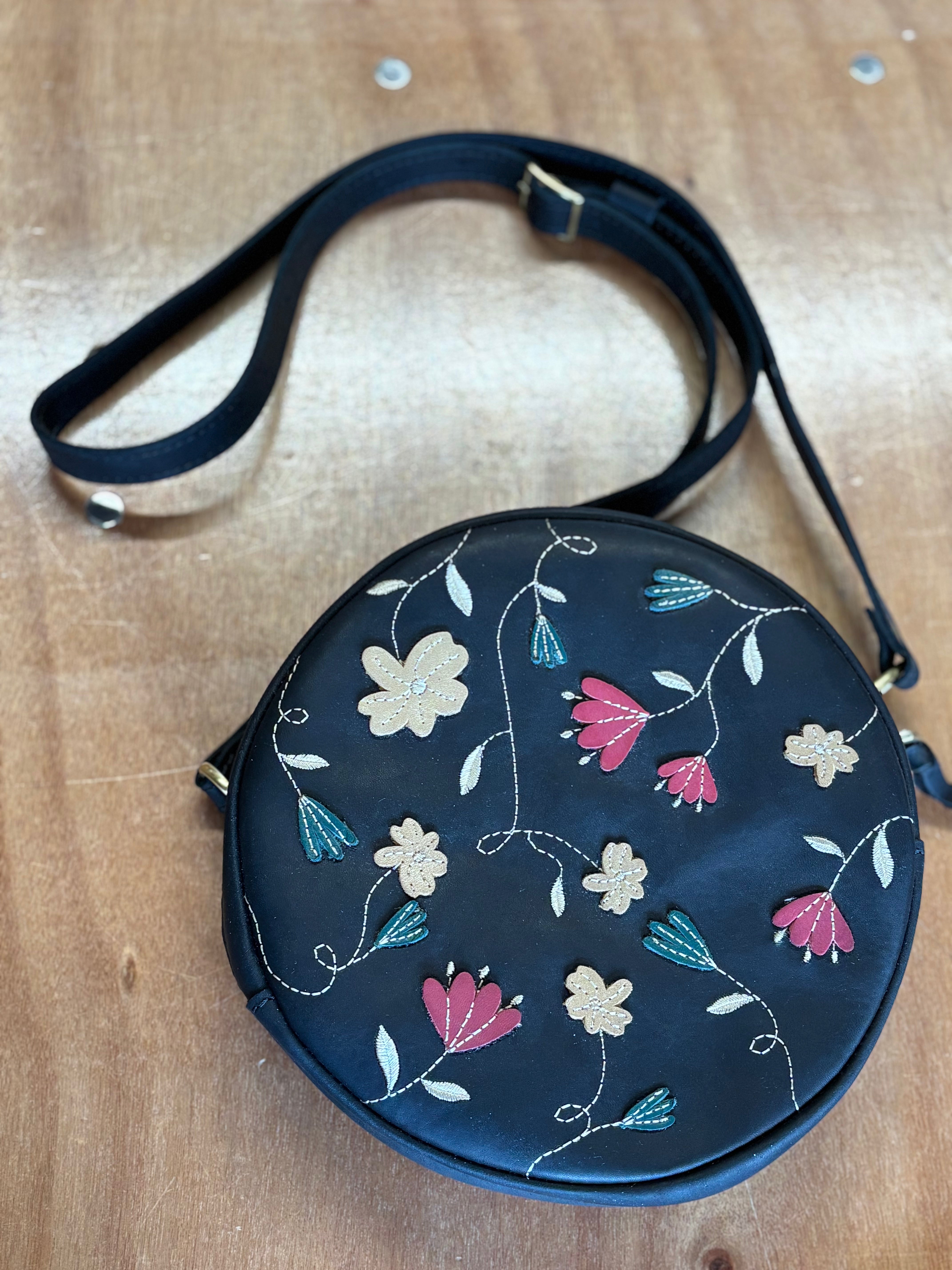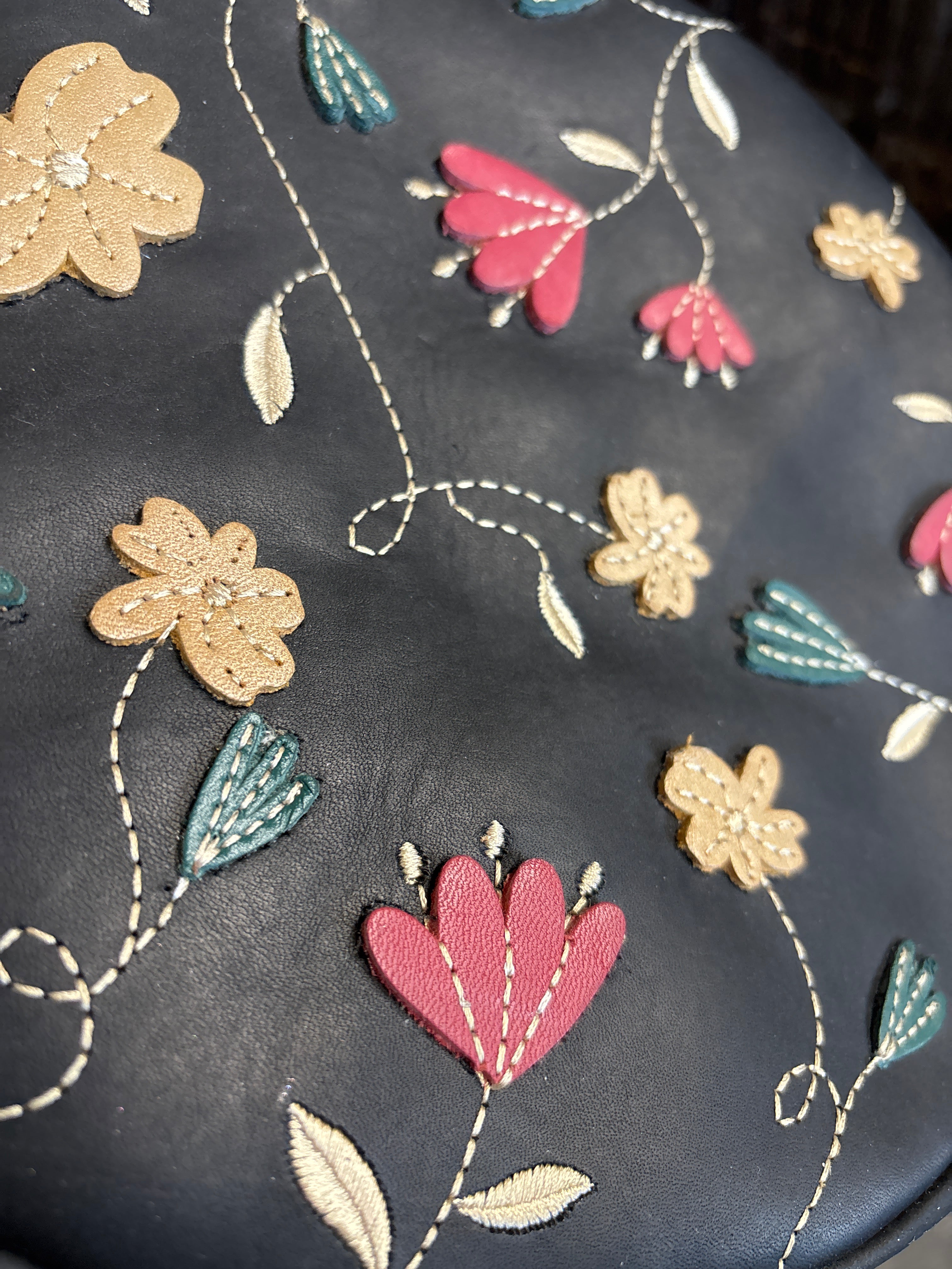 A gorgeous Portland Leather Goods round crossbody bag crafted from full-grain leather and decorated with beautiful embroidered + appliqué florals. PLG pieces last forever and develop a soft, rich patina — this one already has that perfect lived-in look while staying structurally excellent.