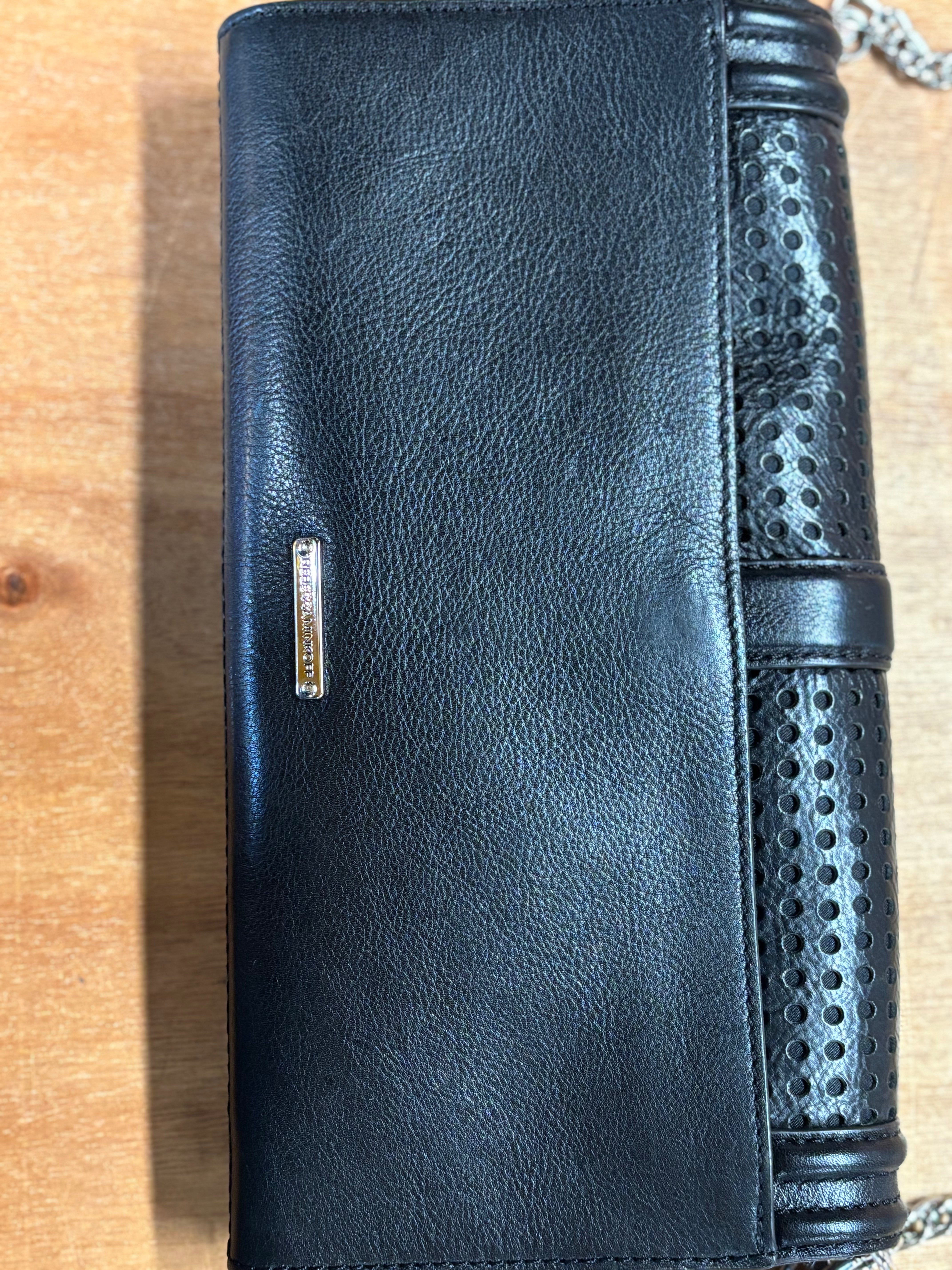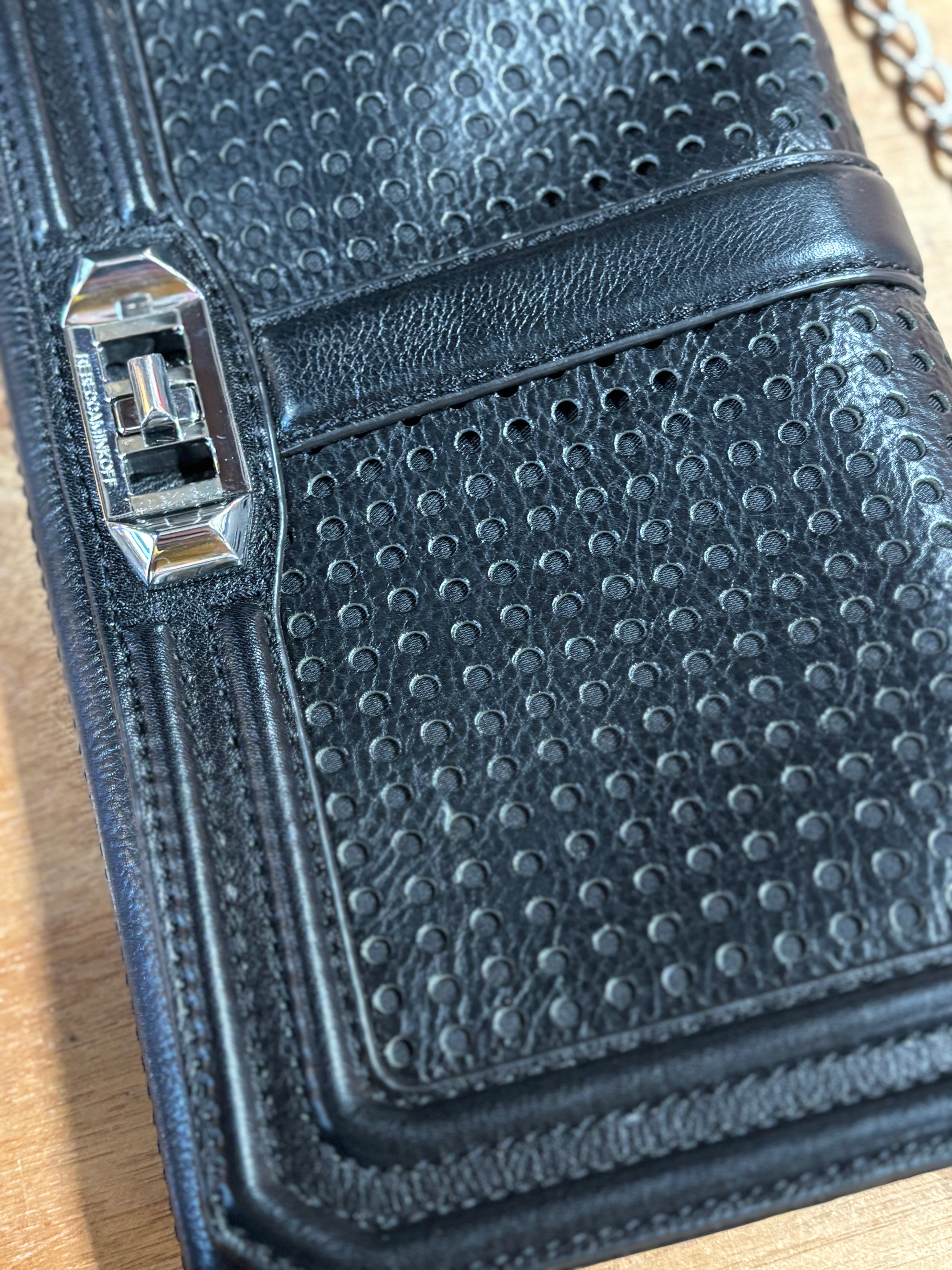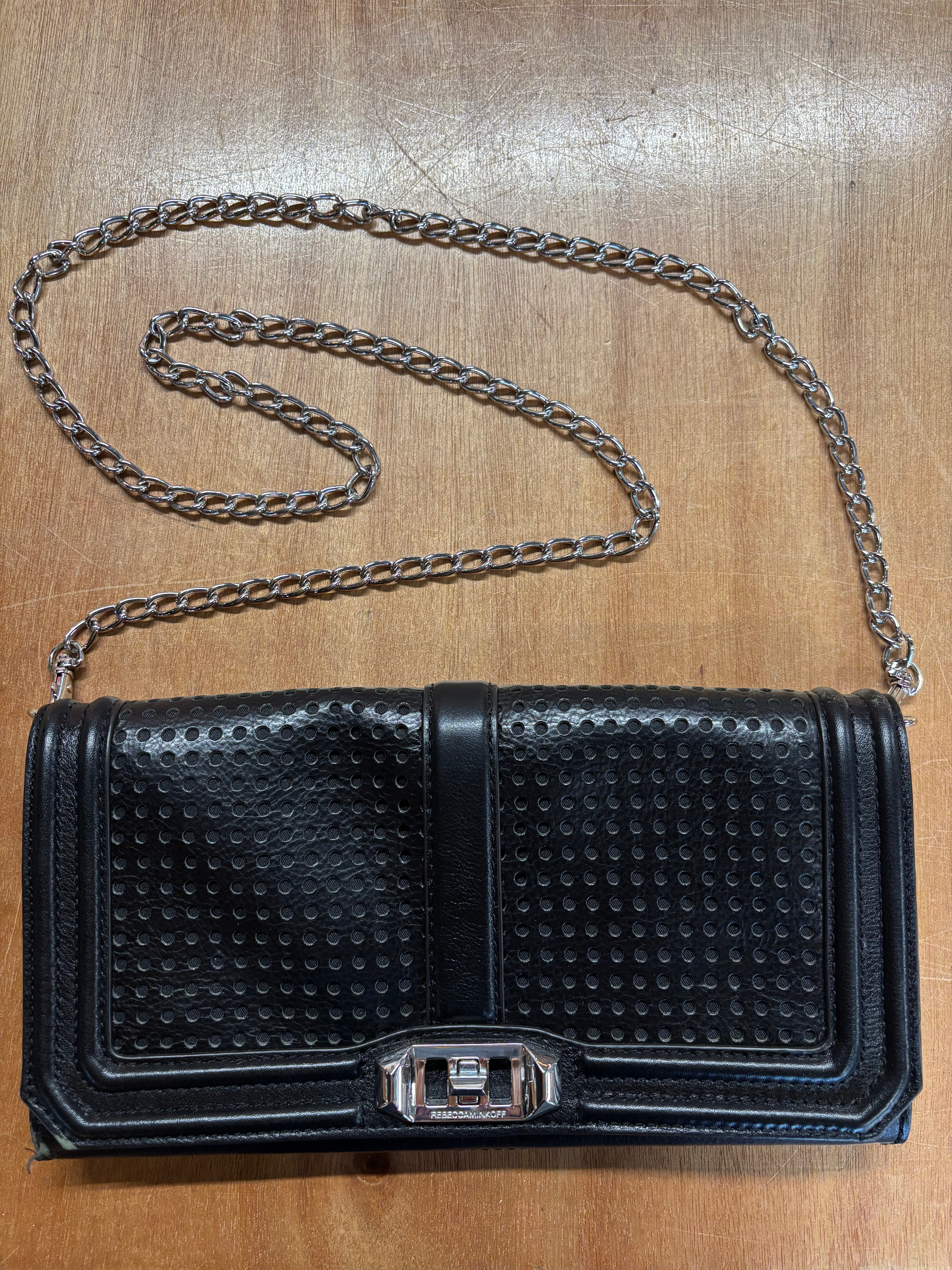 Sleek and modern Rebecca Minkoff “Love” crossbody in genuine black perforated leather with silver hardware.