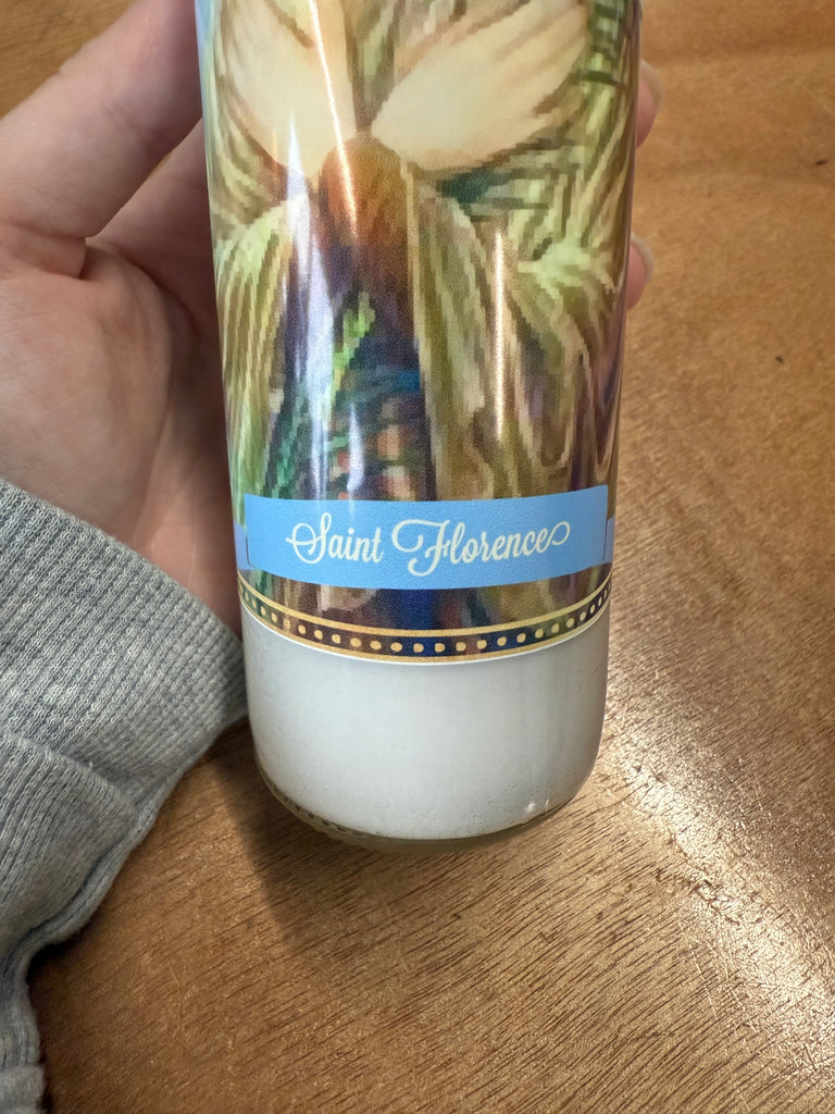 Honor the spirit of creativity and otherworldly beauty with this Saint Florence devotional candle — a luminous tribute to the ethereal muse herself. Featuring a detailed illustration with soft halos, angelic tones, and a floral motif, this candle channels art, grace, and inner power.