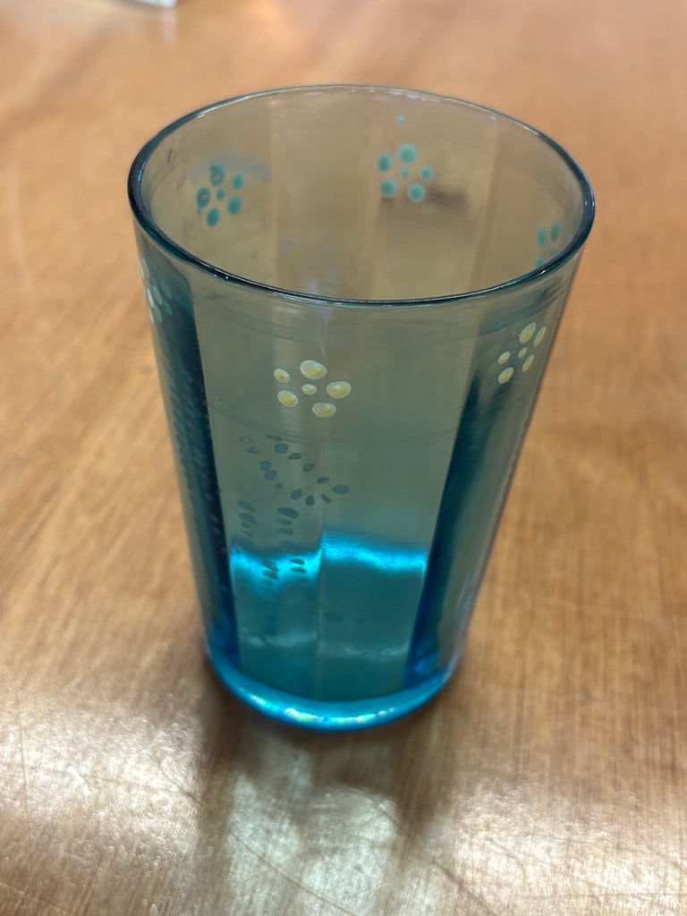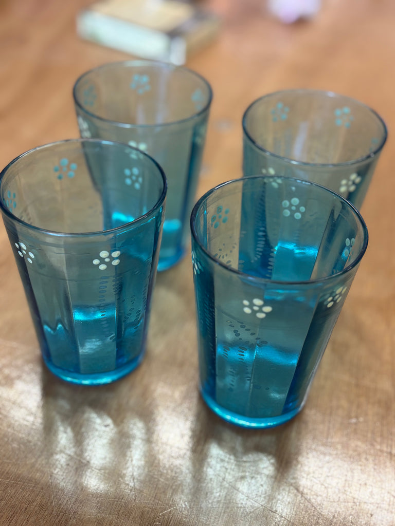 This charming set of four vintage blue glass tumblers adds a cheerful pop of color to any kitchen or dining table. Each glass features a delicate white floral dot pattern and vertical paneled sides that catch the light beautifully.