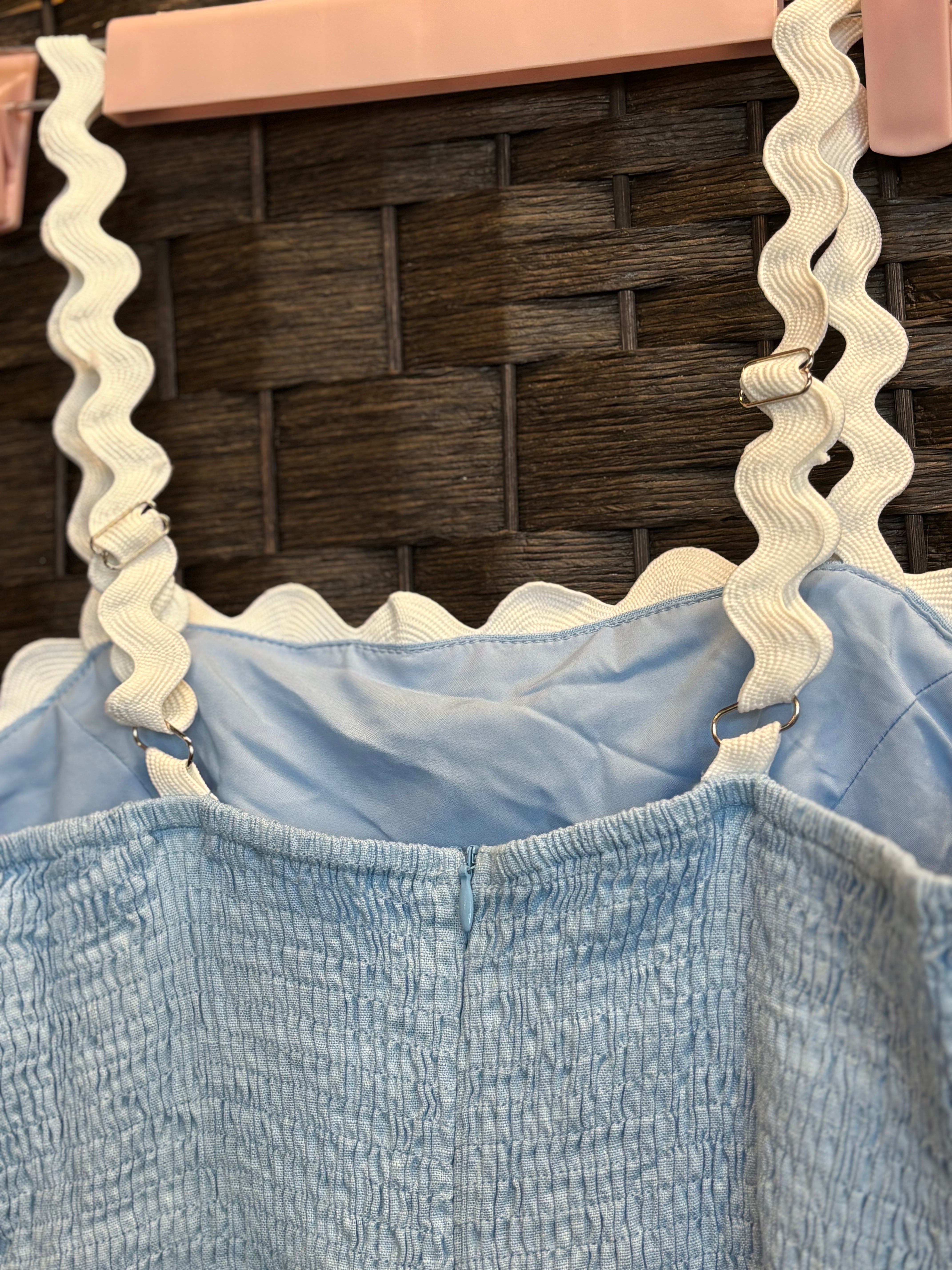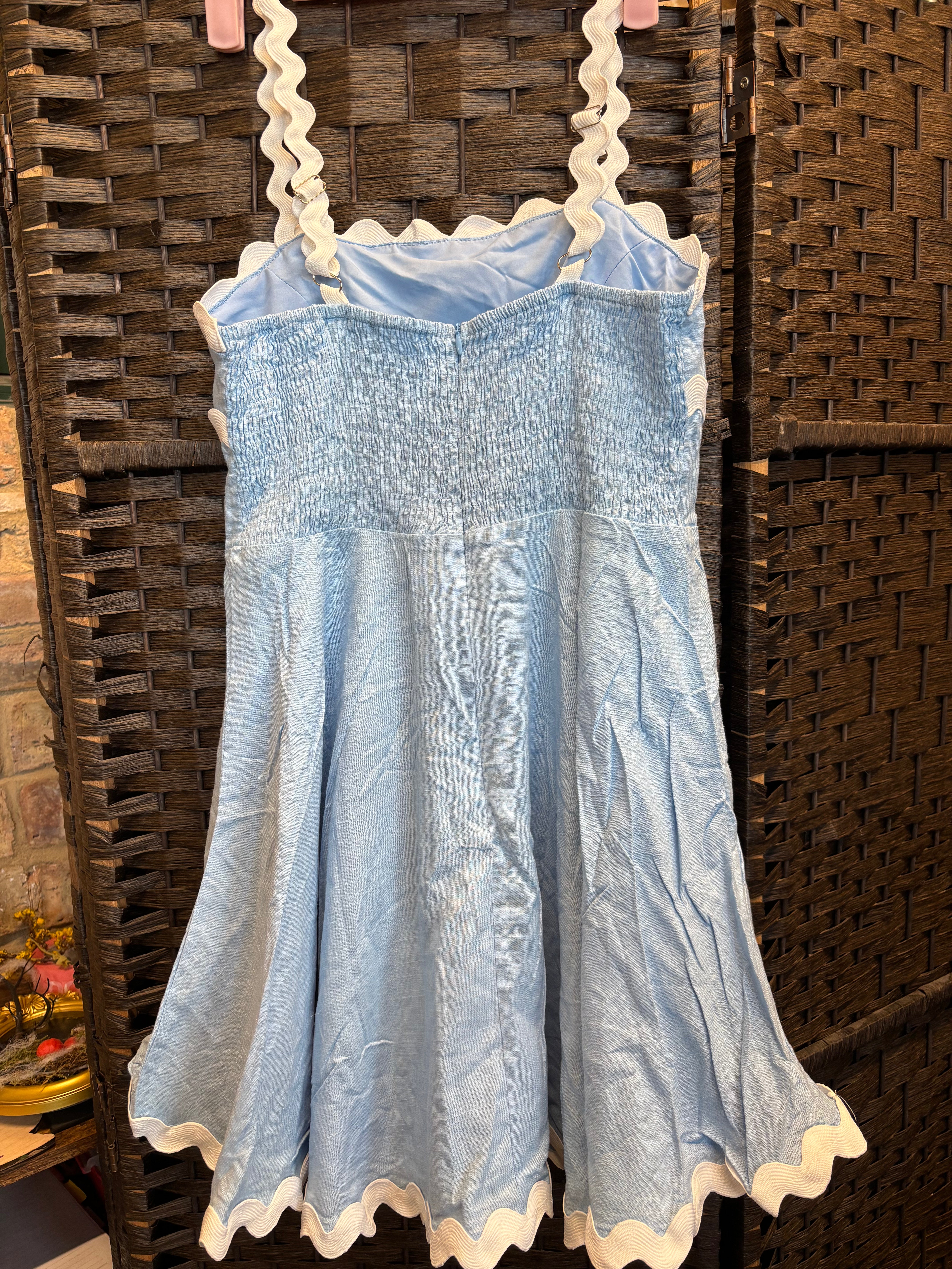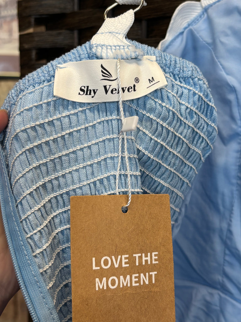 This adorable light-blue Shy Velvet dress is brand new with tags and ready to wear! It features a smocked bodice for a comfortable, stretchy fit and a flared skirt with scalloped white trim along the hem and straps. The ric-rac detailing gives it a playful, retro-inspired touch. Perfect for spring and summer days, brunch outings, or a casual date-night look.