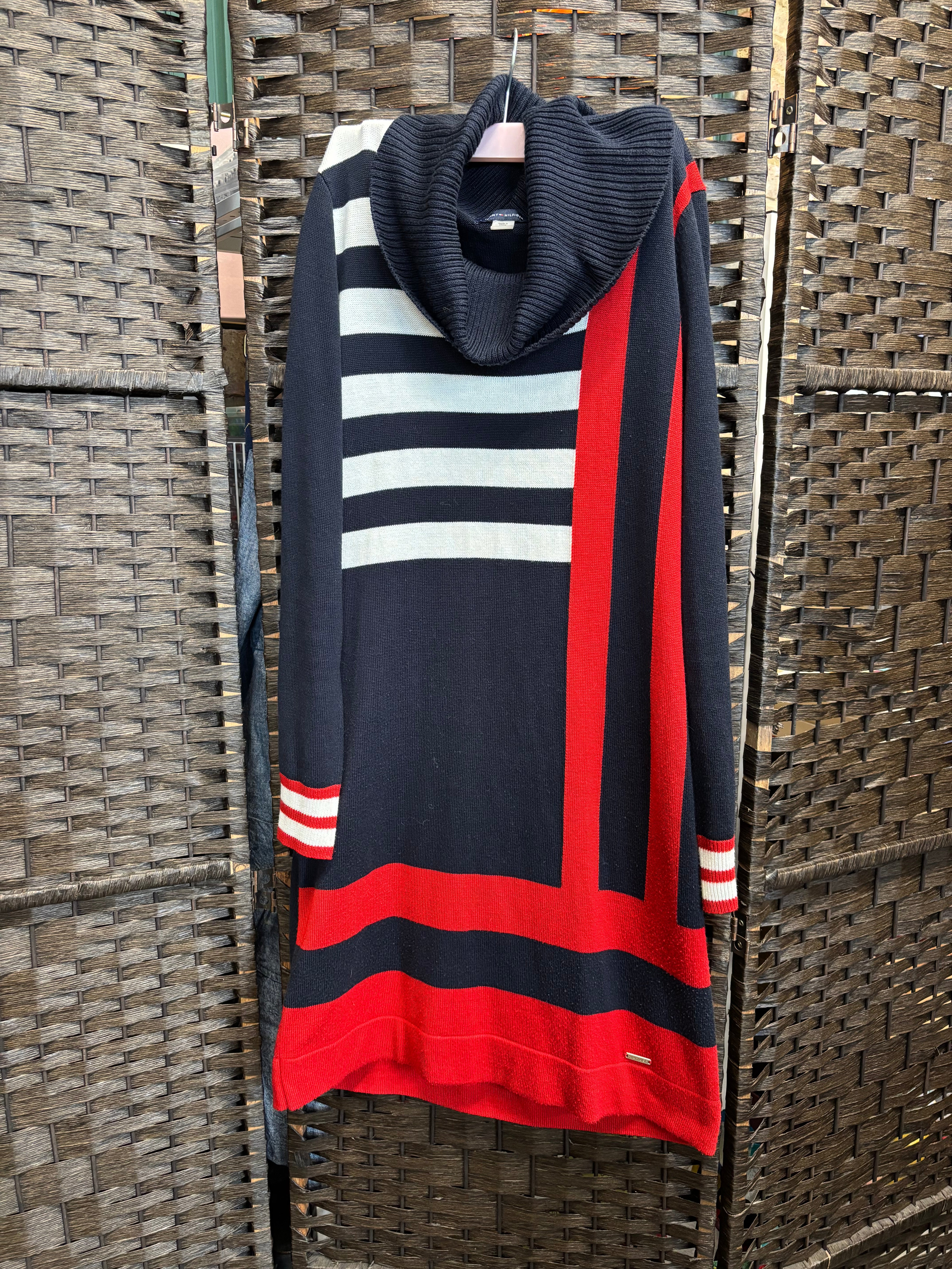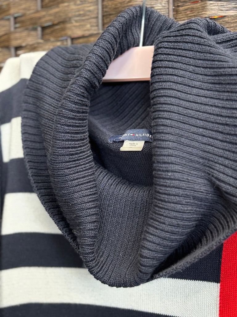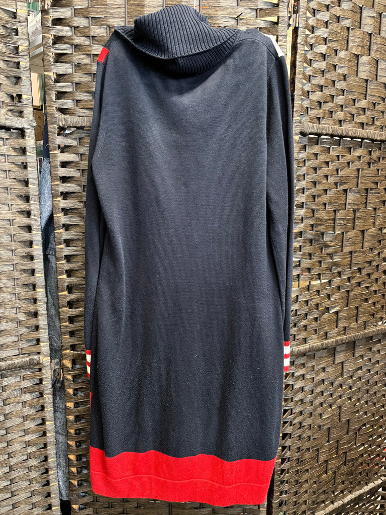 Featuring a cozy cowl neck, long sleeves, and eye-catching stripes in red, black, and gray, this midweight knit dress perfectly blends comfort with signature Hilfiger style.