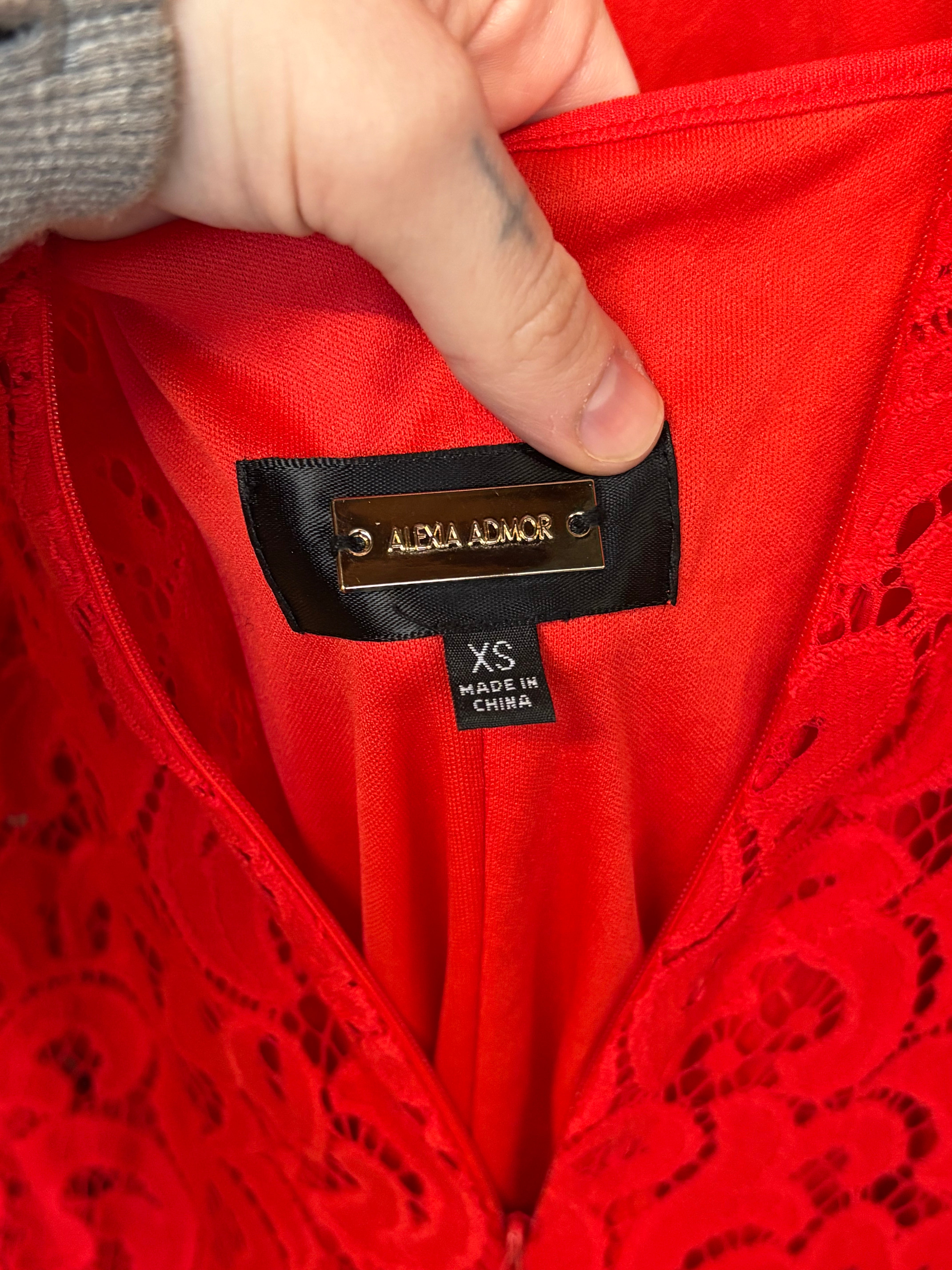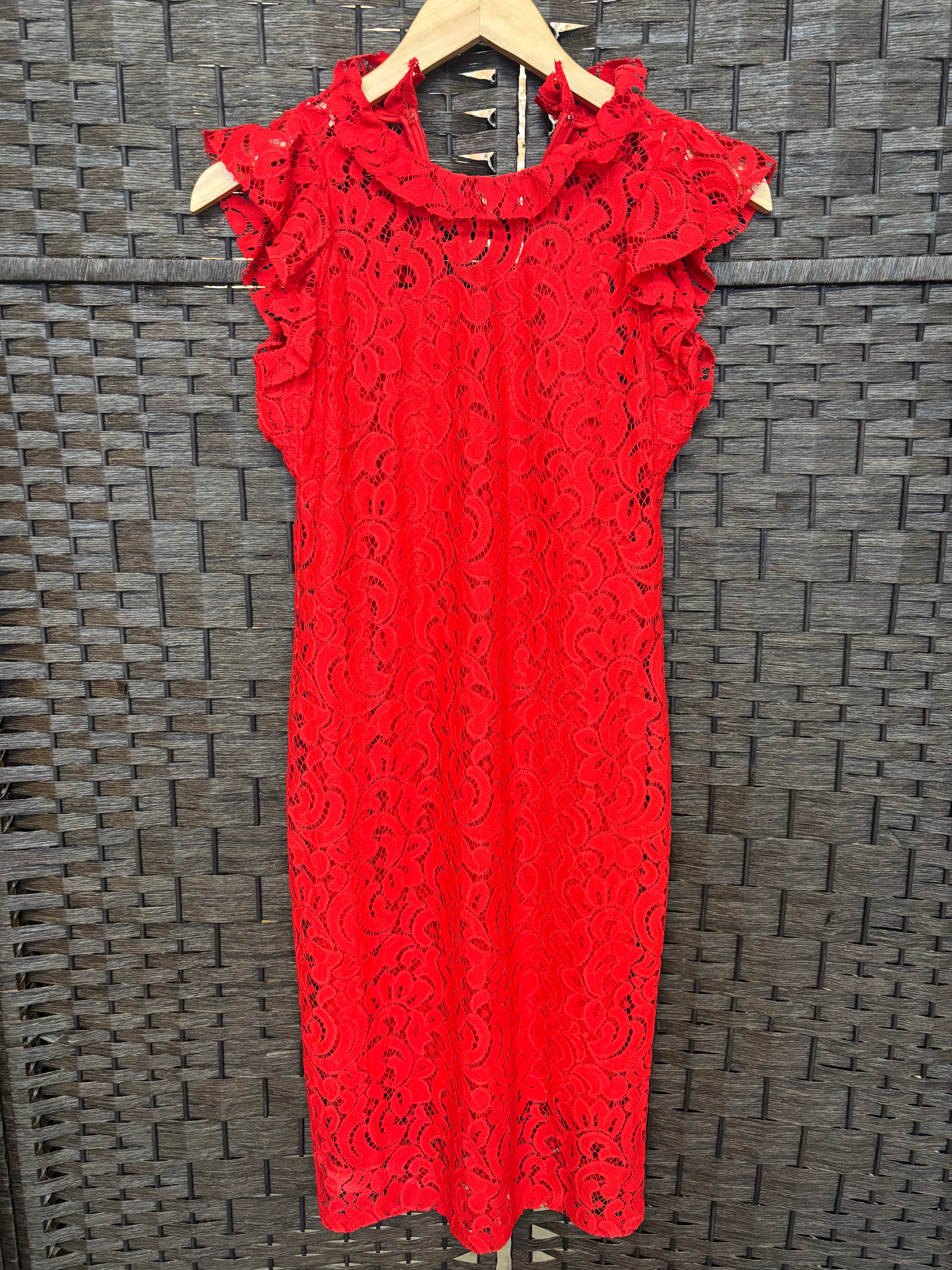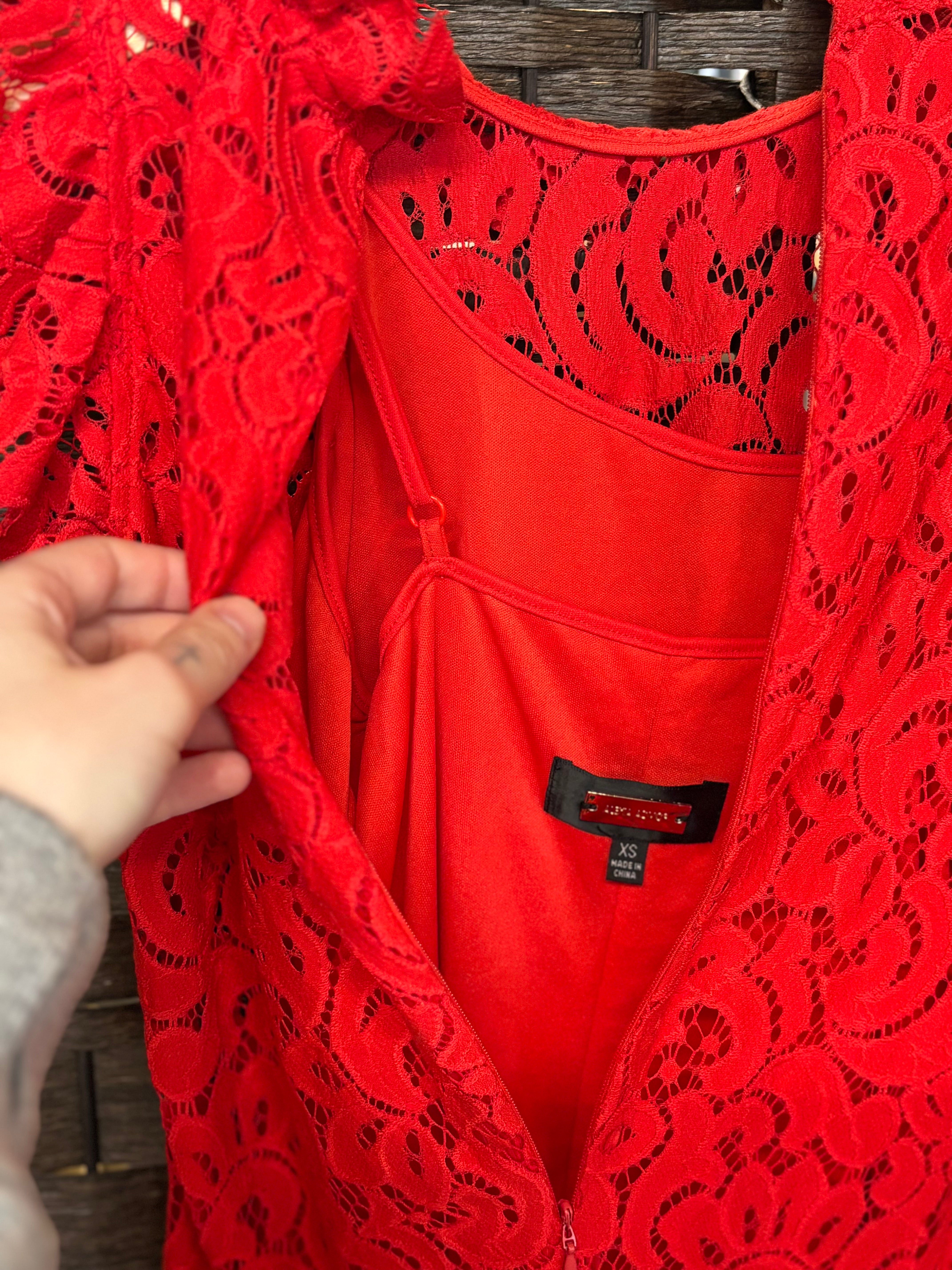 Alexa Admor Red Lace Midi Dress | Ruffle Shoulder Detail | Fitted Lace Dress w/ Slip | XS is backordered and will ship as soon as it is back in stock.
