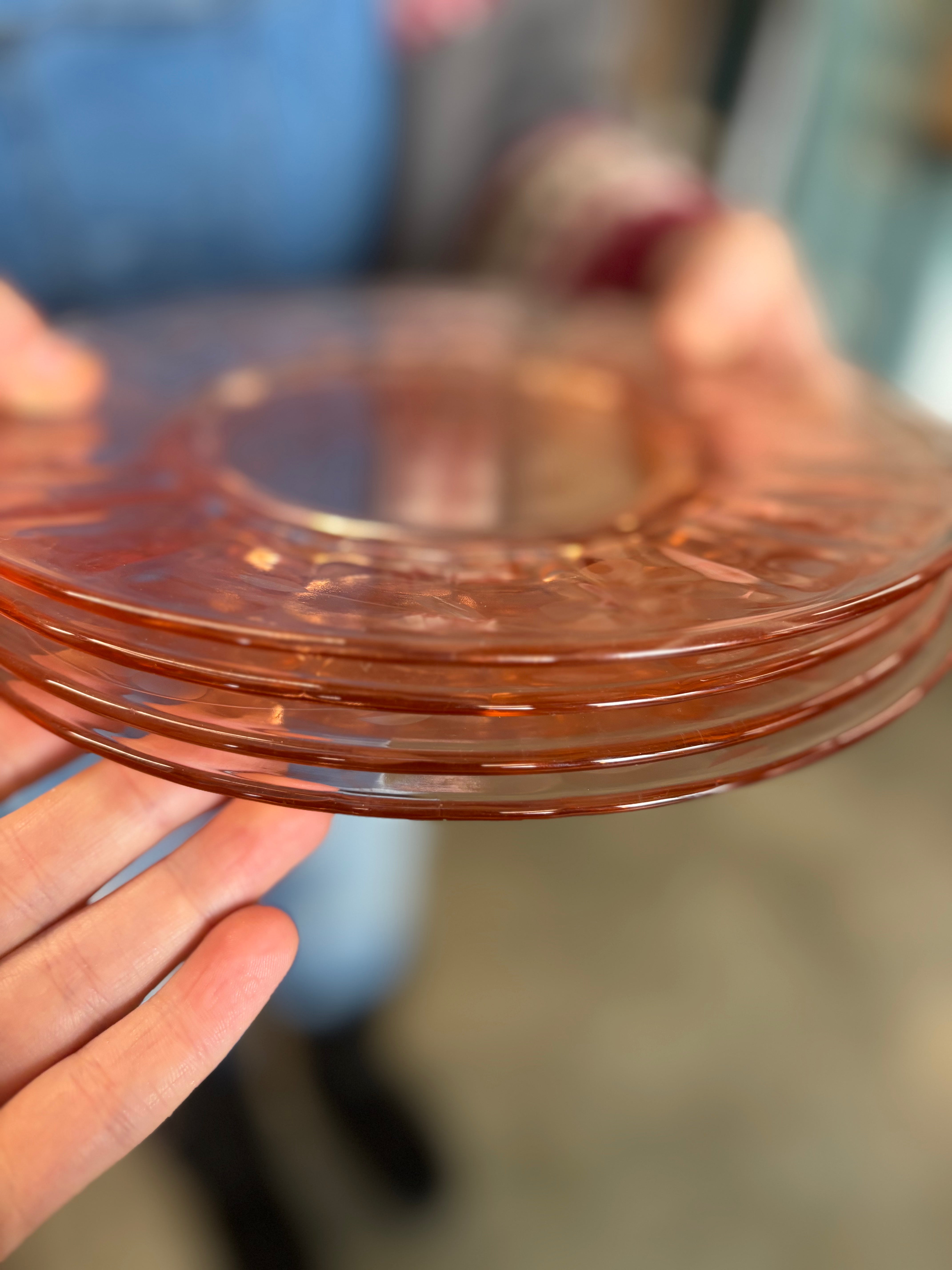 Bring timeless 1930s charm into your home with this beautiful set of 4 pink Depression glass plates. Each plate features a delicate etched grape & leaf motif with a clear center and softly scalloped radiating panel design around the rim. The classic peach-pink hue glows beautifully in natural light and instantly elevates any table.