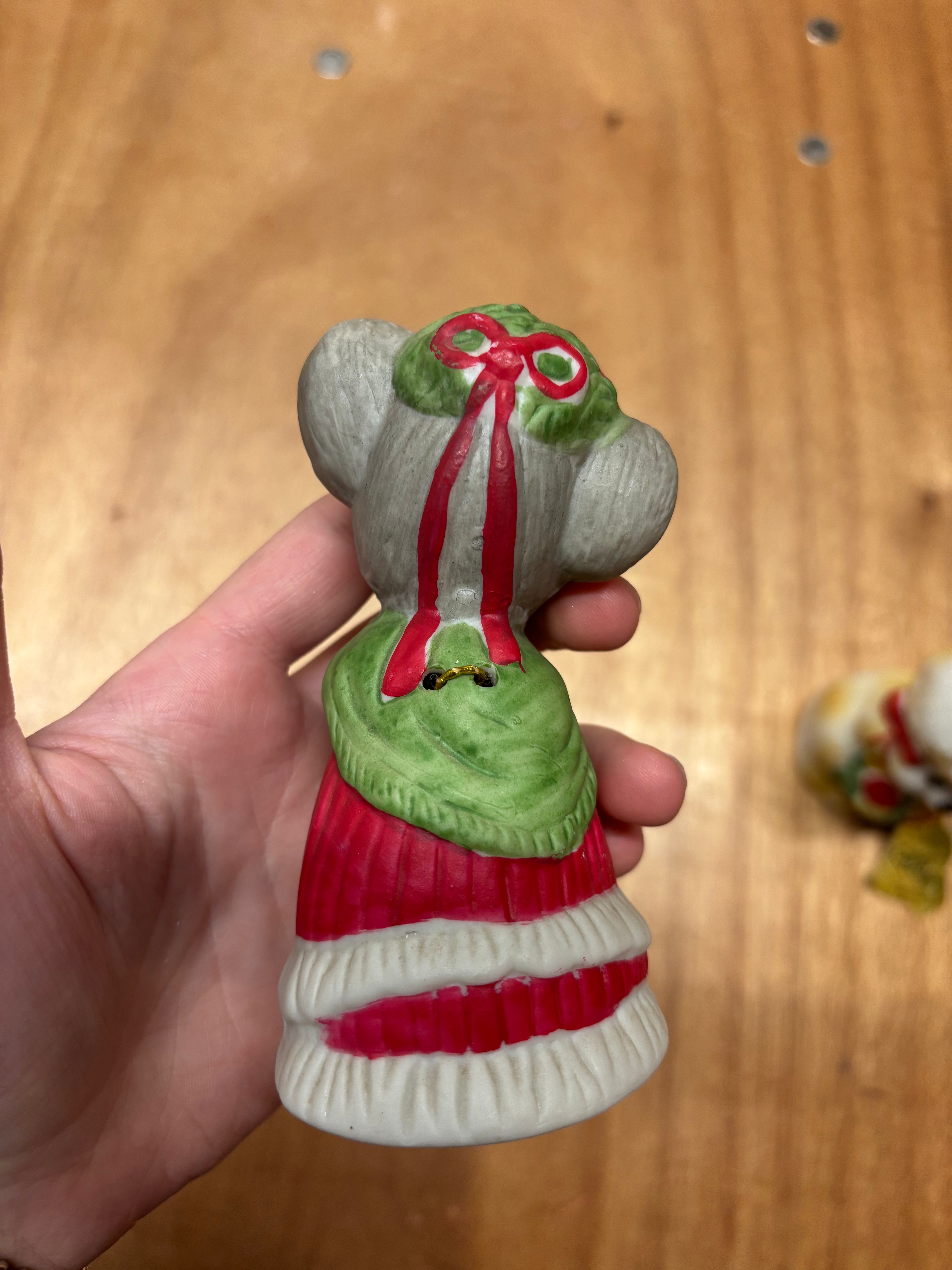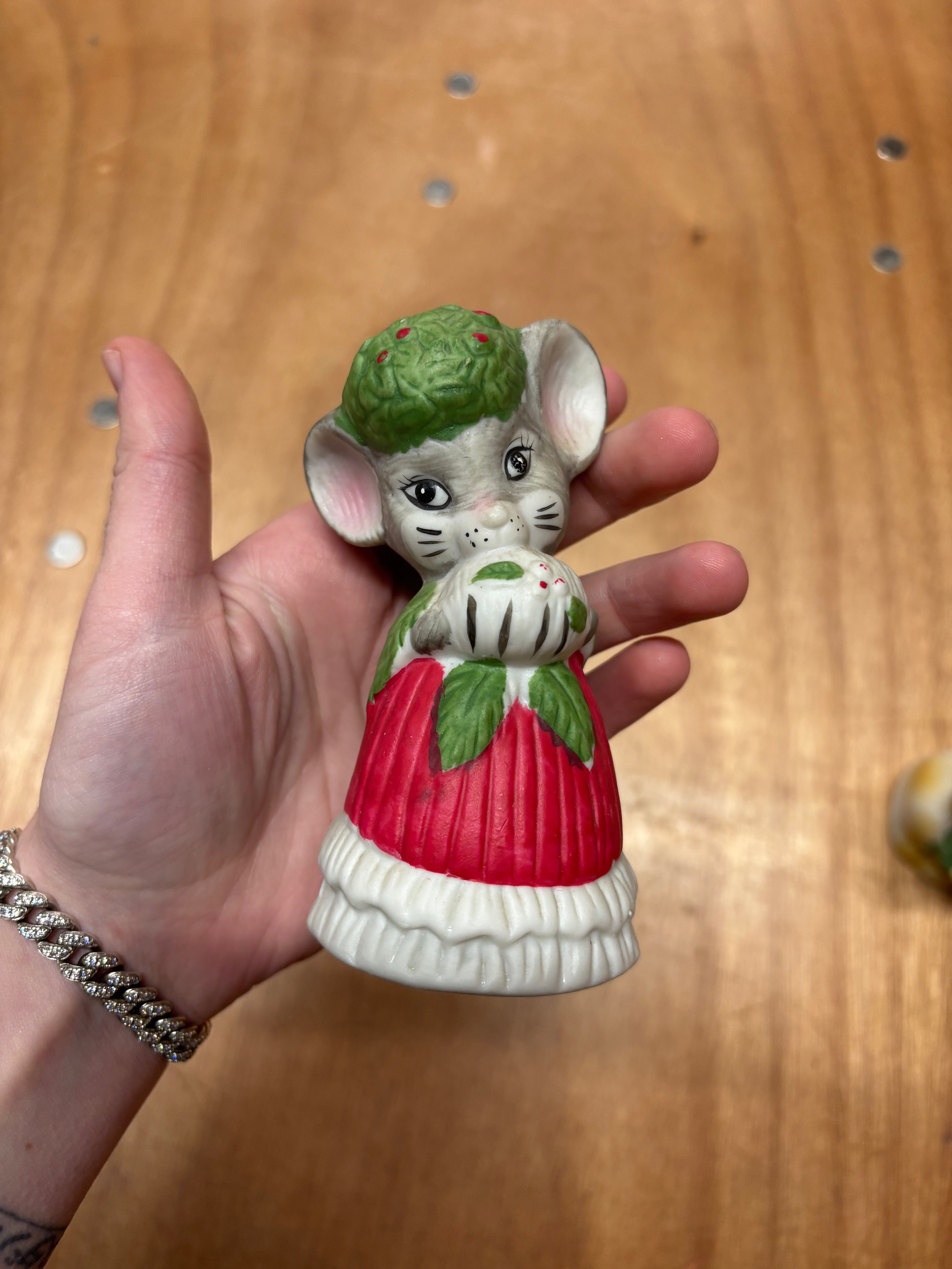 Add some festive charm to your holiday décor with this adorable vintage JASCO Christmas mouse bell, handcrafted in Taiwan and made from bisque porcelain. This sweet little mouse is dressed in a classic red-and-white holiday outfit with green holly accents and holds a tiny present, giving it that whimsical 1980s charm collectors love.