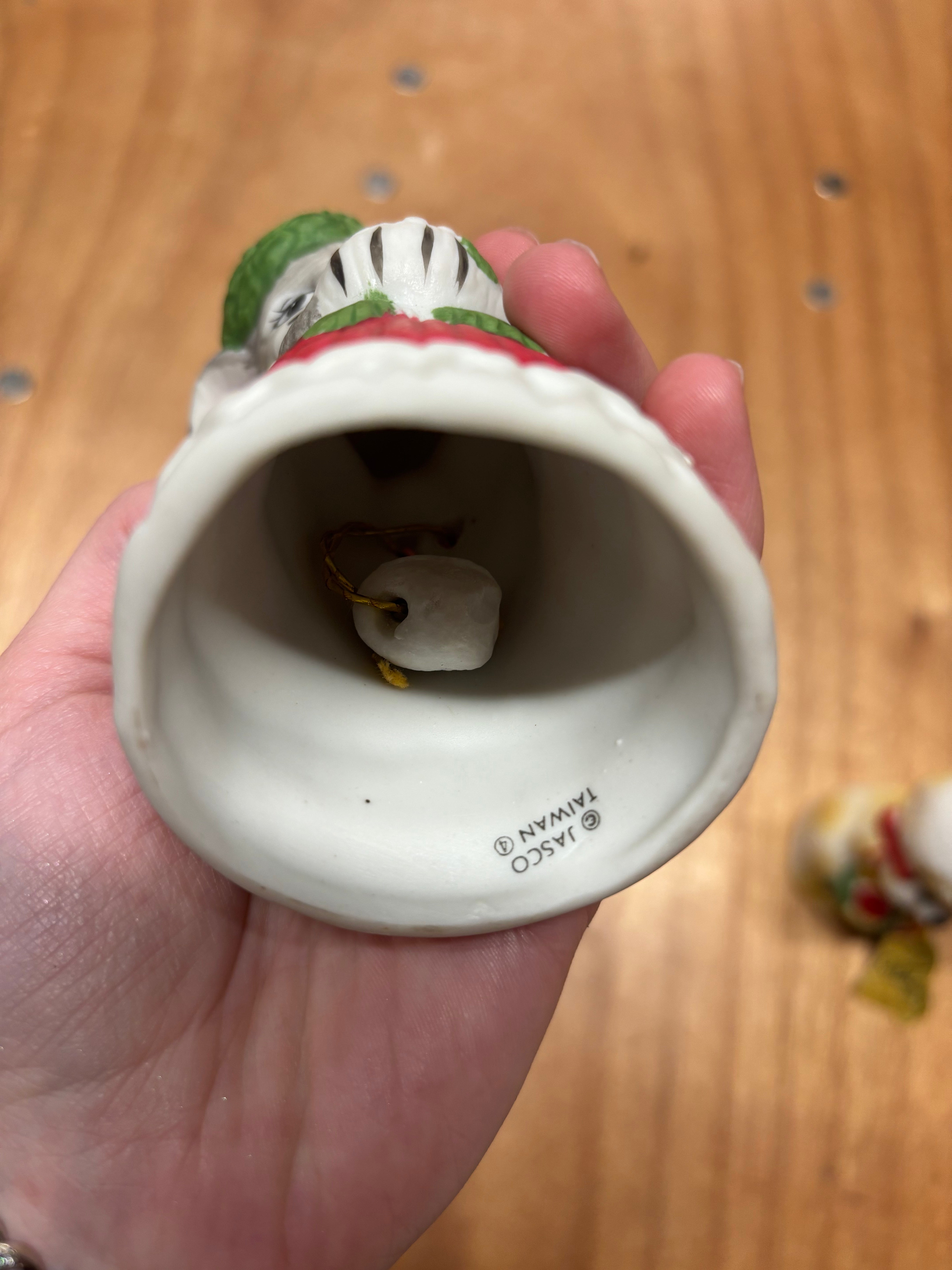 The matte bisque finish and hand-painted details make it a lovely display piece for Christmas, cottage-style décor, or figurine collections. The inside is stamped © JASCO Taiwan, and the porcelain clapper is still attached.