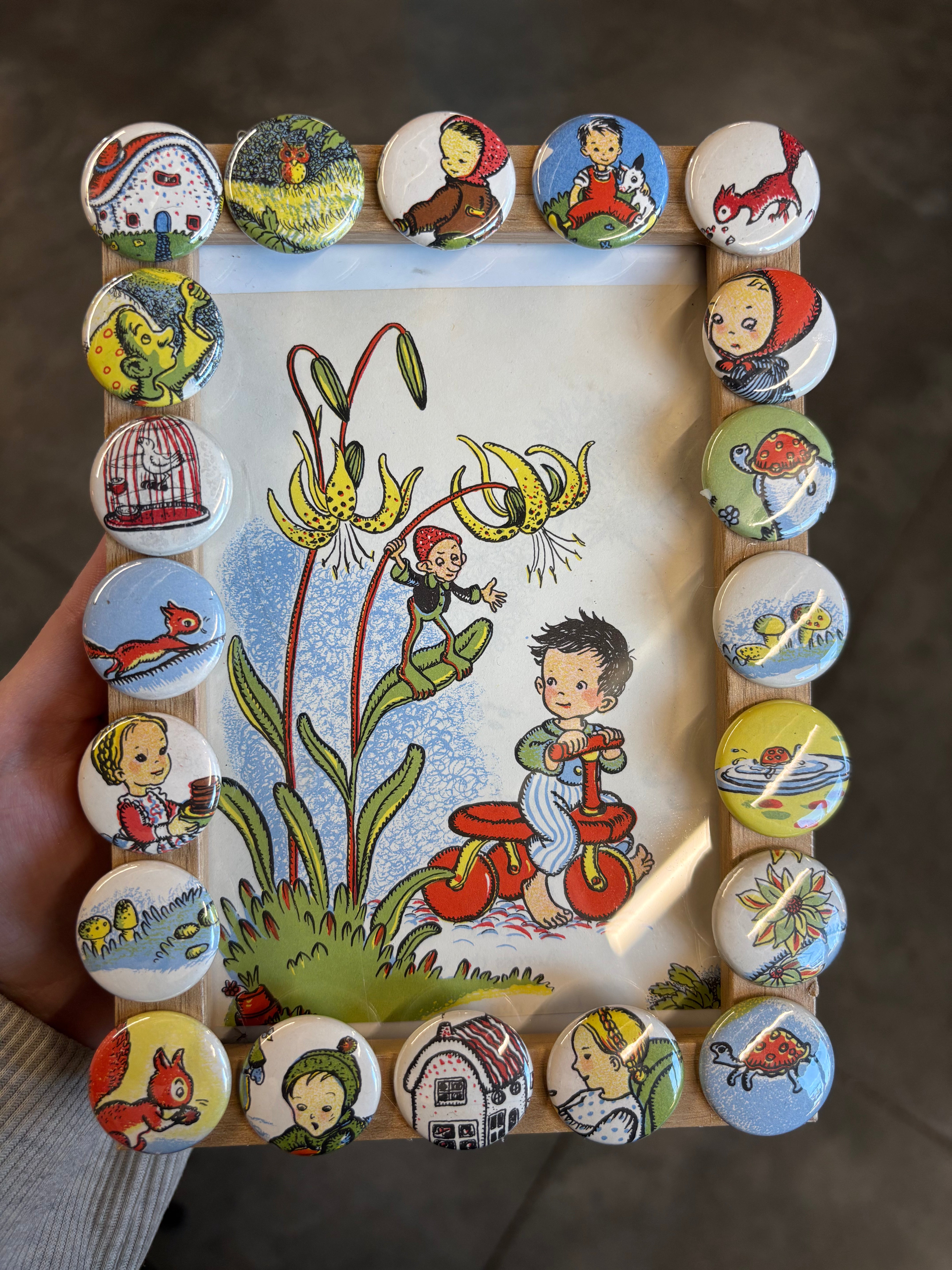The buttons are carefully placed around a natural wood frame, highlighting the bold colors and nostalgic details of mid-century children’s book art. This piece is full of charm and imagination, perfect for anyone who loves vintage décor, nursery style, or fairy tale illustrations.