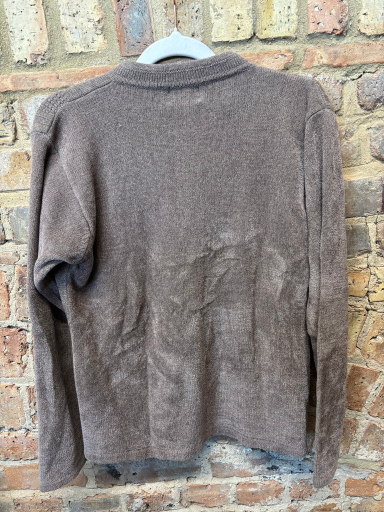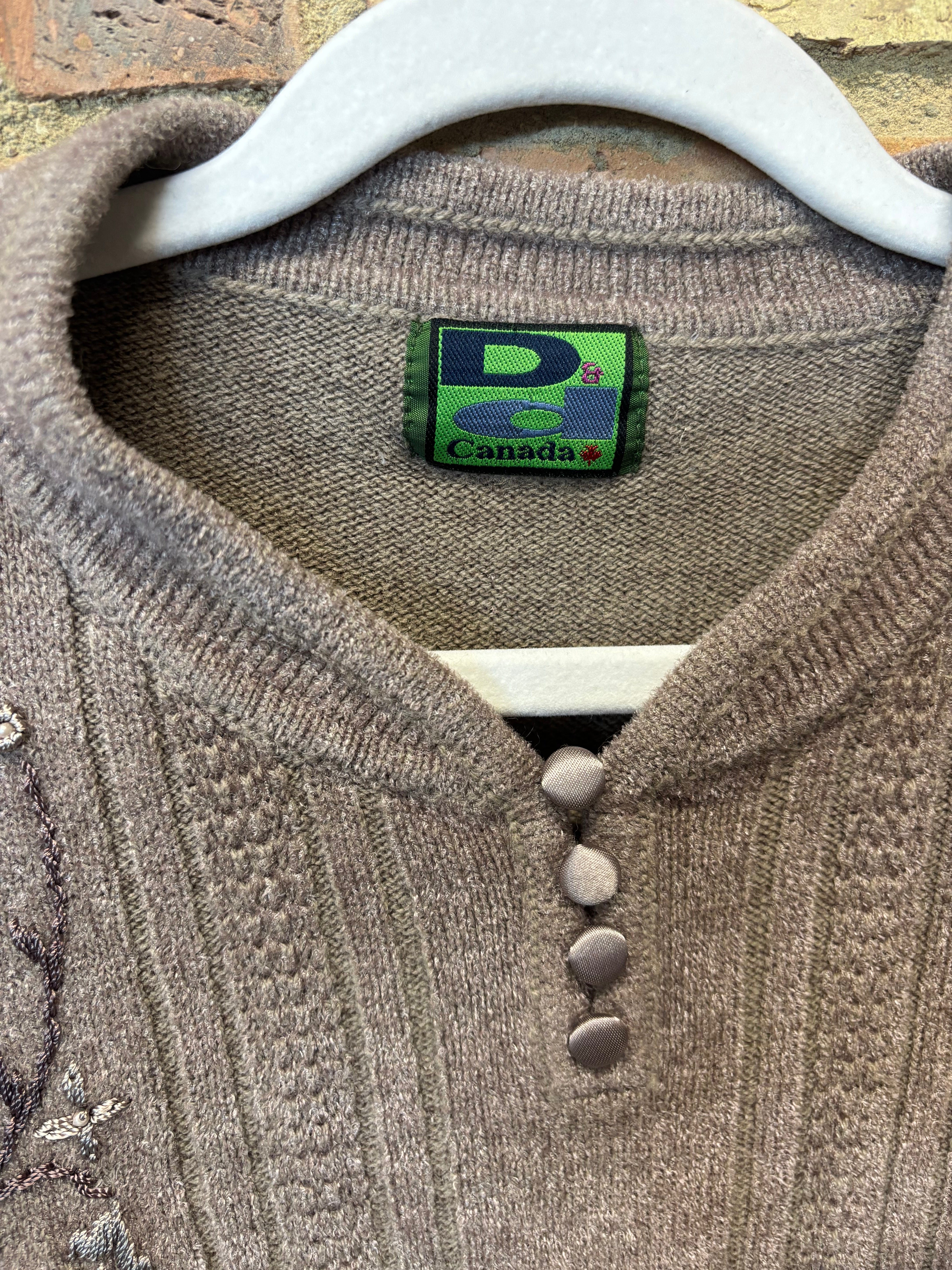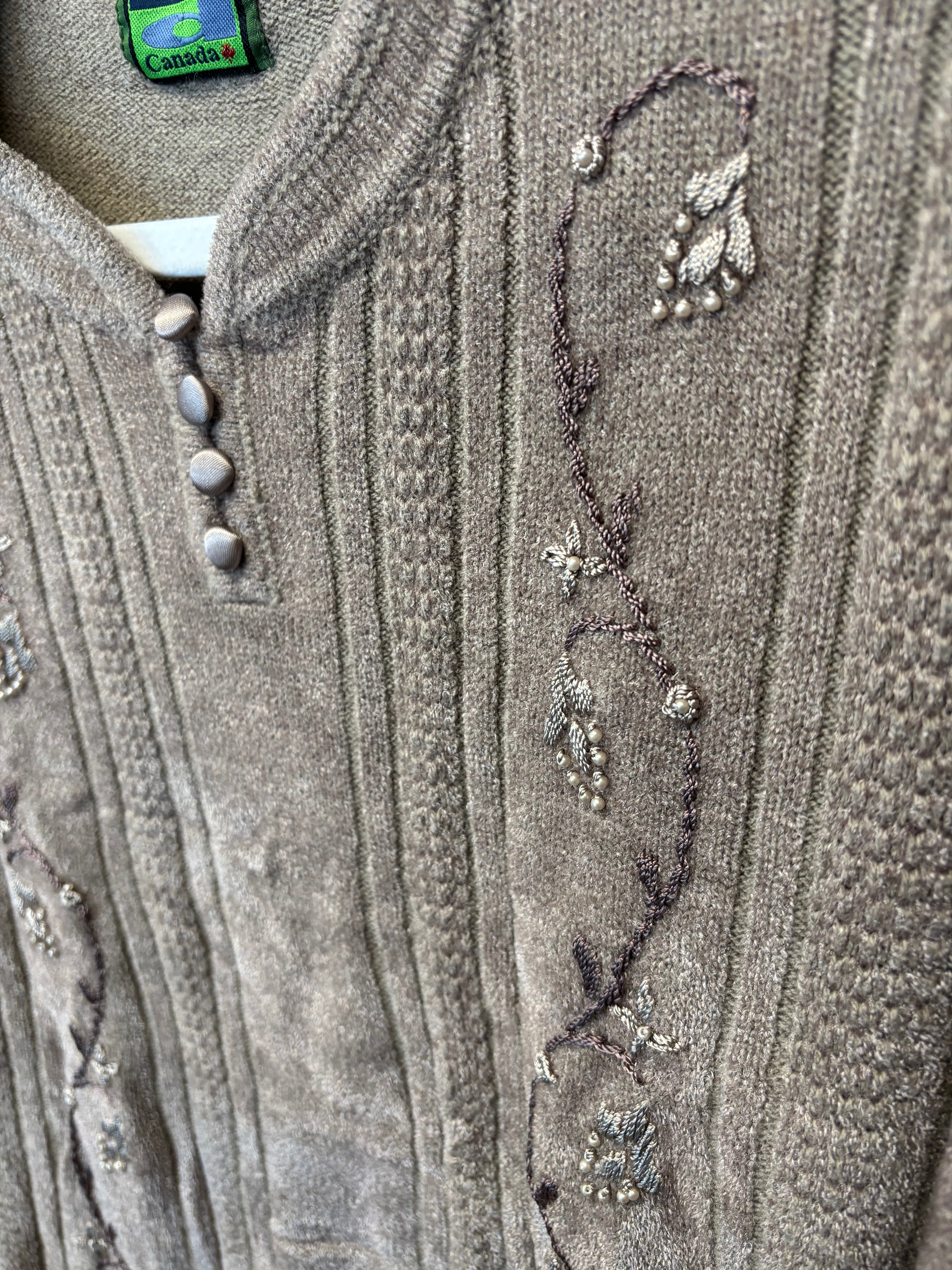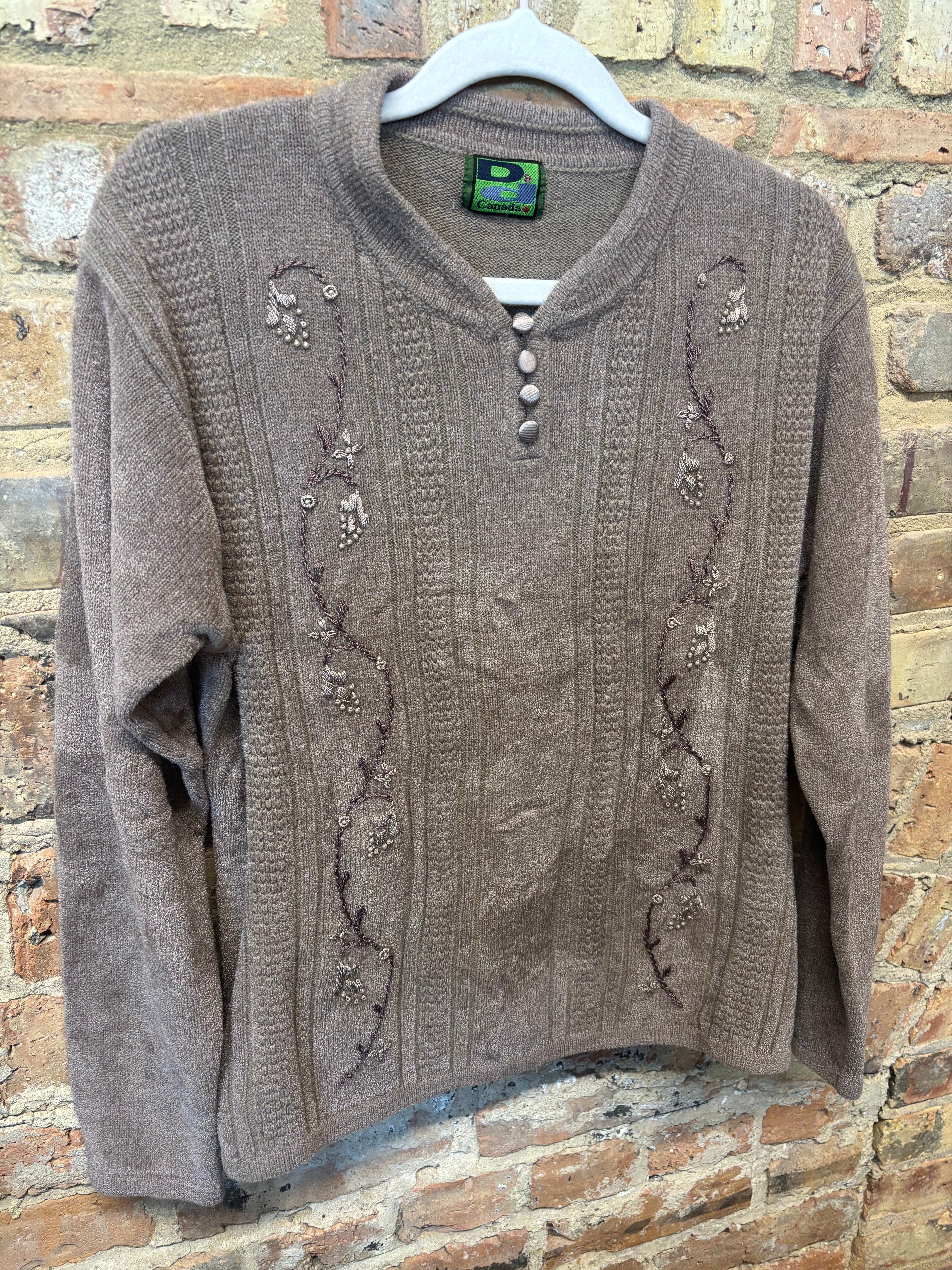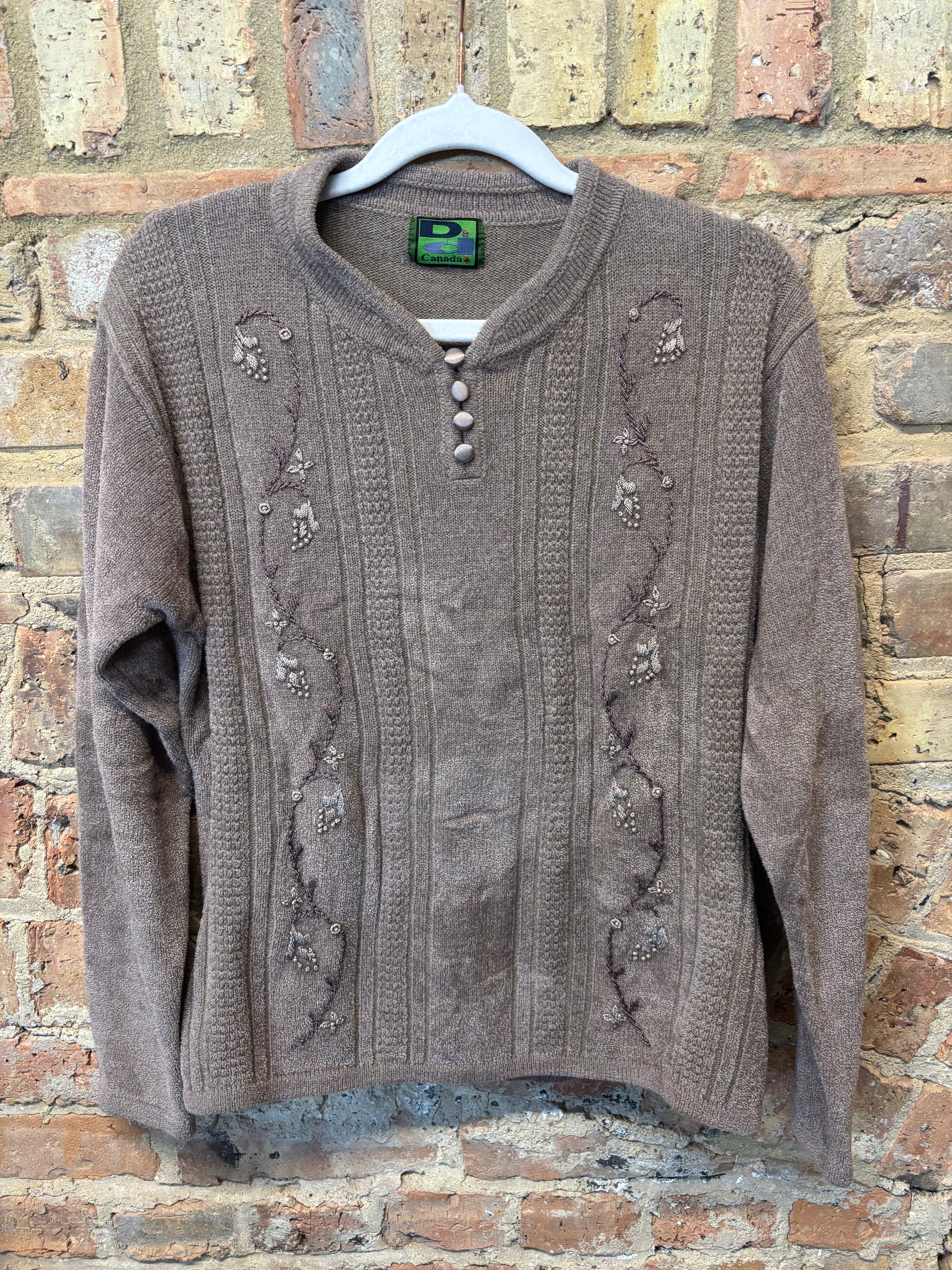 Cozy with a touch of vintage charm! This P & D Canada embroidered knit sweater is a unique piece featuring a soft brown knit base, vertical textured patterns, and floral embroidery along the front. The buttoned neckline adds a classic touch, perfect for layering or wearing on its own.
