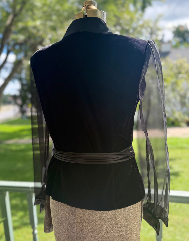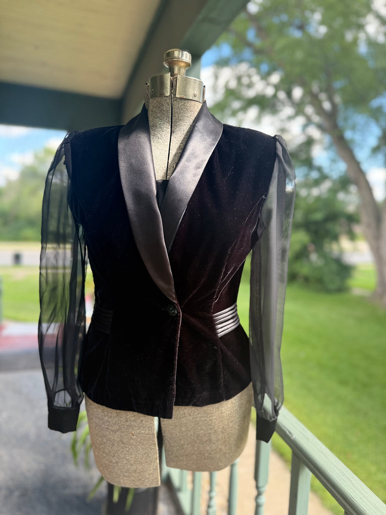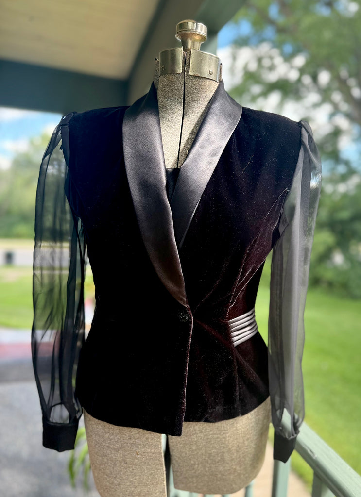 - Fabric: Velvet body, satin lapels & trim, sheer chiffon sleeves