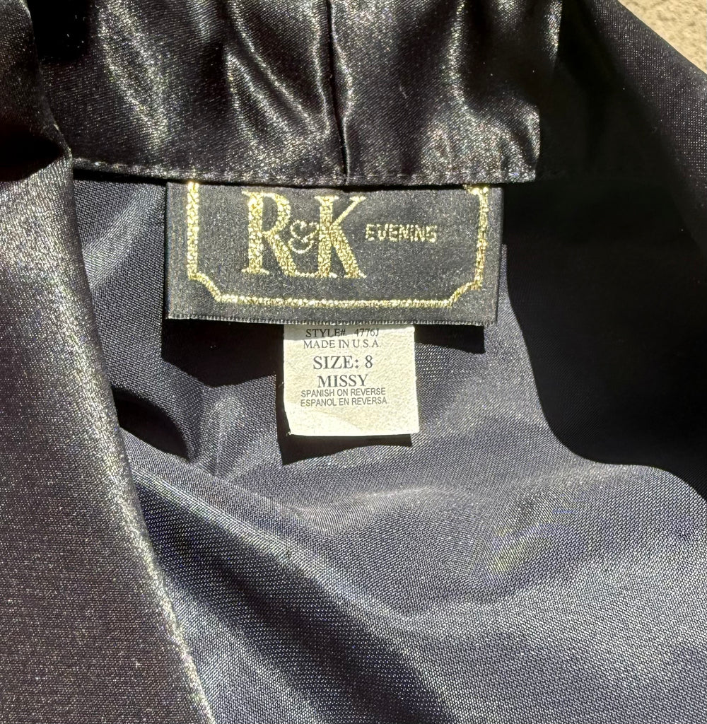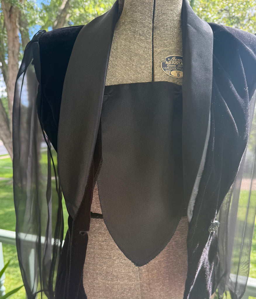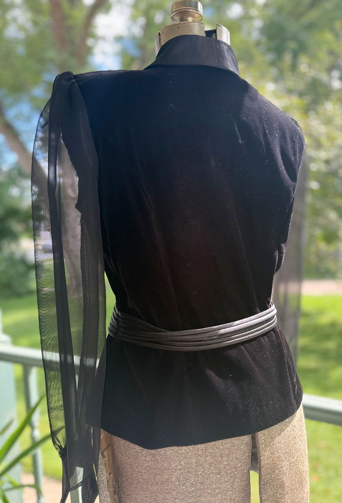 This stunning vintage R&K Evenings blazer blends drama and elegance with its luxe black velvet body and sheer chiffon sleeves. Featuring a satin shawl collar, pleated satin waist accents, and a single ornate button closure, it’s a true statement jacket for evening wear, cocktail attire, or modern gothic styling. The sheer puff sleeves with satin cuffs add a romantic touch, while the tailored waistline flatters the silhouette.