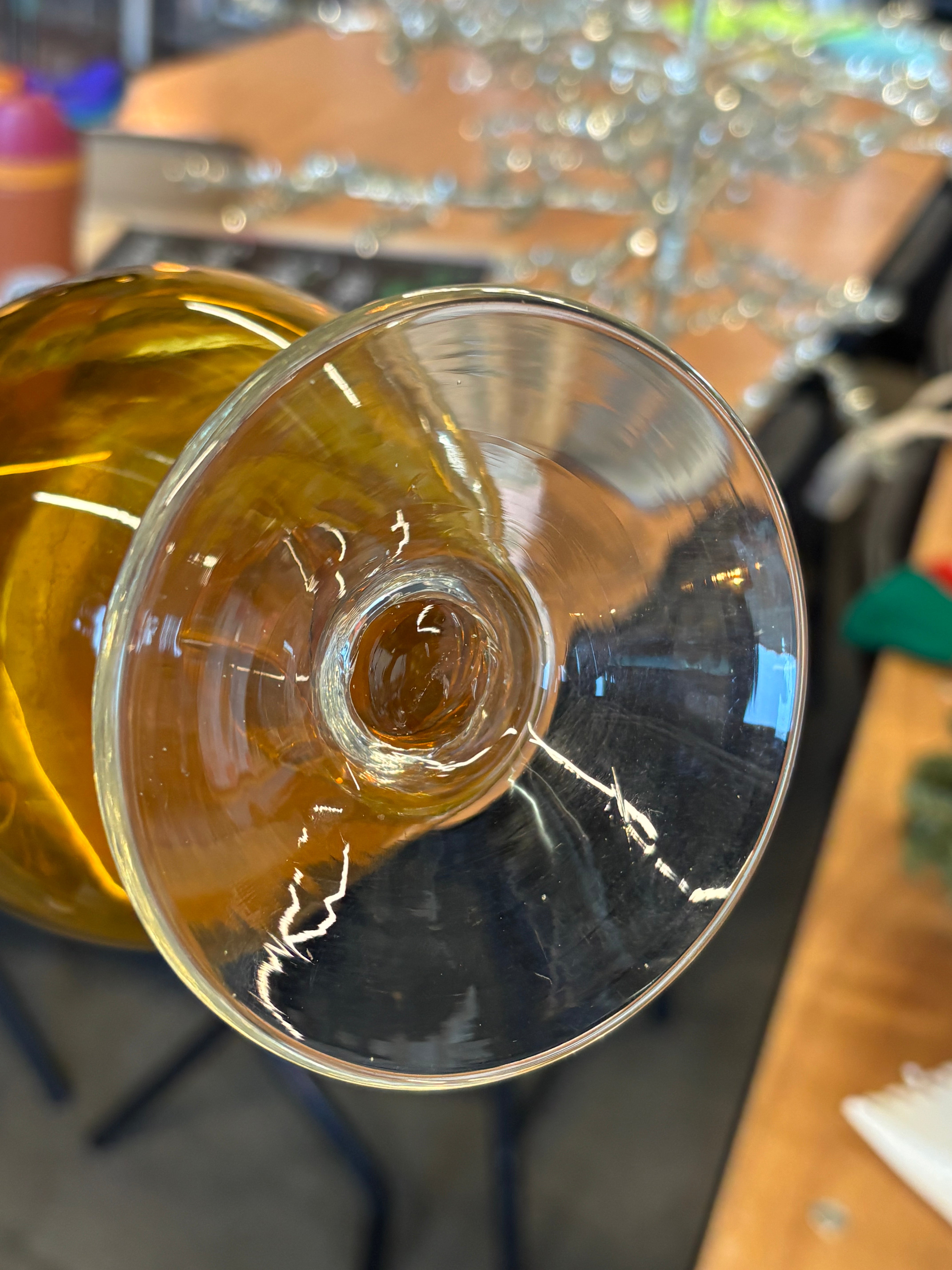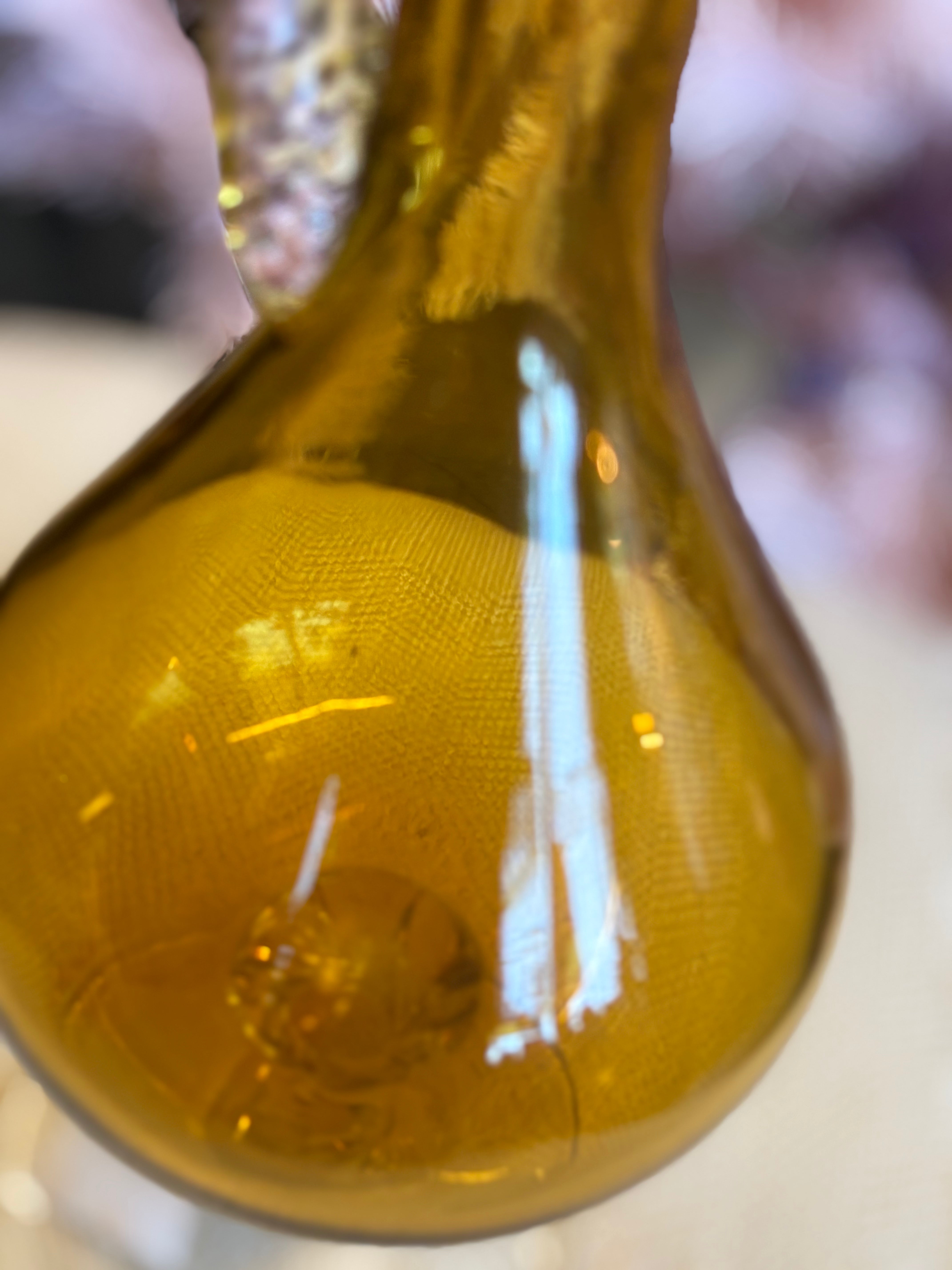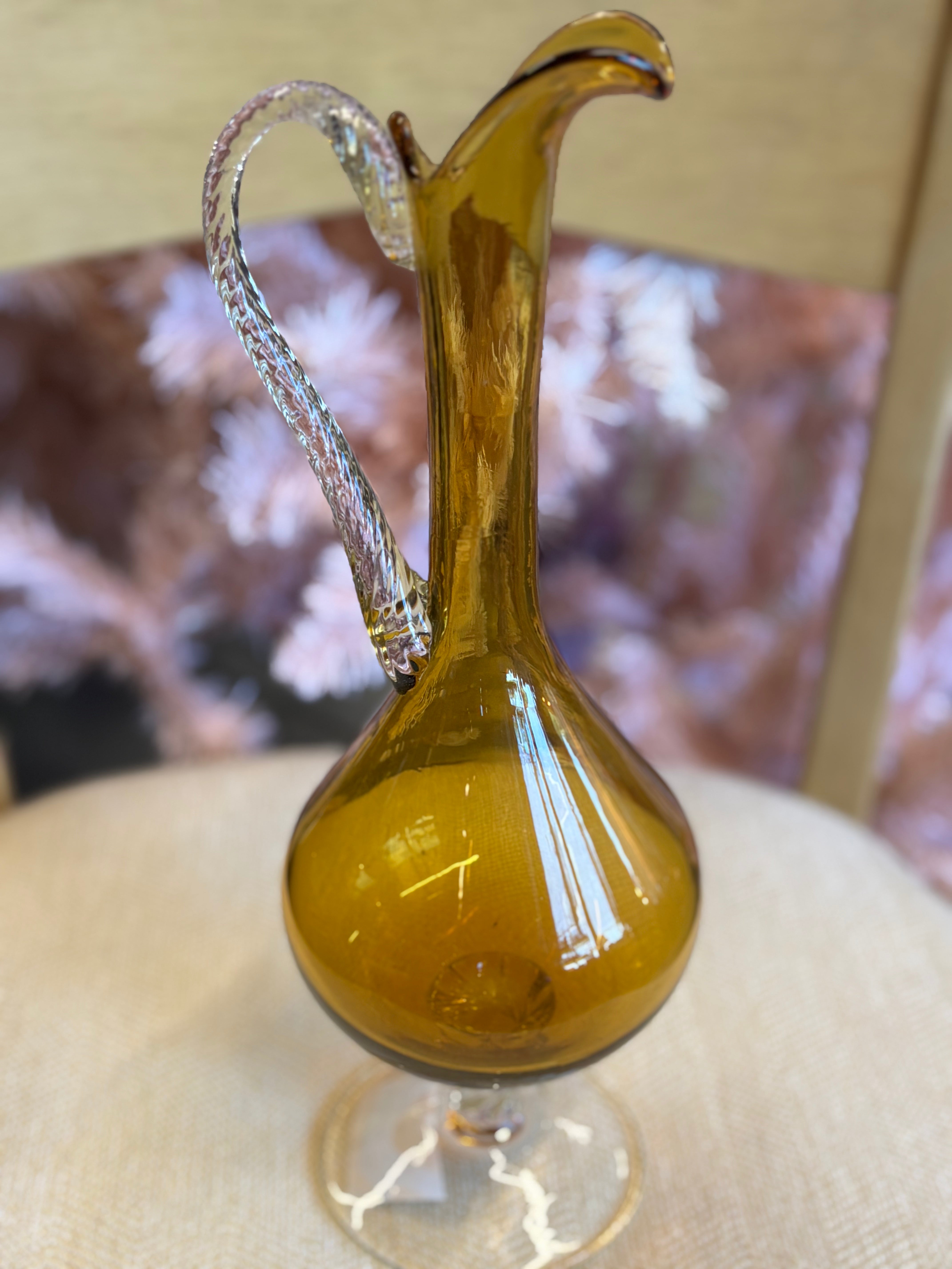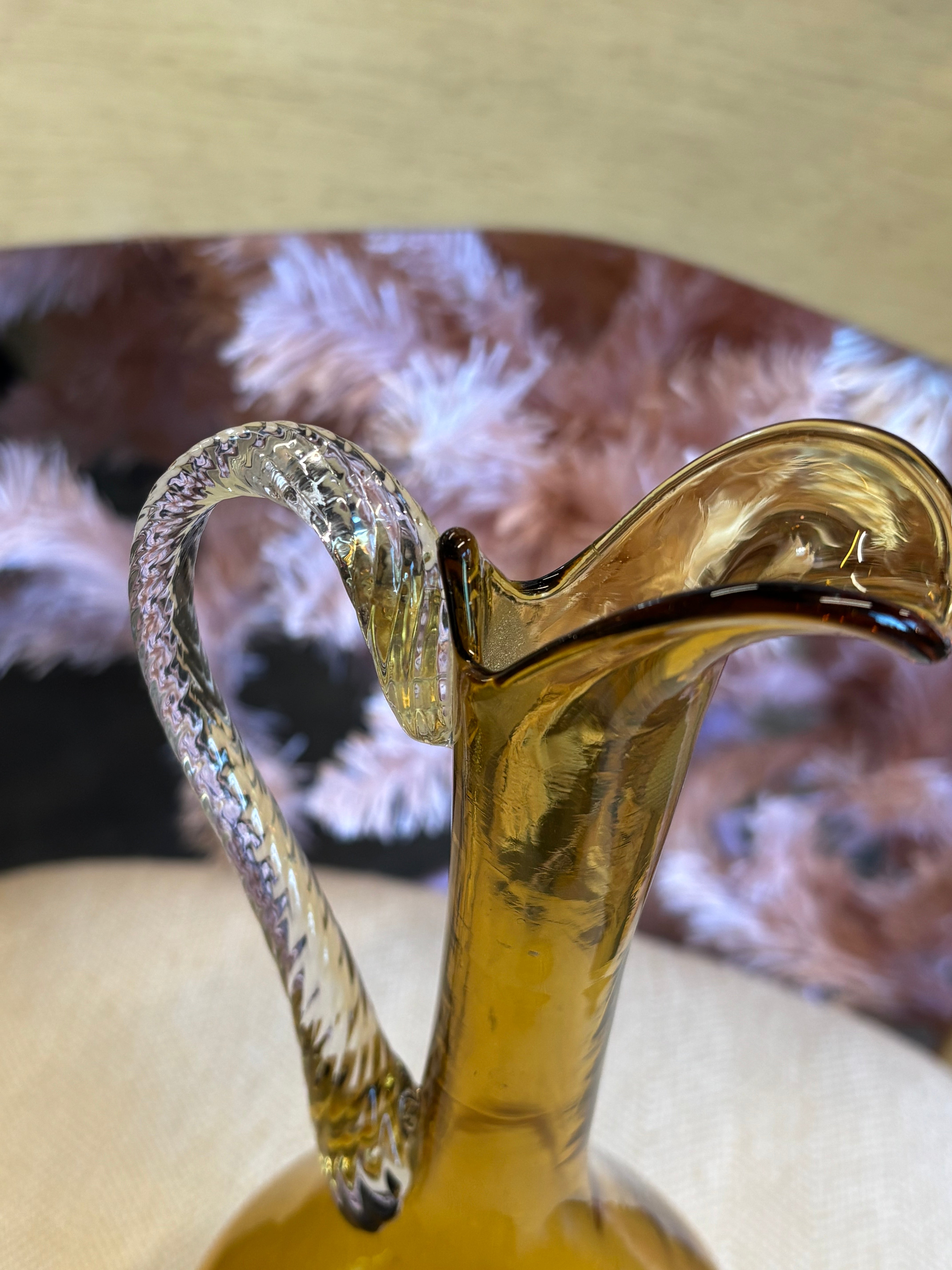 Beautiful vintage amber glass ewer with a clear, twisted glass handle and elegant fluted spout. This mid-century piece is likely Empoli-style art glass, hand-blown in Italy during the 1960s–1970s. The amber body has a warm golden tone that catches the light beautifully, while the clear handle adds a stunning contrast and a touch of sophistication. Perfect as a display piece, vase, or addition to any vintage glassware collection.