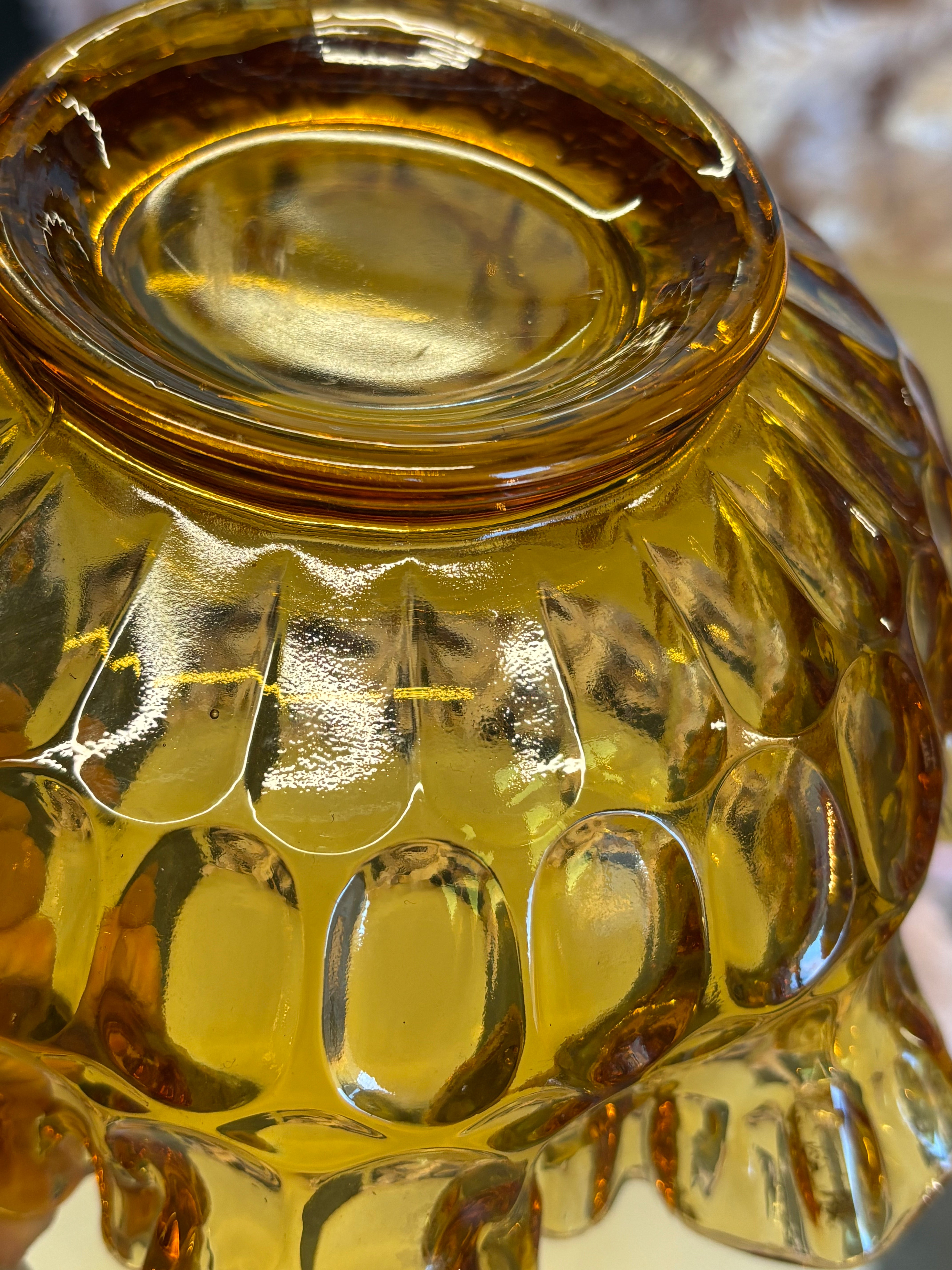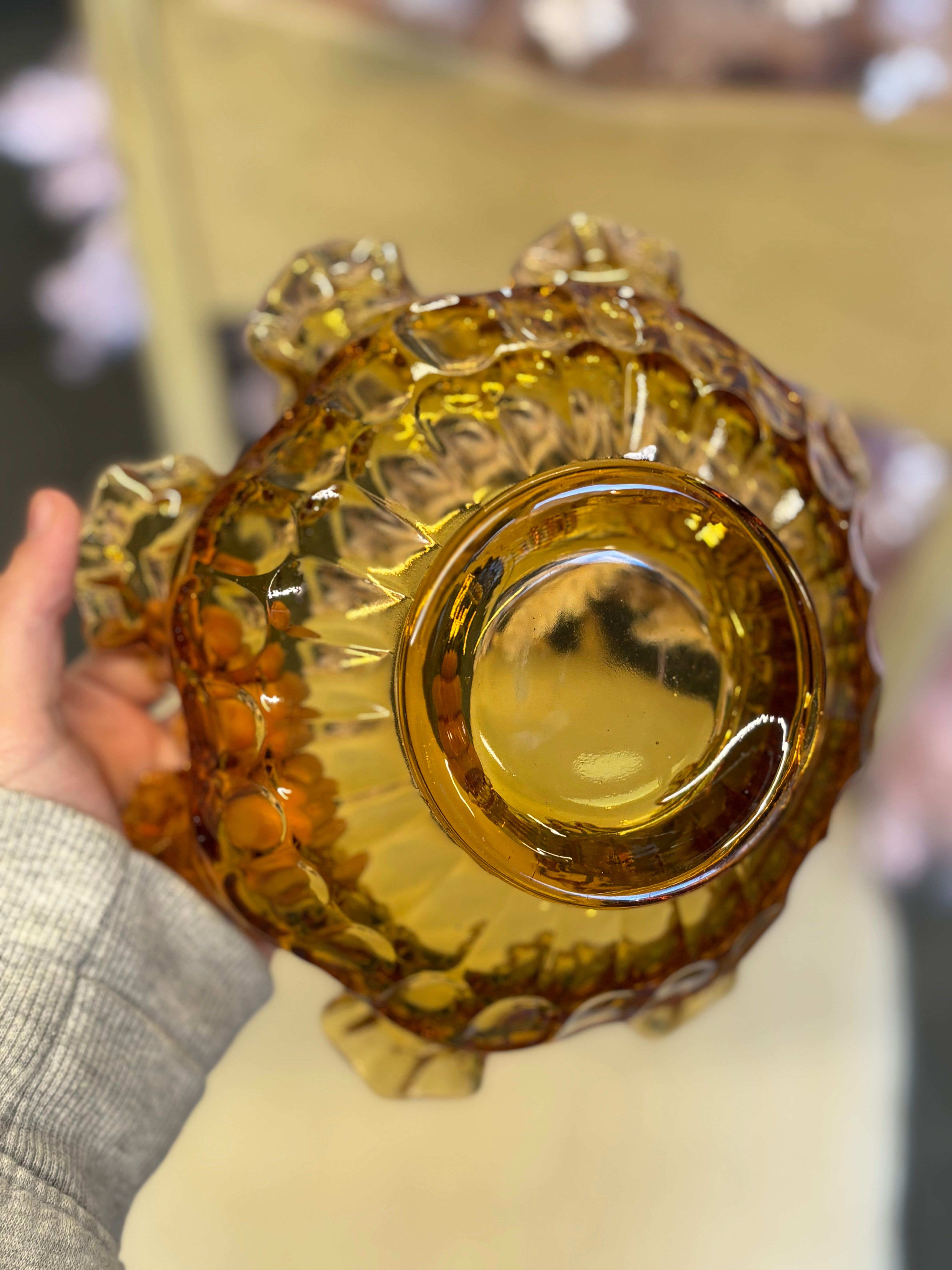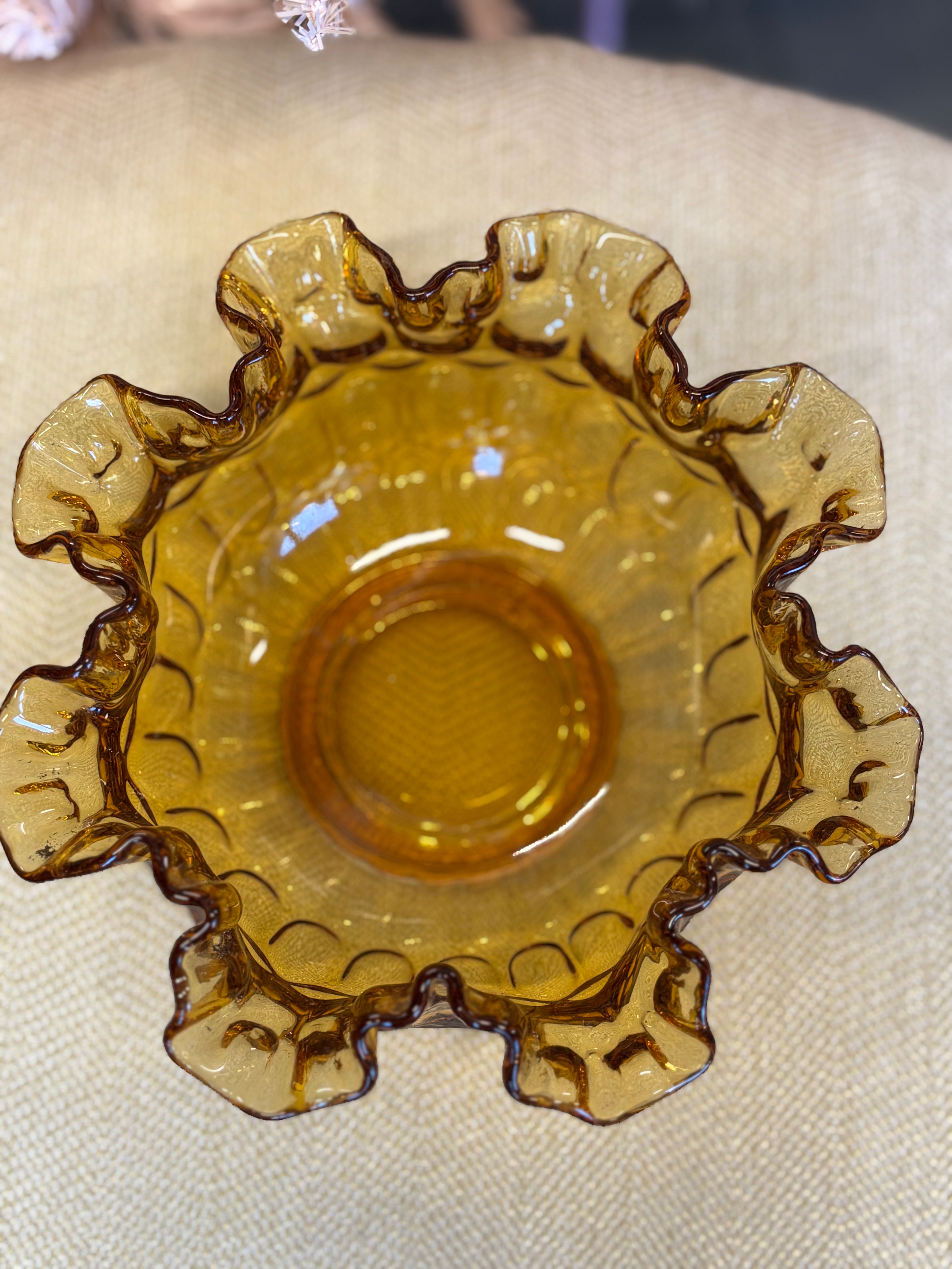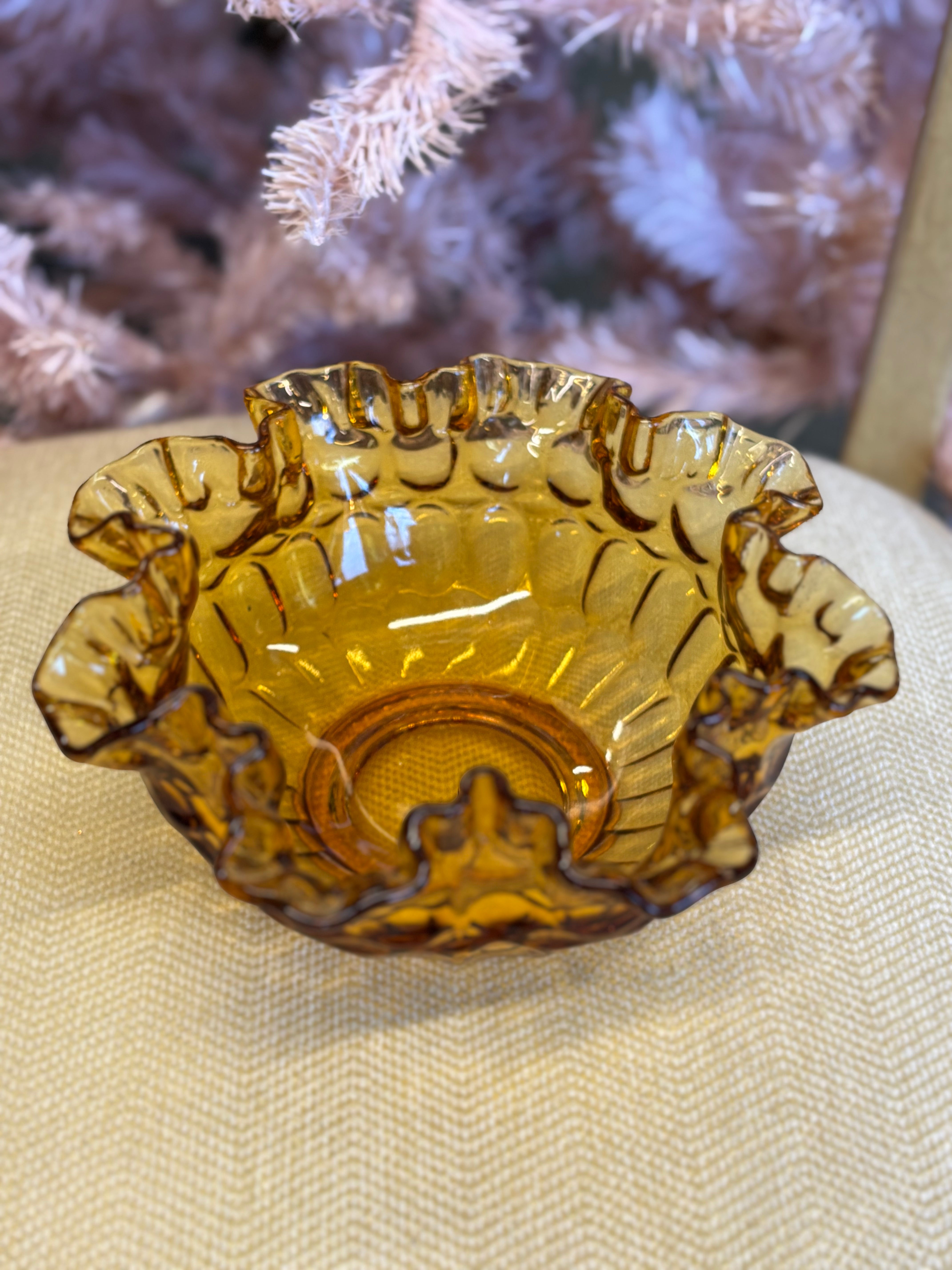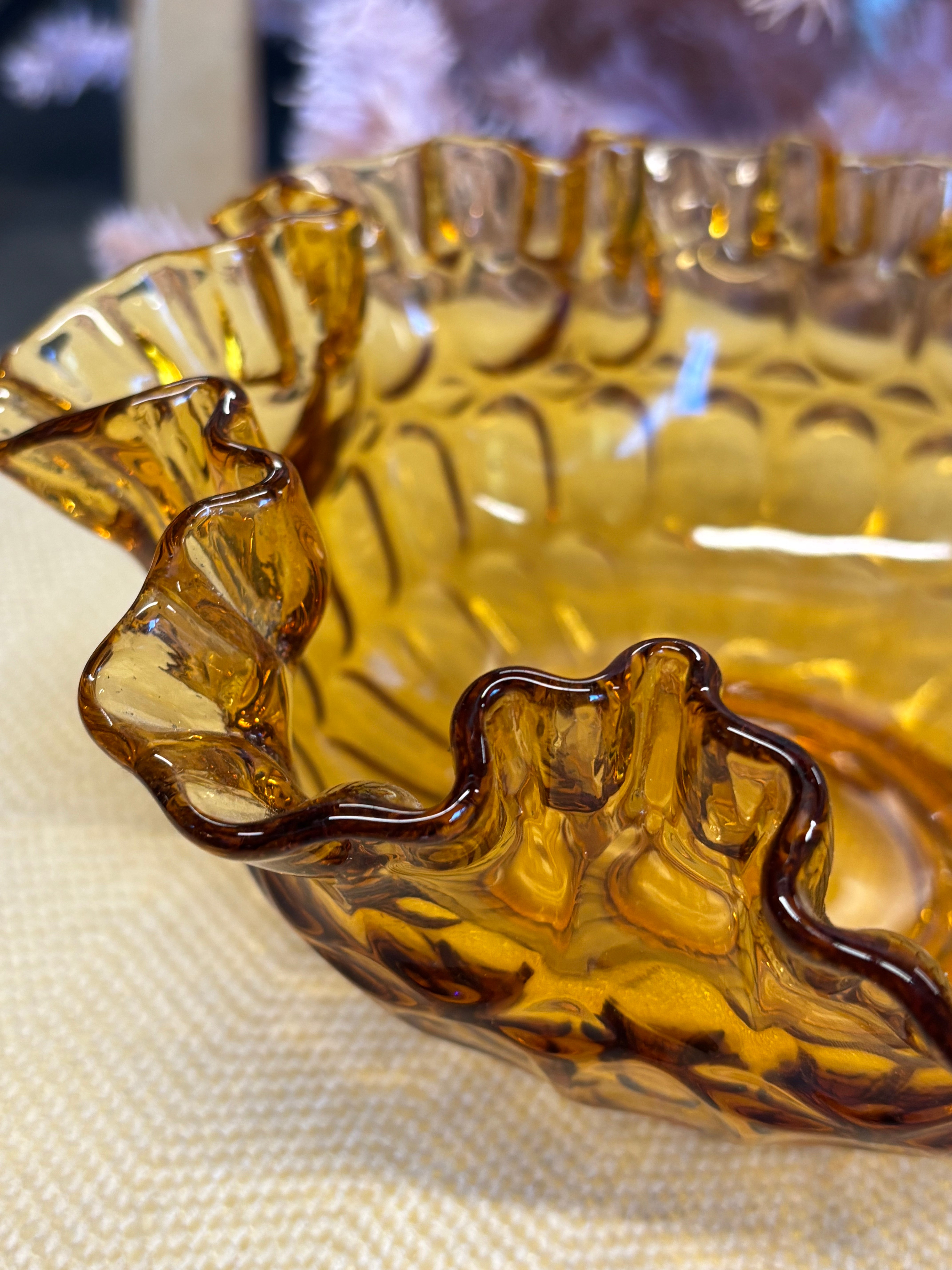 Gorgeous vintage amber glass bowl featuring a dramatic ruffled rim and textured honeycomb-style pattern. The rich golden hue glows beautifully in the light, making it a stunning accent for your vintage home décor or table centerpiece. Perfect for candy, potpourri, or simply as a collectible display piece.