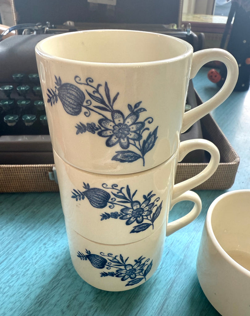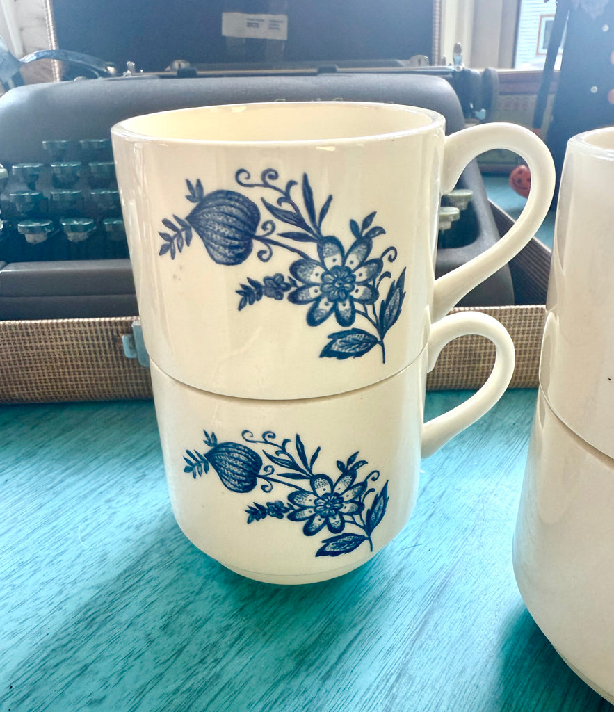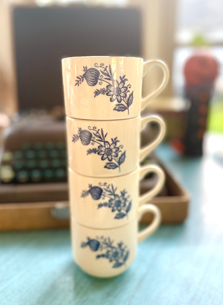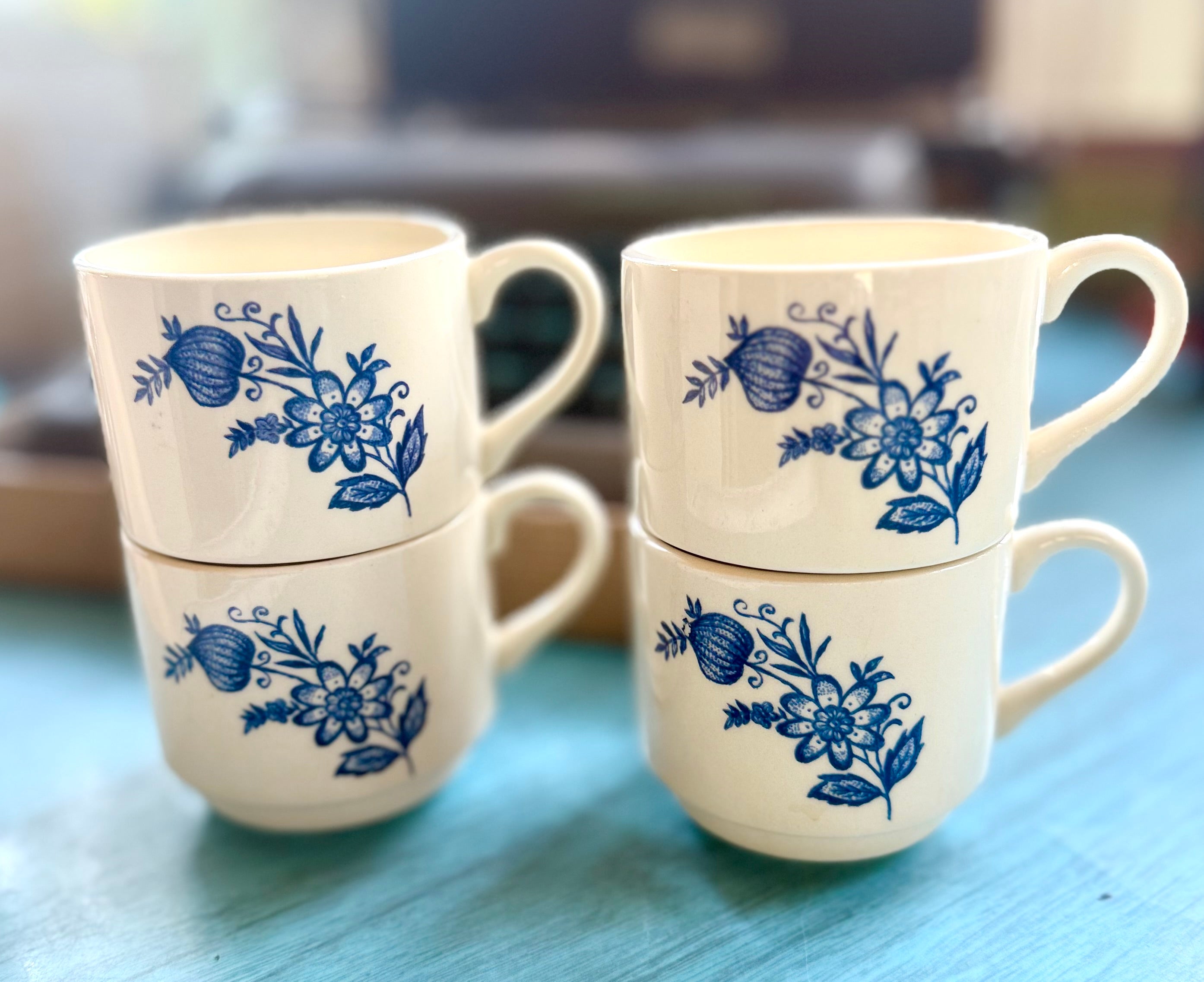 Charming set of 4 vintage stoneware stacking mugs, each featuring a blue folk-floral design on a cream base. Marked USA on the bottom, these mugs were made by an American pottery company in the mid-20th century. Their classic blue-and-white style pairs well with farmhouse, cottage, or mid-century kitchens.