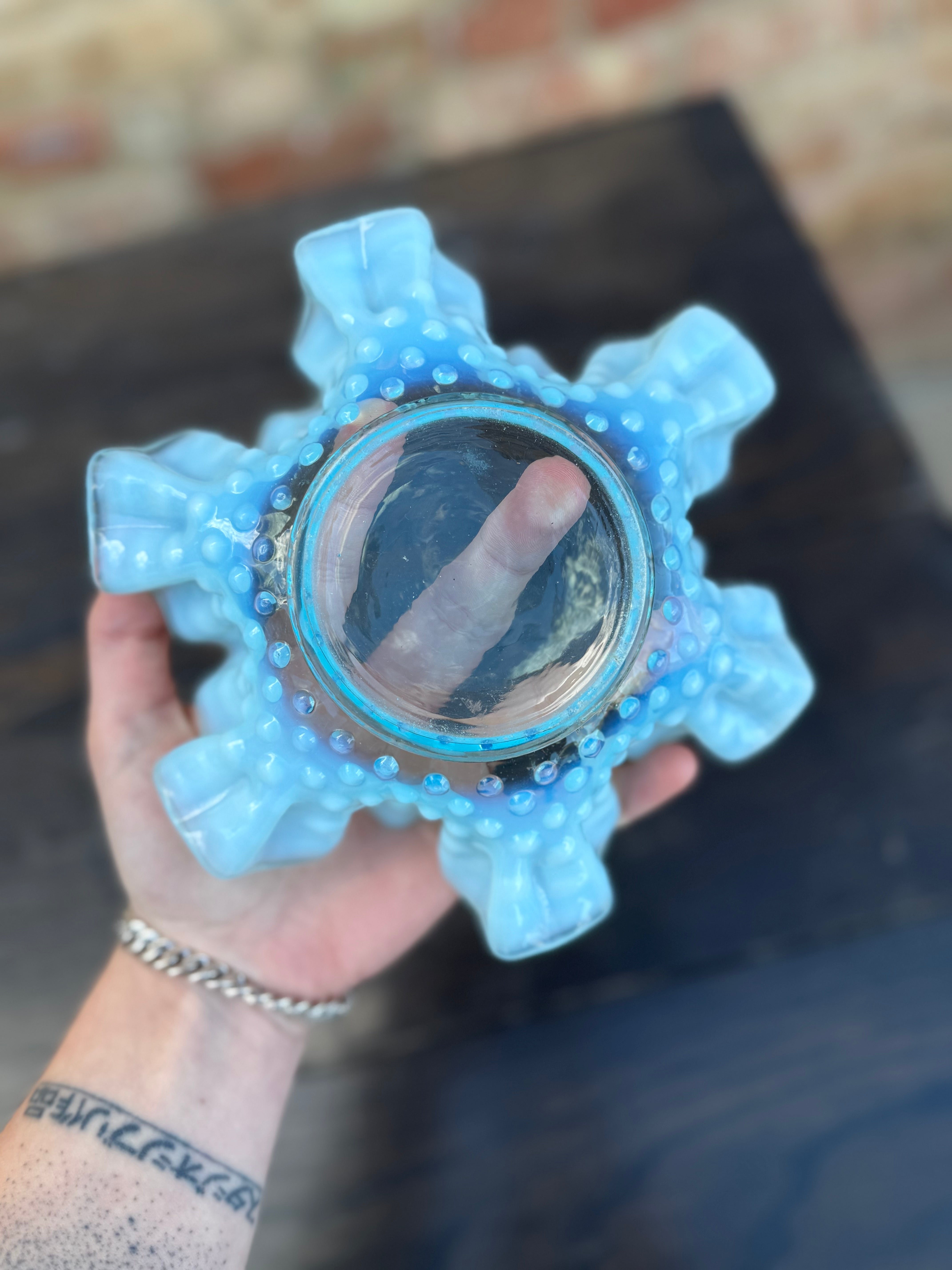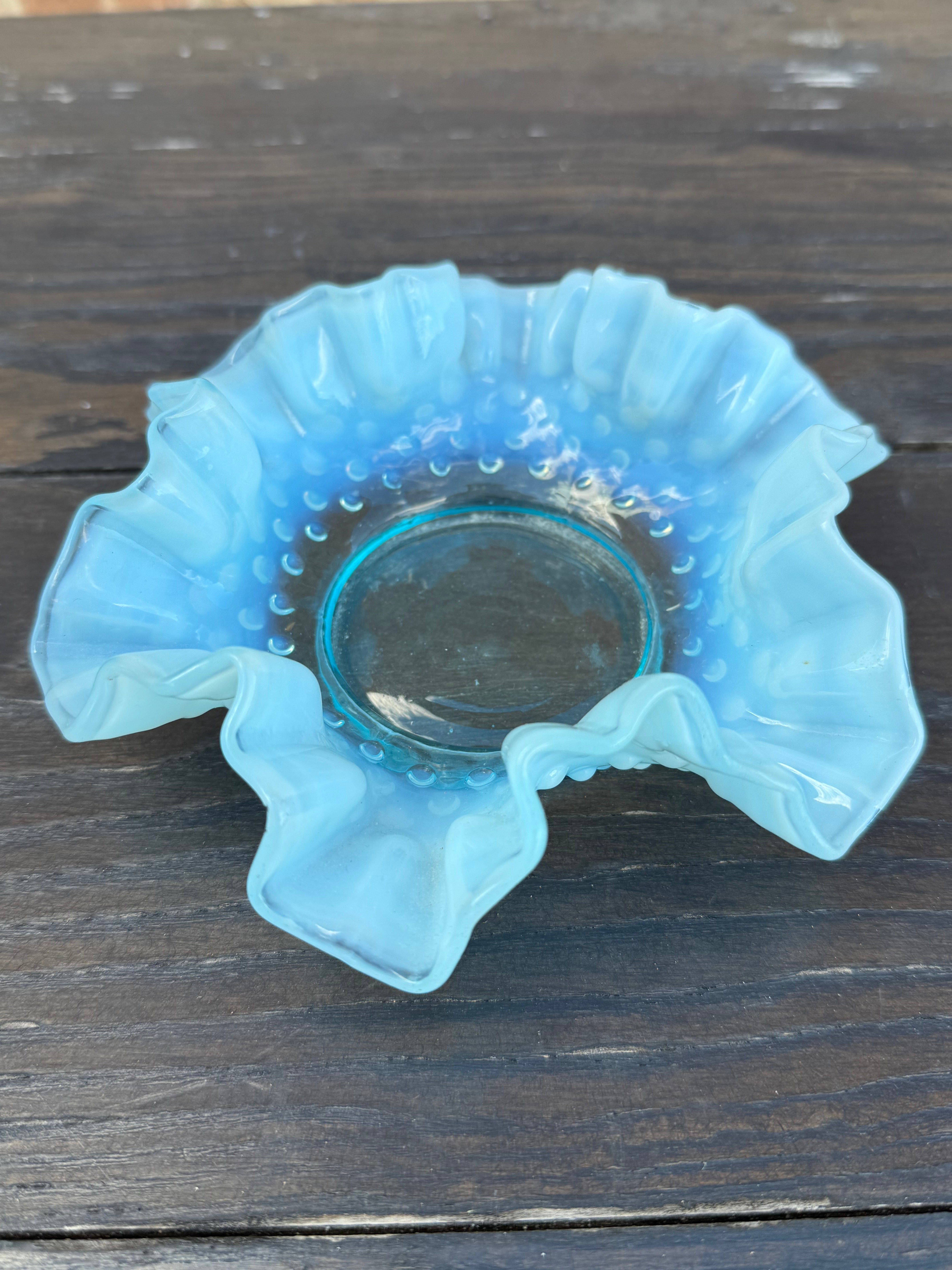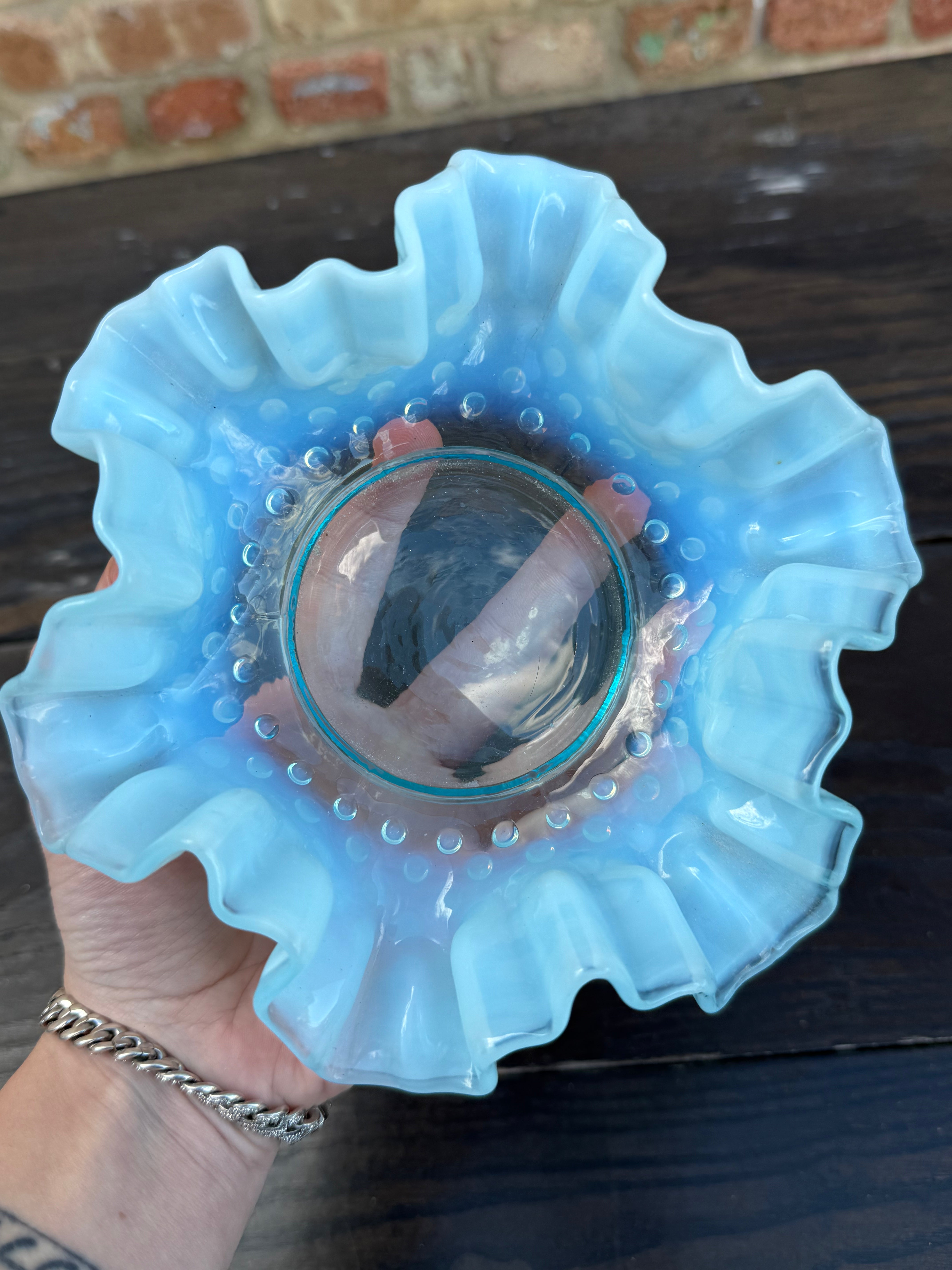 This stunning vintage blue opalescent glass bowl adds a splash of timeless charm to any collection. Featuring the iconic hobnail texture with a dramatic ruffled edge, the bowl glows with a dreamy gradient from pale blue to milky opalescent white.