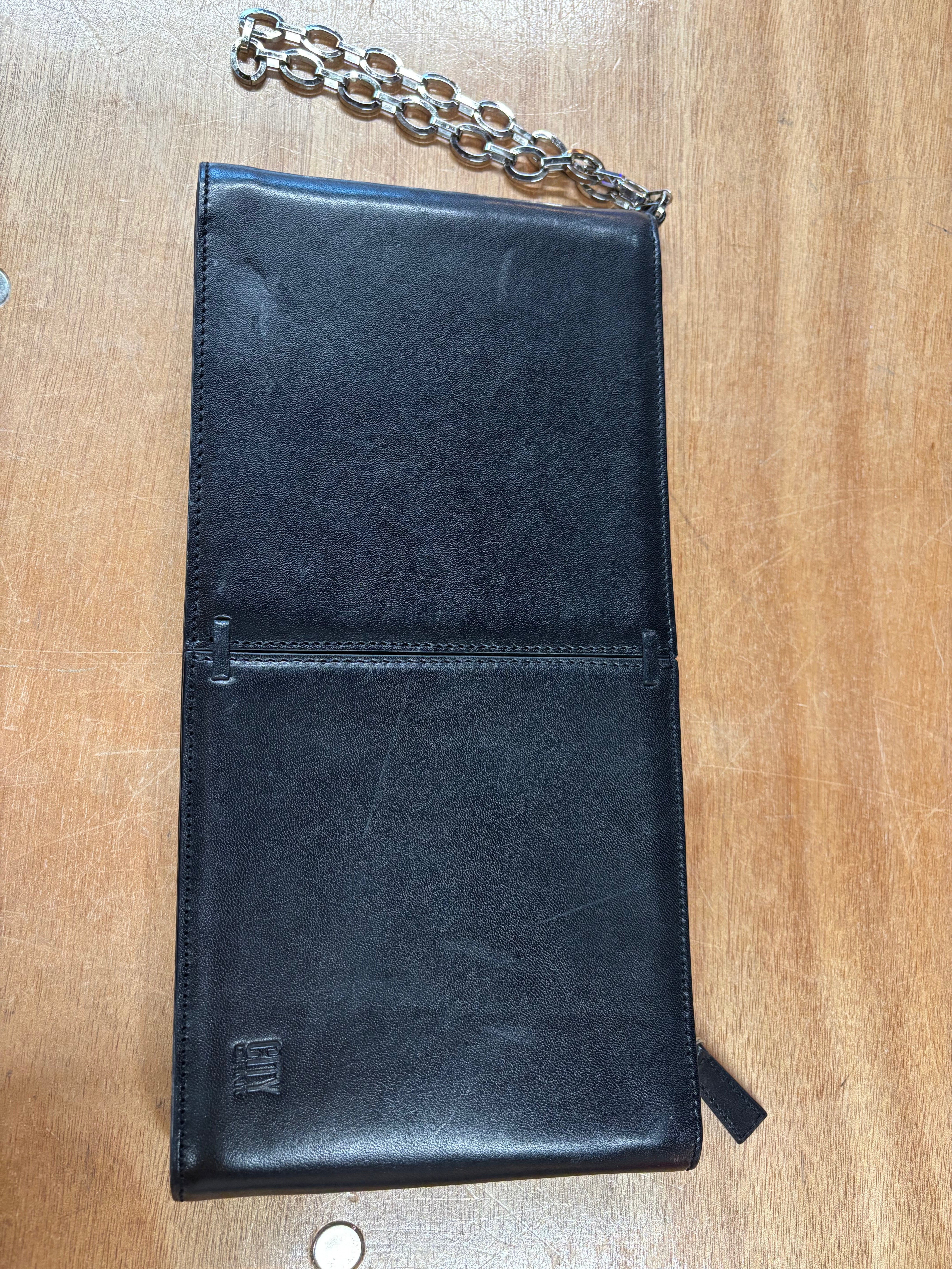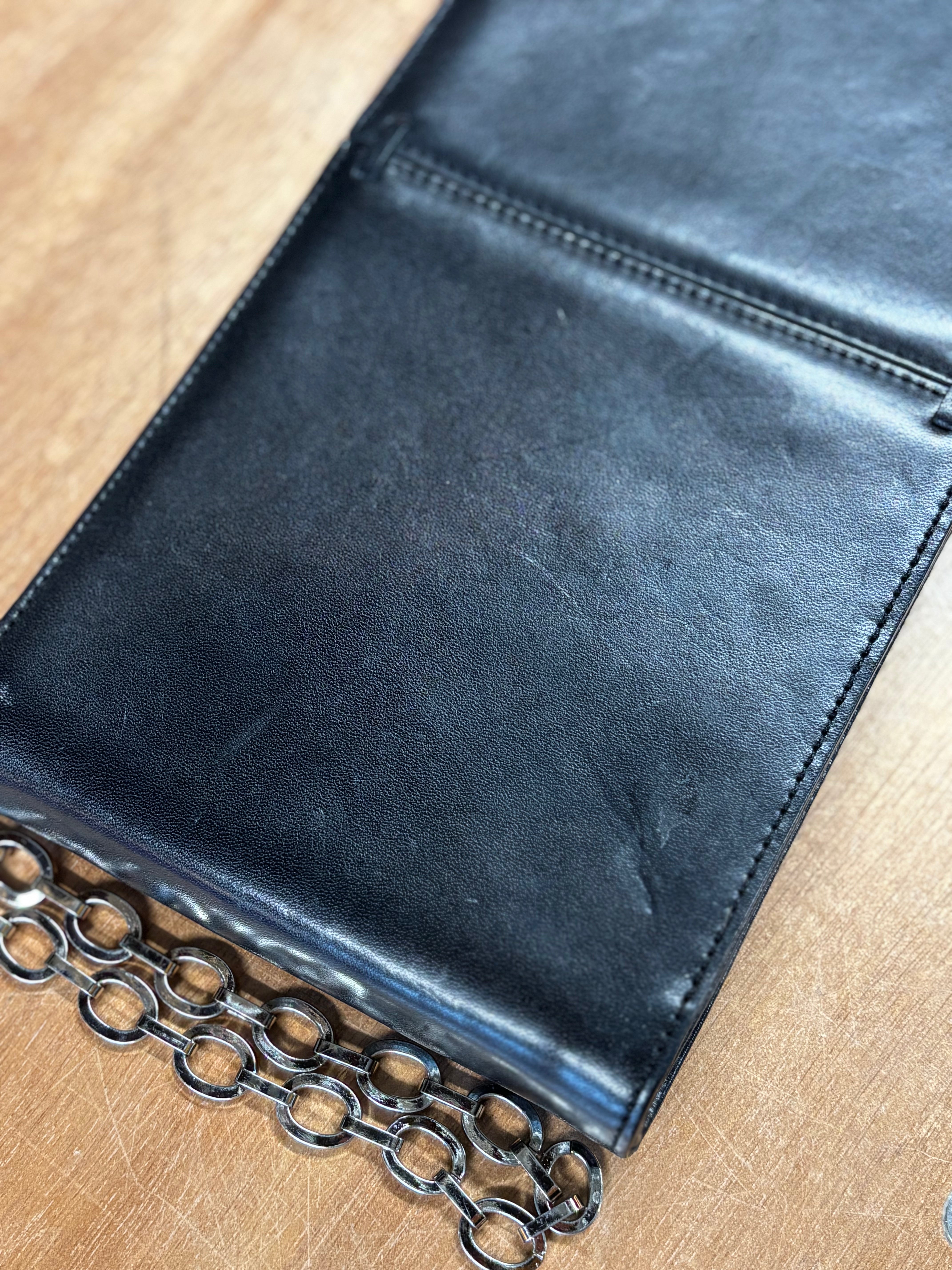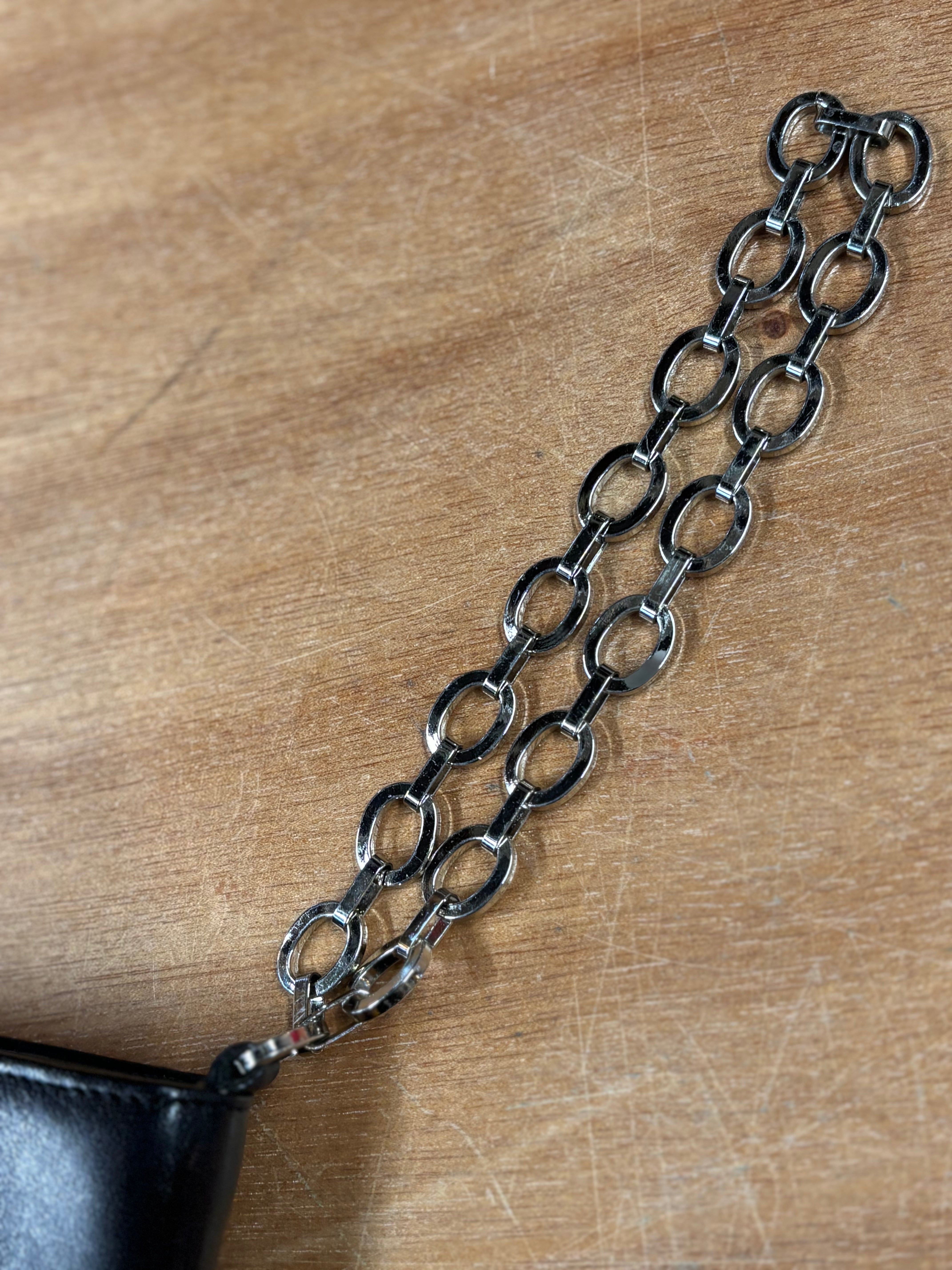 Minimalist and sophisticated, this City DKNY black leather shoulder bag captures the sleek, understated luxury of early-2000s New York fashion. Crafted from supple, high-quality leather with a smooth matte sheen and finished with a chunky silver-tone chain strap, it’s equal parts classic and modern.