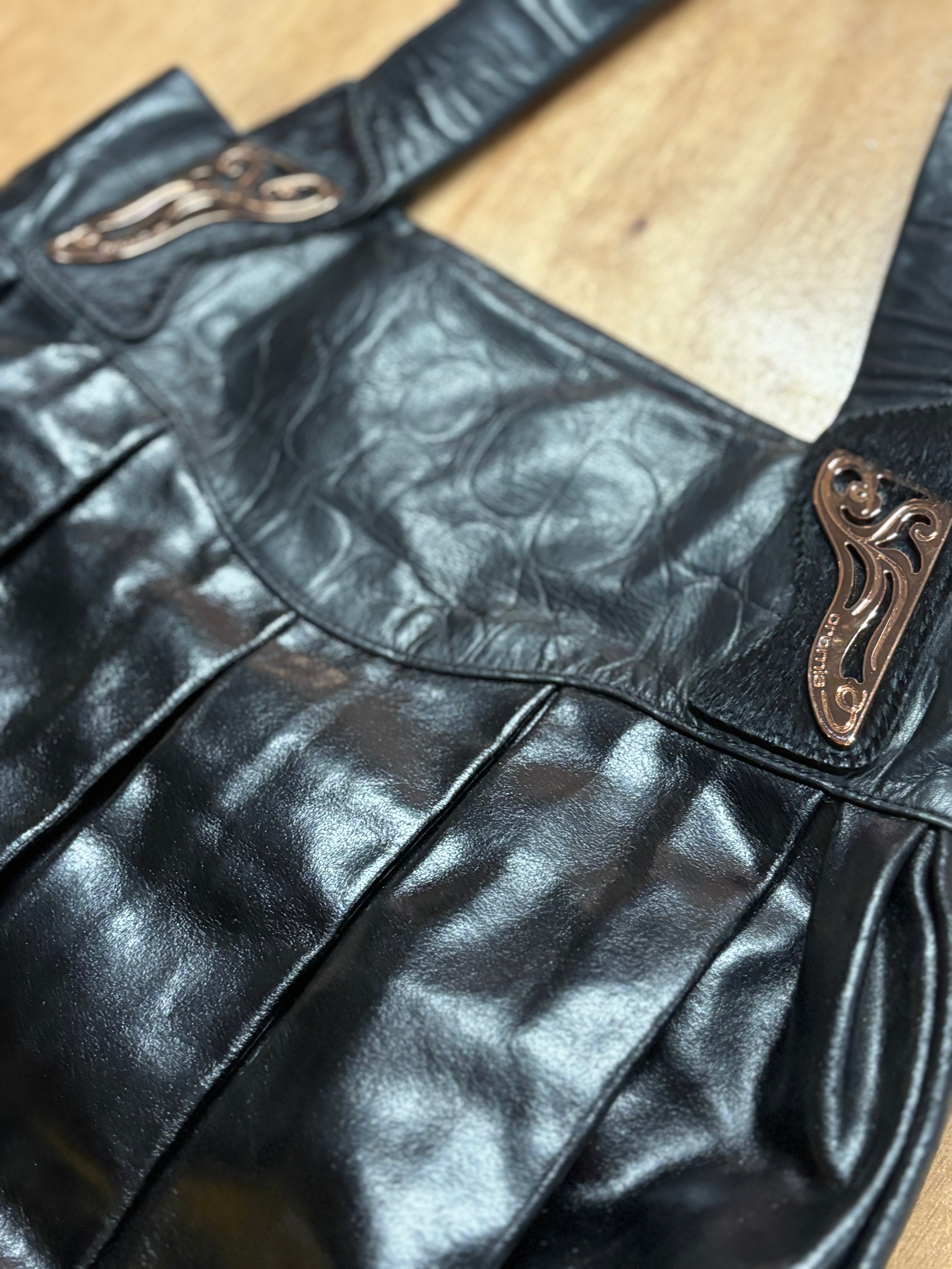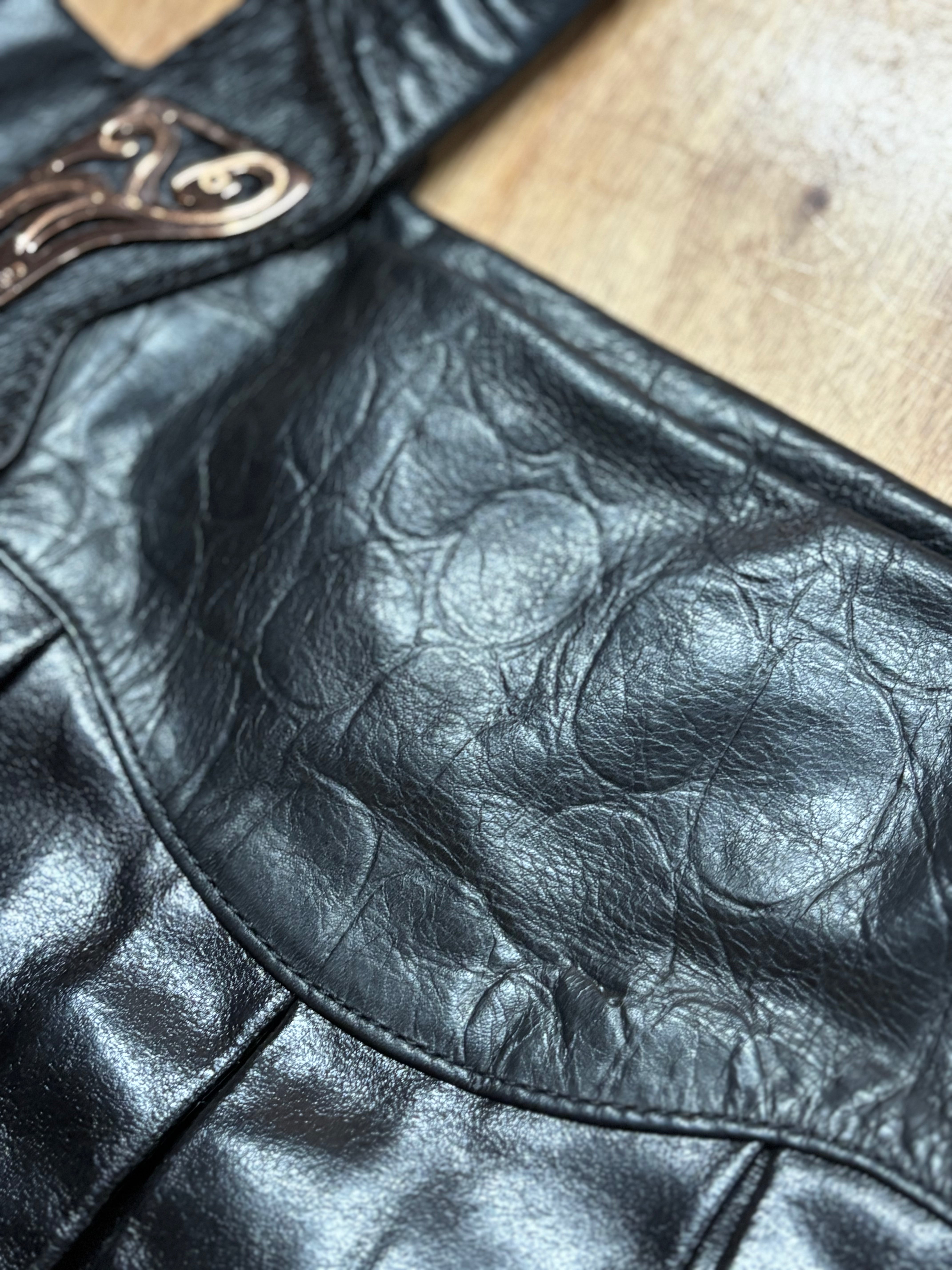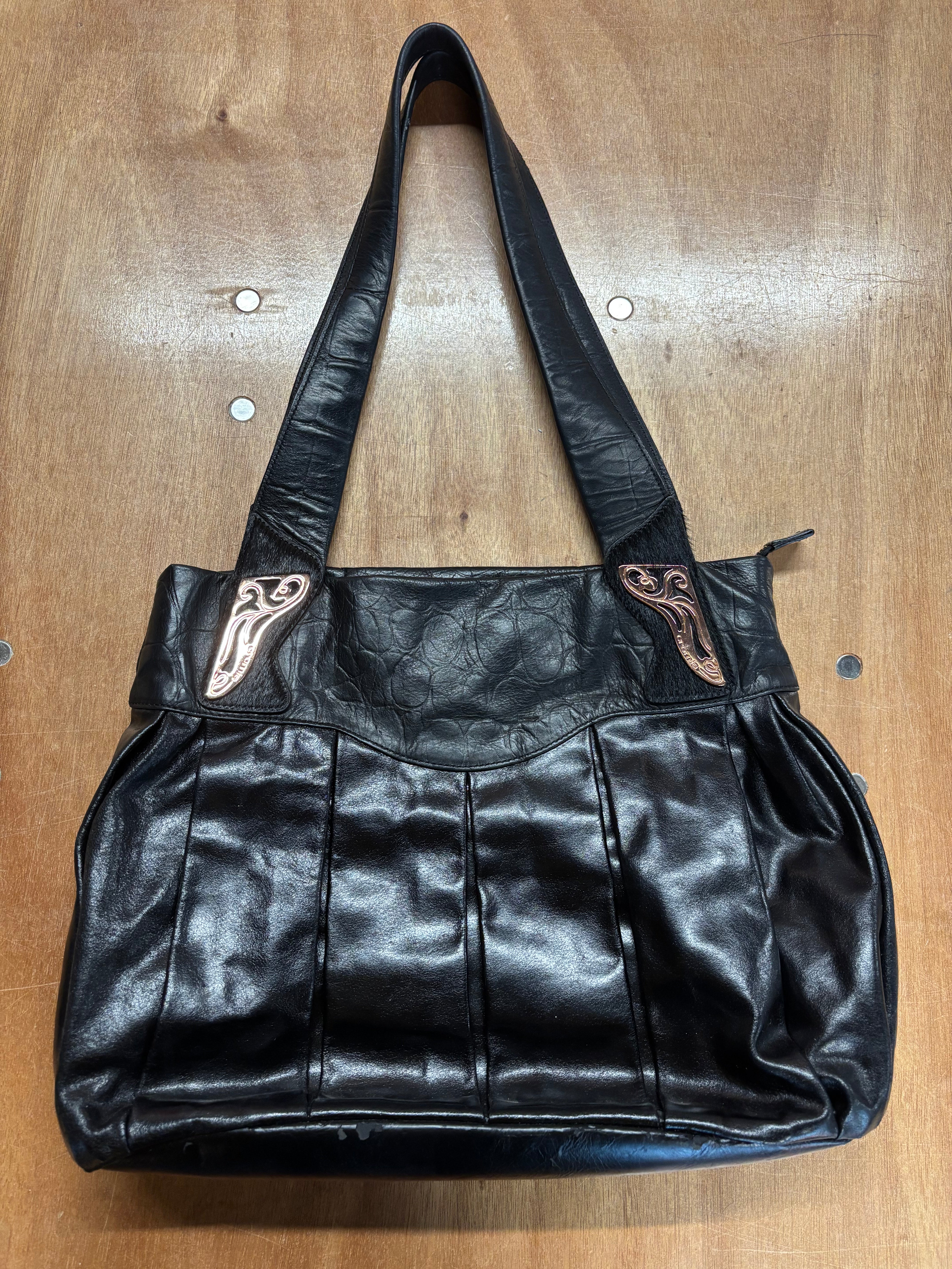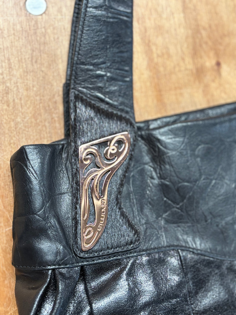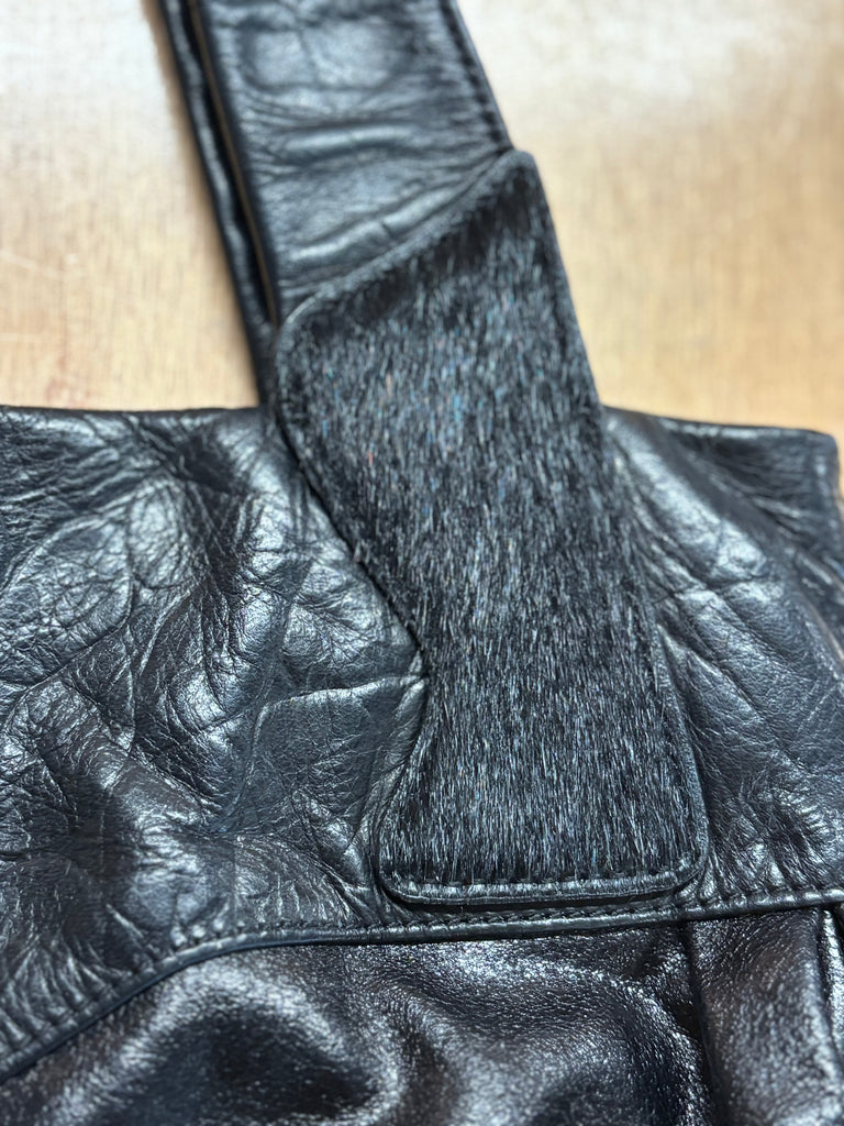 Elegant vintage Italian designer handbag by Cromia, crafted from genuine Italian leather with a striking mix of textures — smooth, supple black leather paired with panels of pony-hair cowhide for a subtle sheen and depth.
