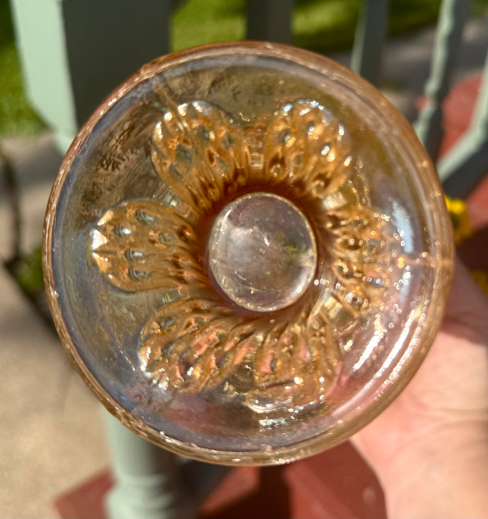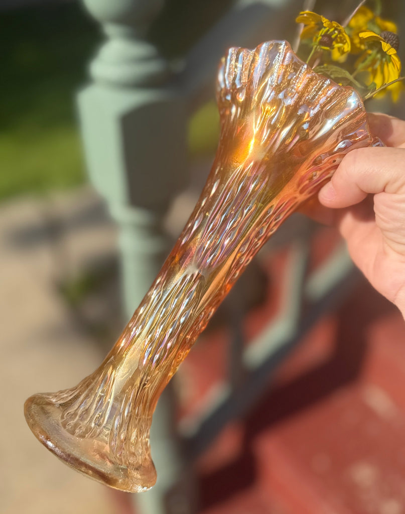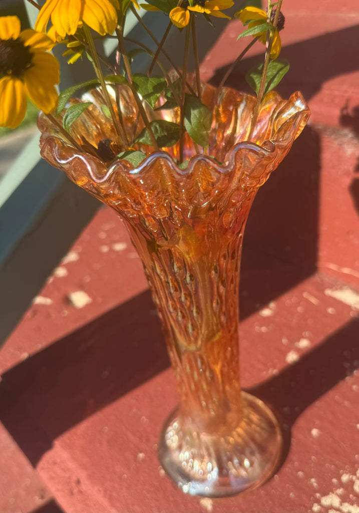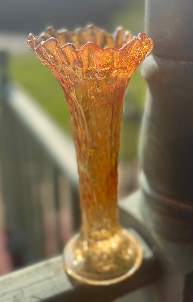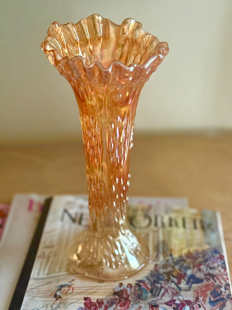 Add a touch of vintage sparkle to your home décor with this stunning carnival glass vase. Made by Fenton in the early 20th century, this tall trumpet-style vase features a rich marigold iridescence with a ruffled top edge and textured body. A beautiful example of American pressed glass artistry, perfect for displaying fresh flowers or as a collectible display piece.
