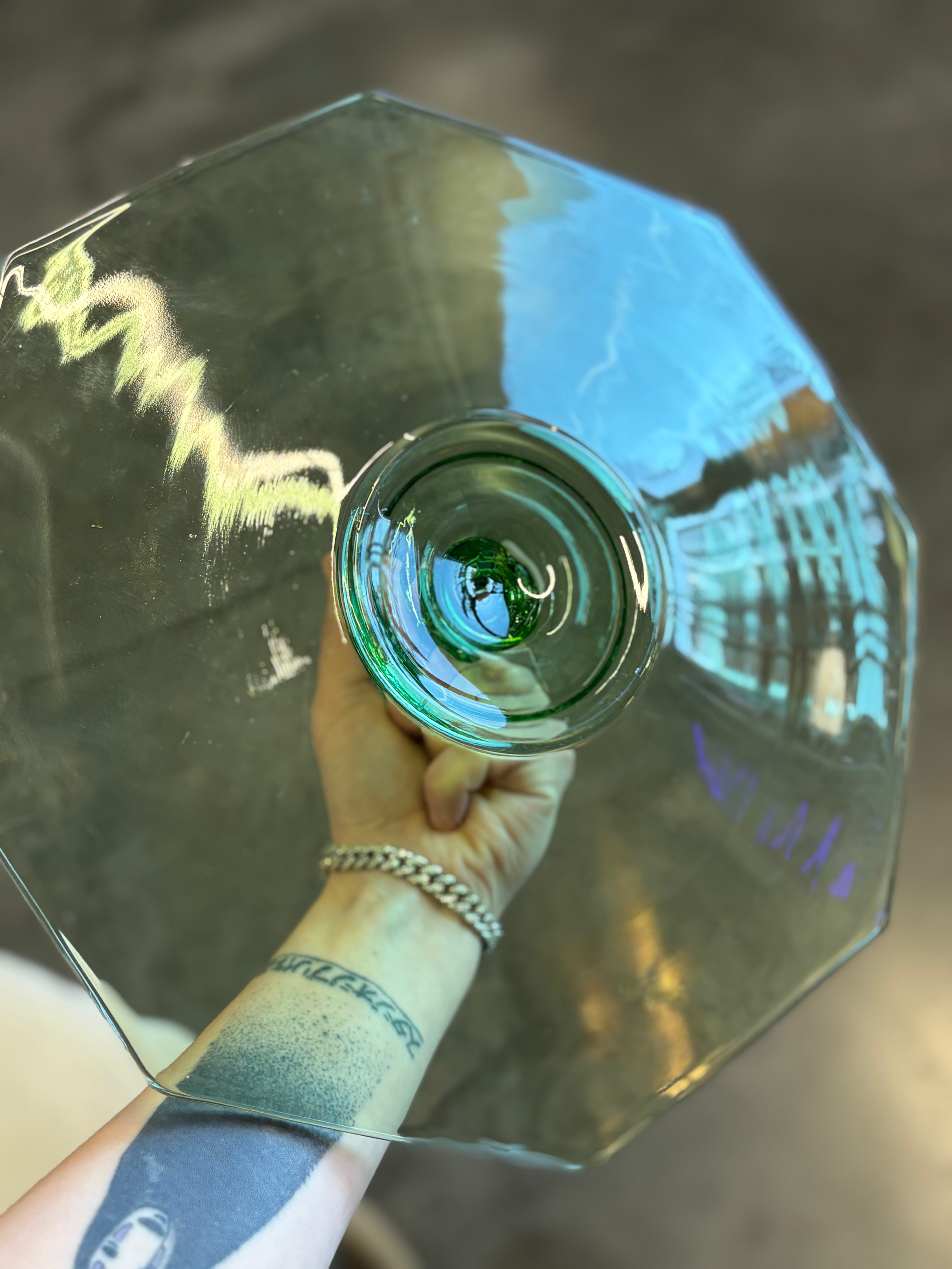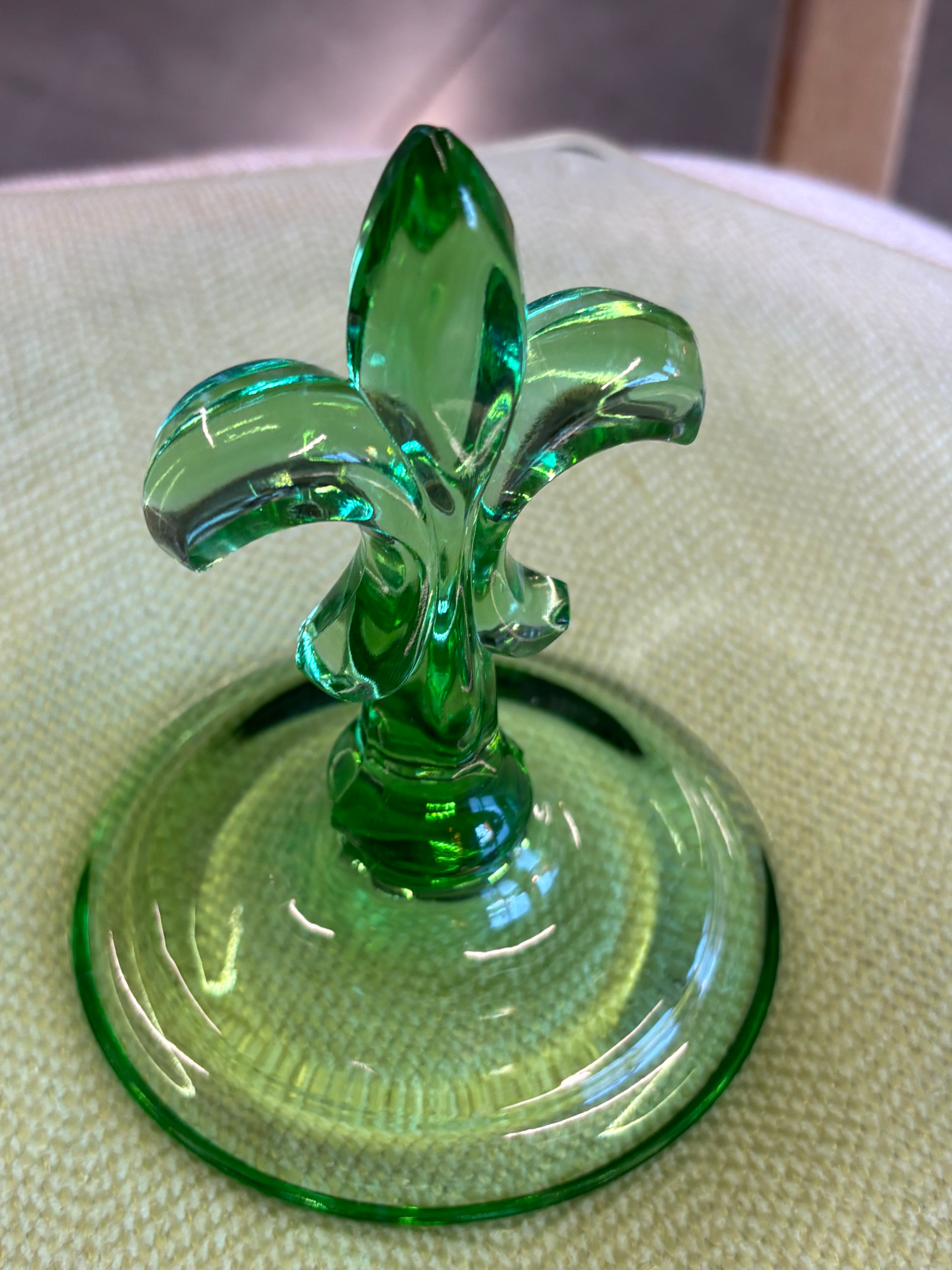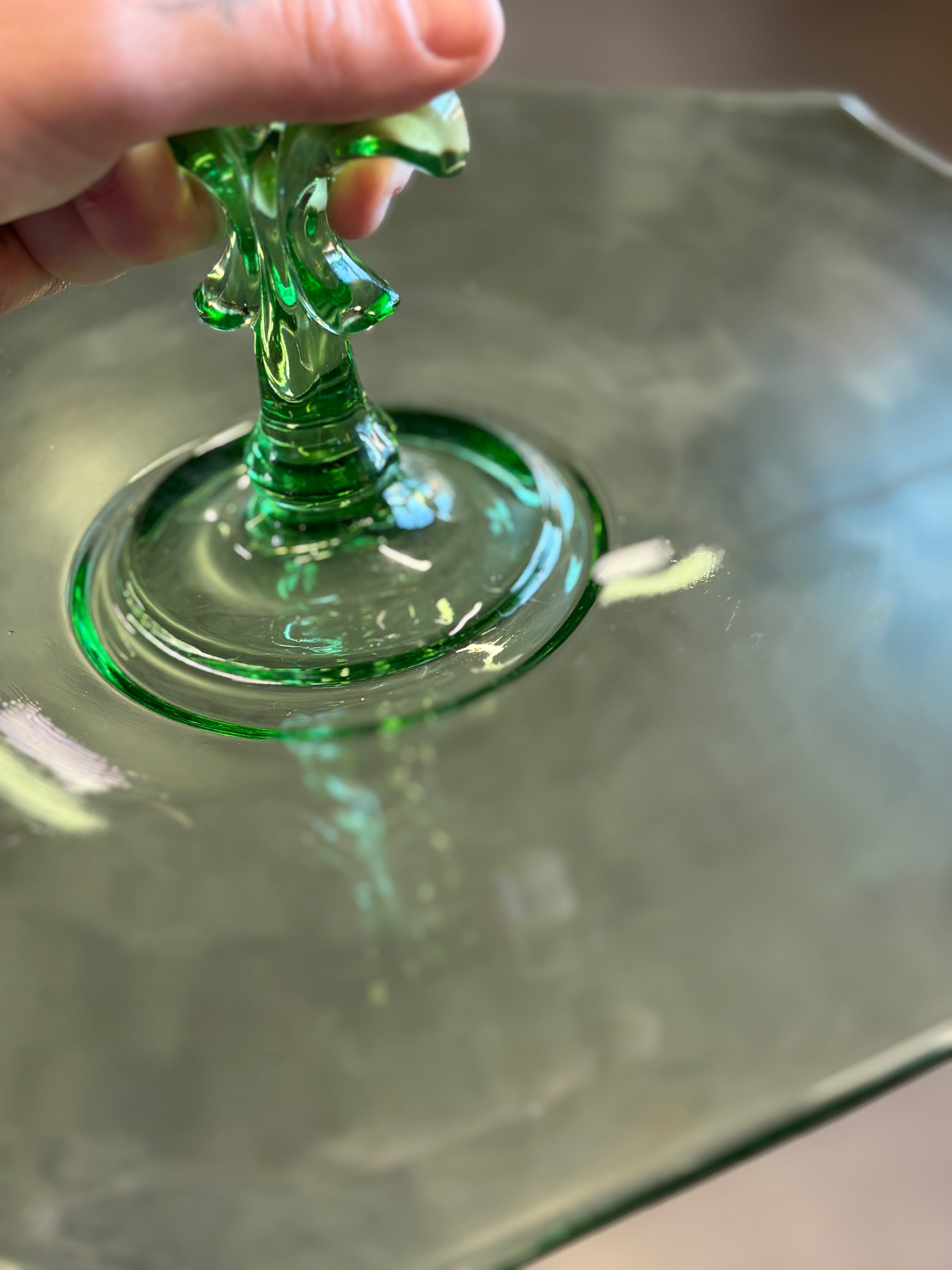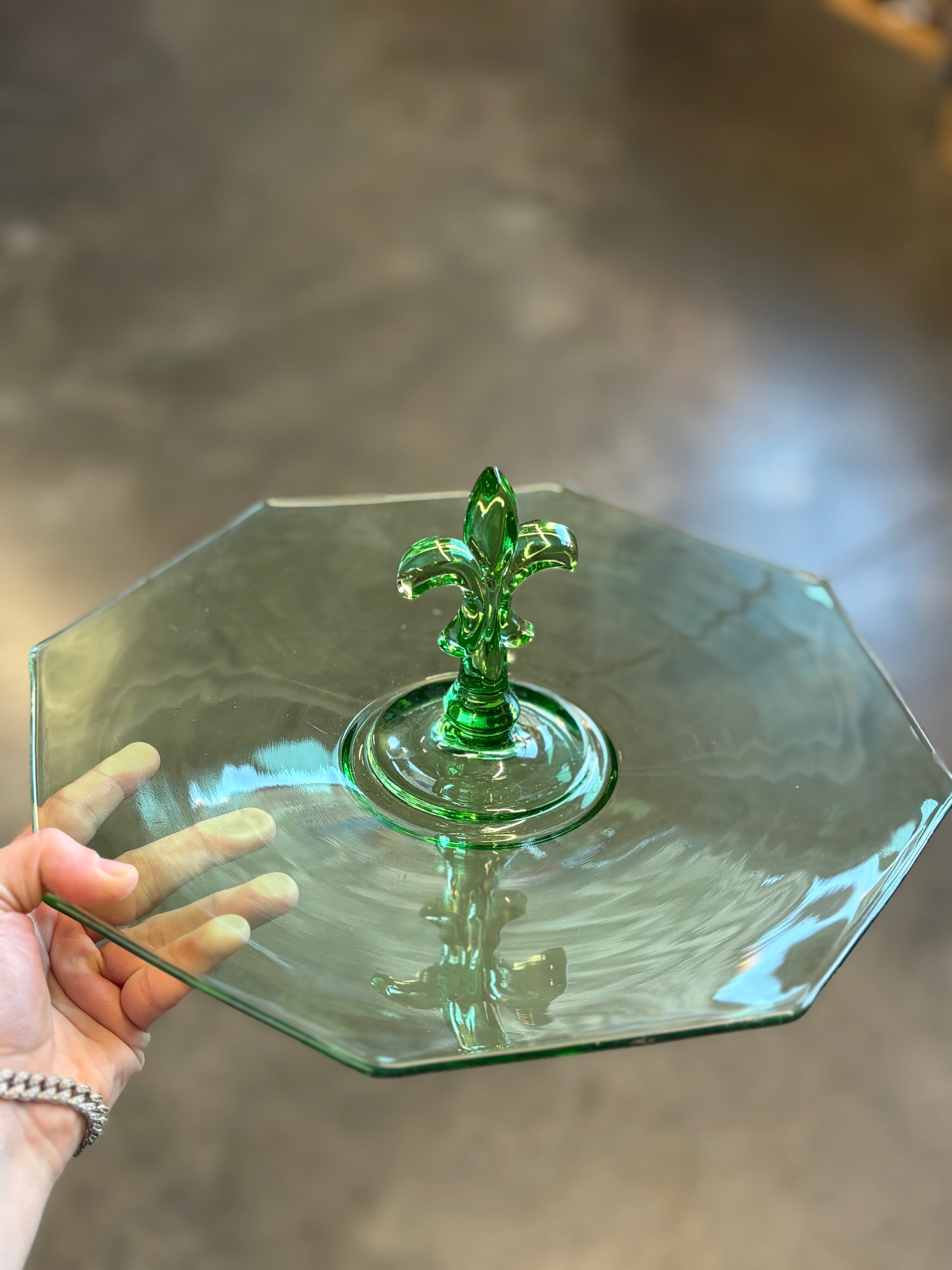 Add a touch of vintage elegance to your table with this stunning emerald green glass pedestal plate featuring a fleur-de-lis handle. With its unique octagonal shape and midcentury design, this 11.5-inch plate is perfect for serving pastries, desserts, or displaying decor. The raised fleur-de-lis center gives it a regal and sculptural touch — a true conversation piece for your kitchen or display cabinet.