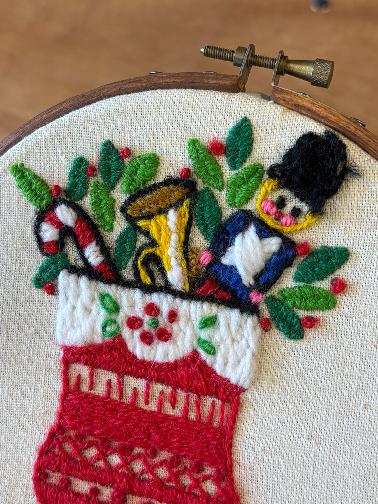 Charming vintage hand-embroidered Christmas wall art featuring a bright red stocking filled with festive holiday treasures — a toy soldier, trumpet, and candy cane surrounded by holly leaves and berries. Set in a classic wooden embroidery hoop with the original paper backing intact, this handmade piece brings nostalgic warmth to any holiday display.