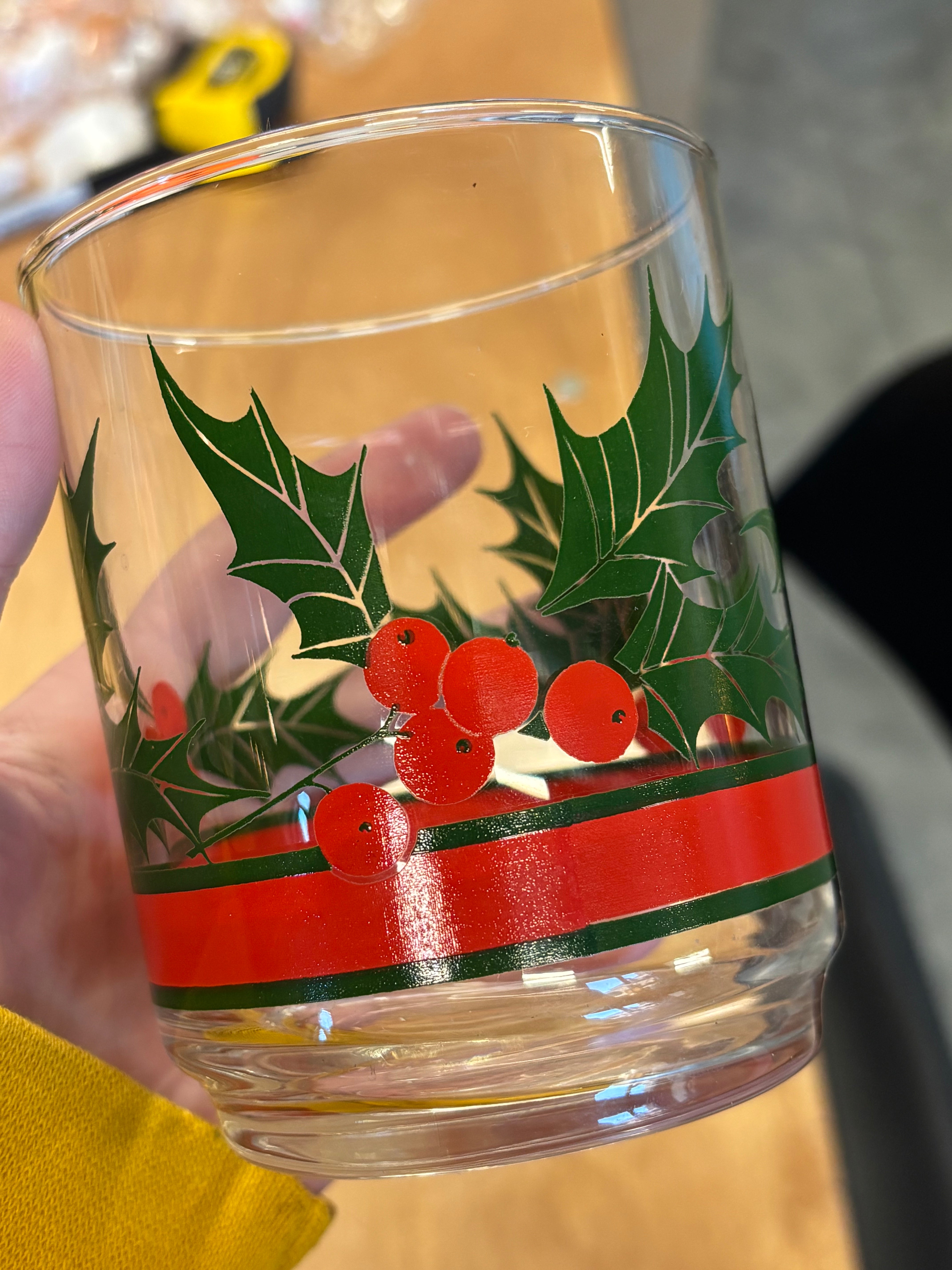 Bring some nostalgic holiday charm to your table with this set of 4 vintage Christmas glasses, featuring a bright red and green holly berry design wrapped around each tumbler. The bold, cheerful print and classic mid-century shape make these perfect for eggnog, cocktails, or festive punch.