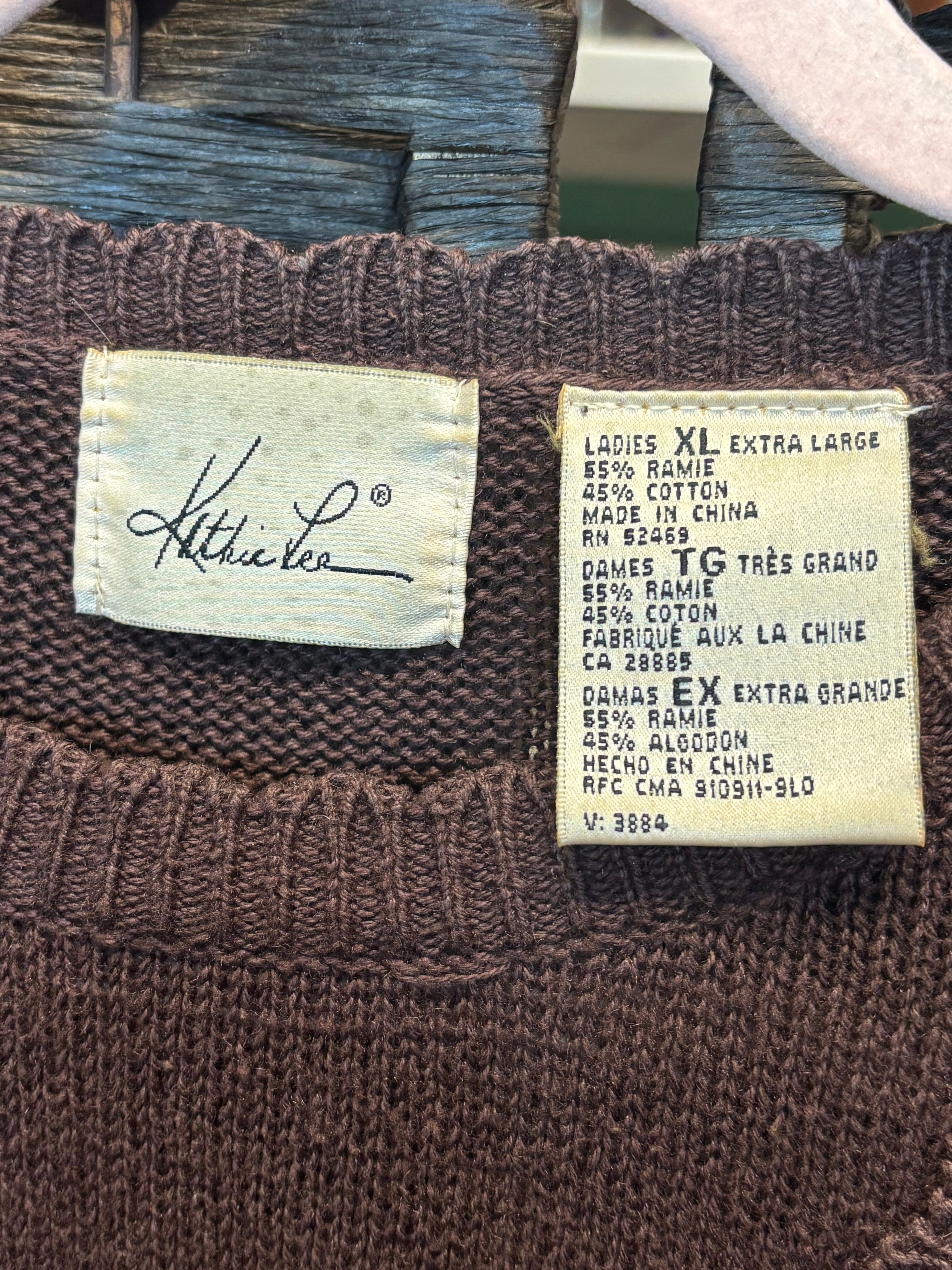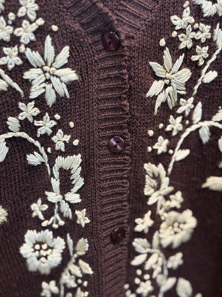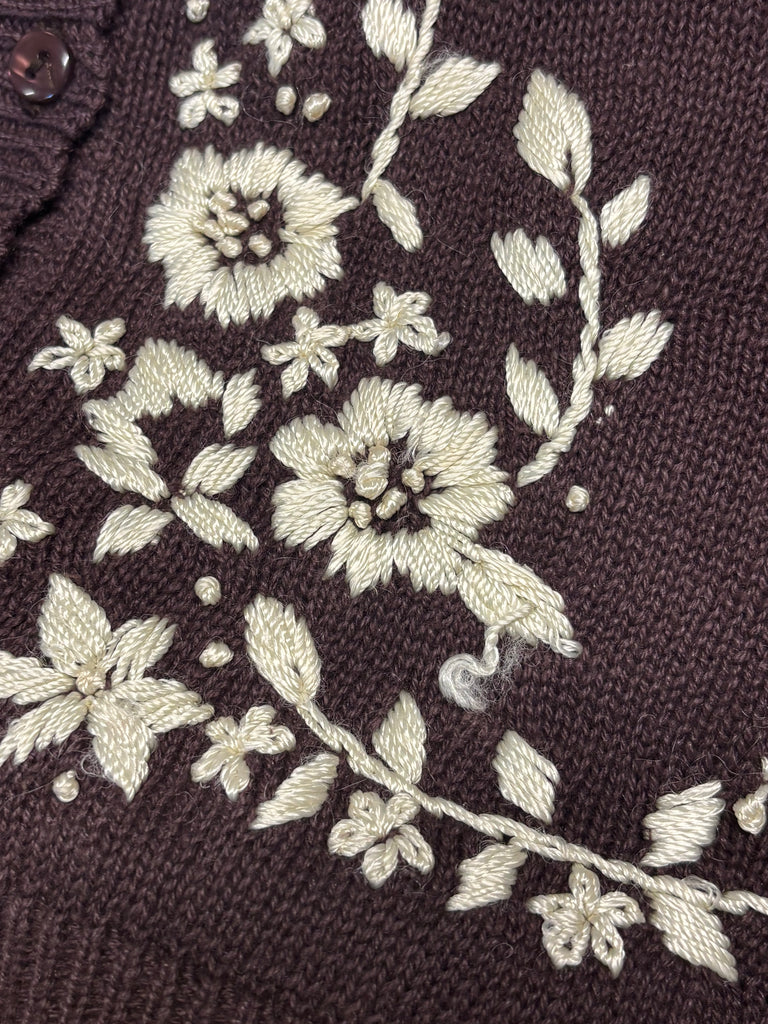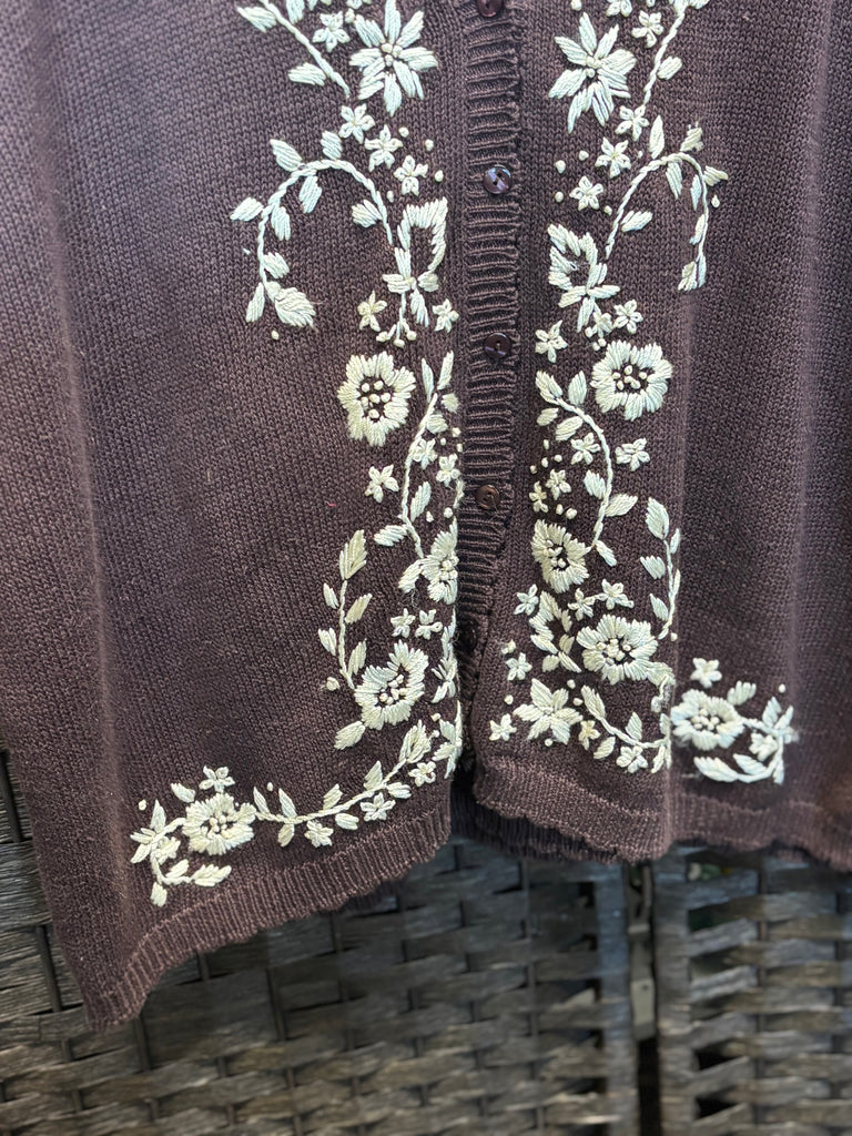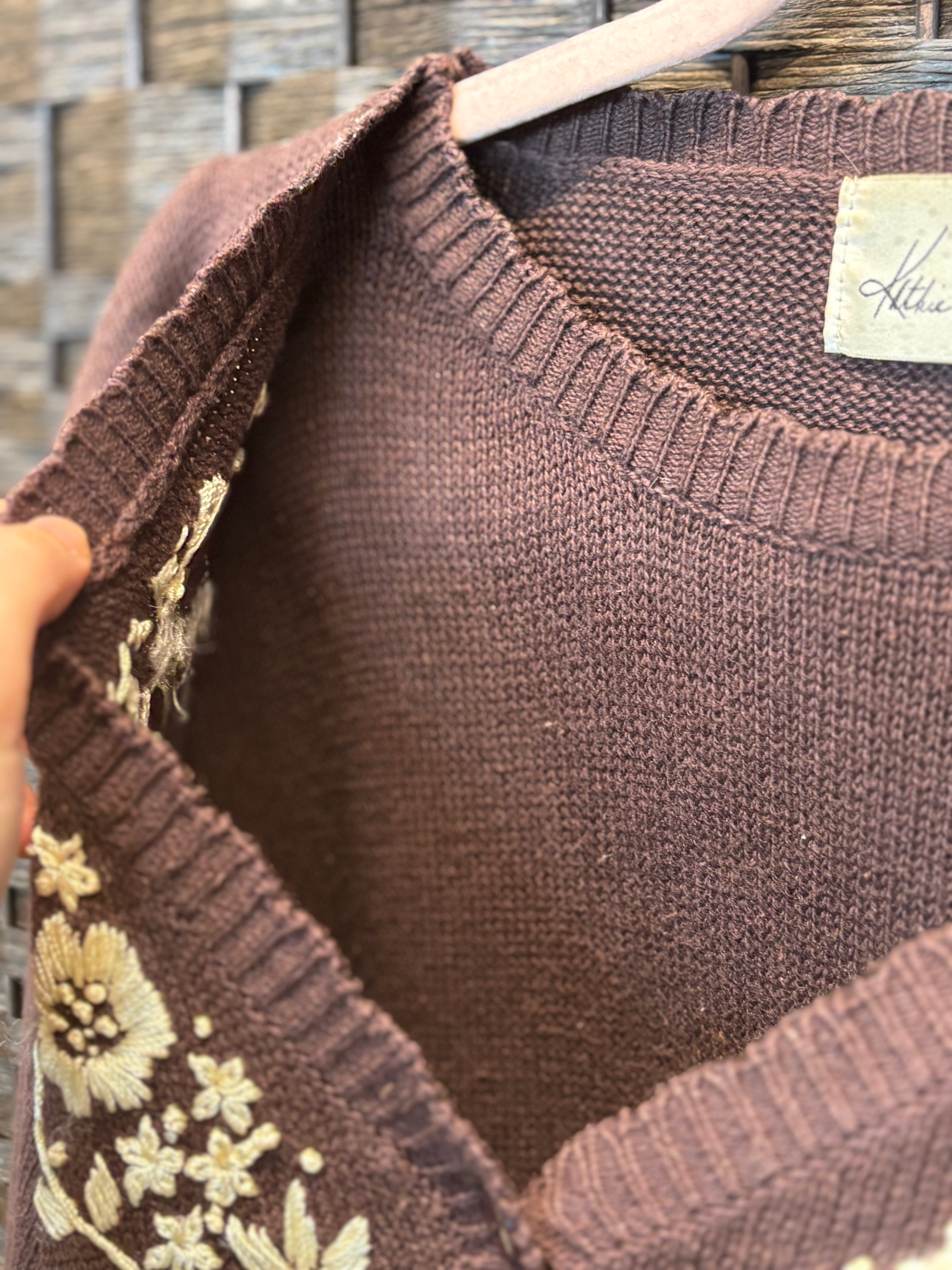 This vintage Kathie Lee knit sweater is cozy, classic, and beautifully detailed. Crafted in a warm chocolate-brown tone, it features cream floral embroidery cascading down the front and hem. The design includes an attached knit undershirt, giving it a layered look without extra bulk. Perfect for fall or winter, this piece has a timeless, cottagecore-inspired charm that pairs effortlessly with denim or skirts.