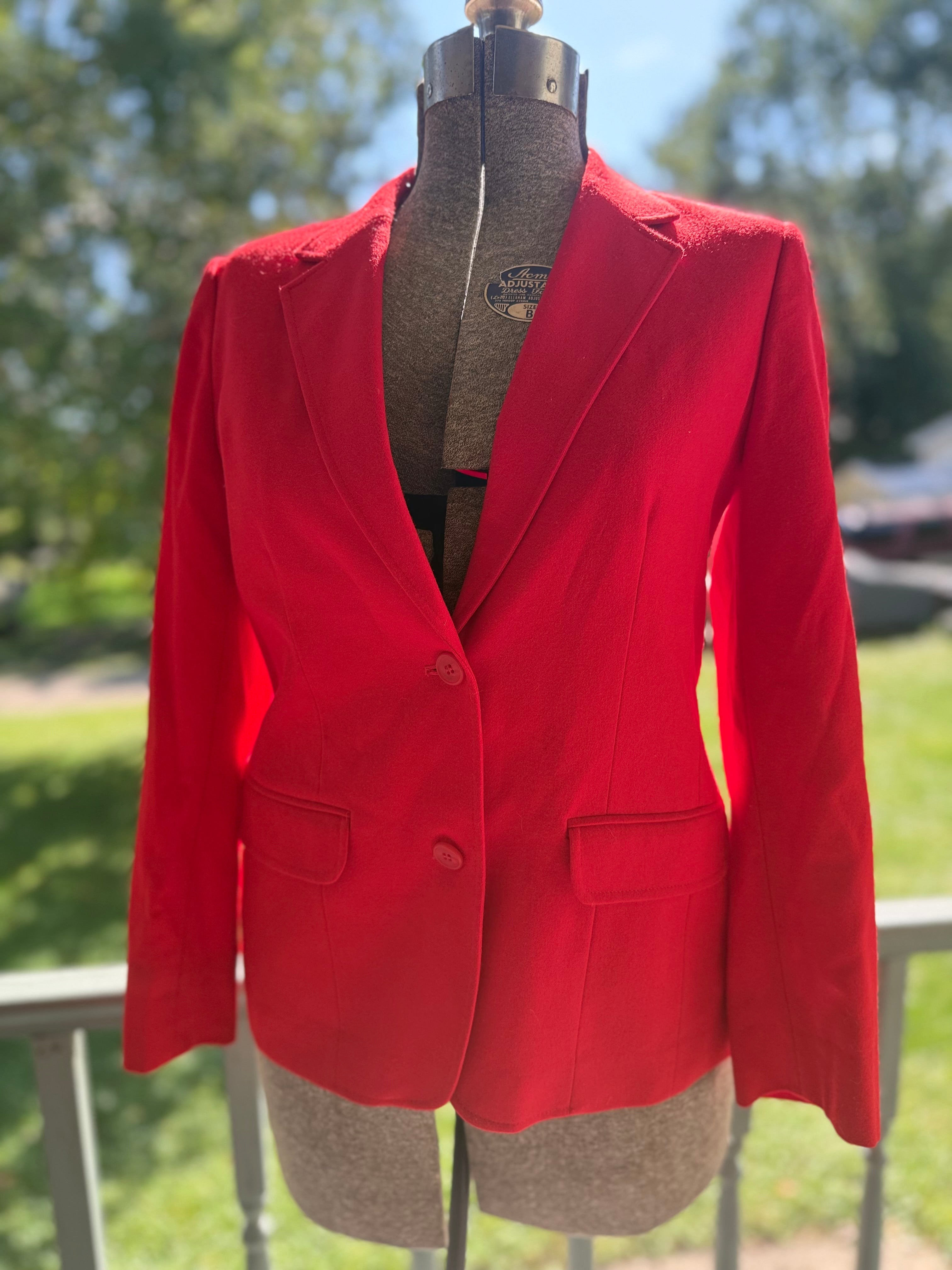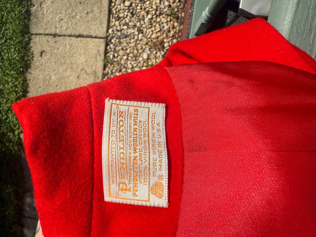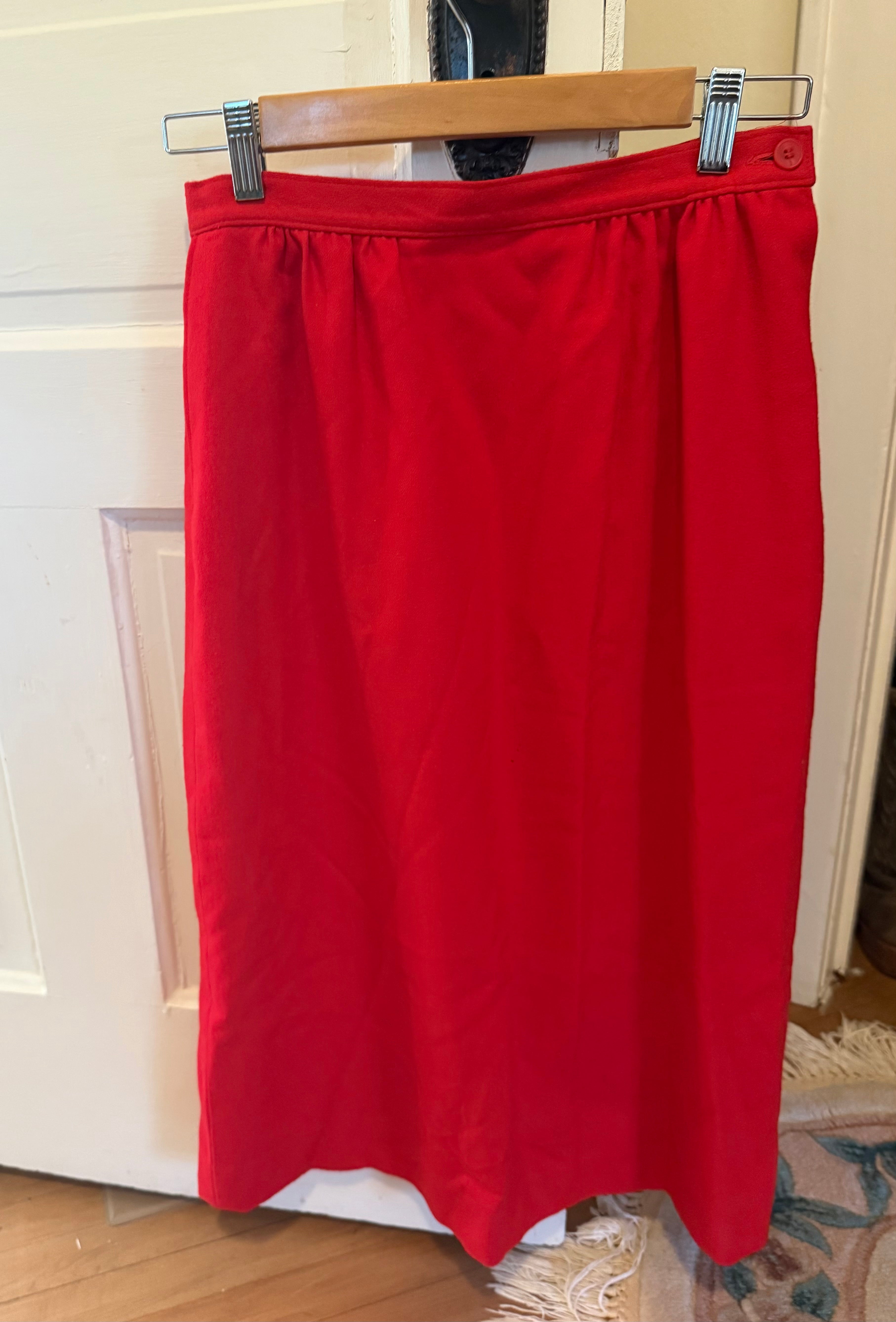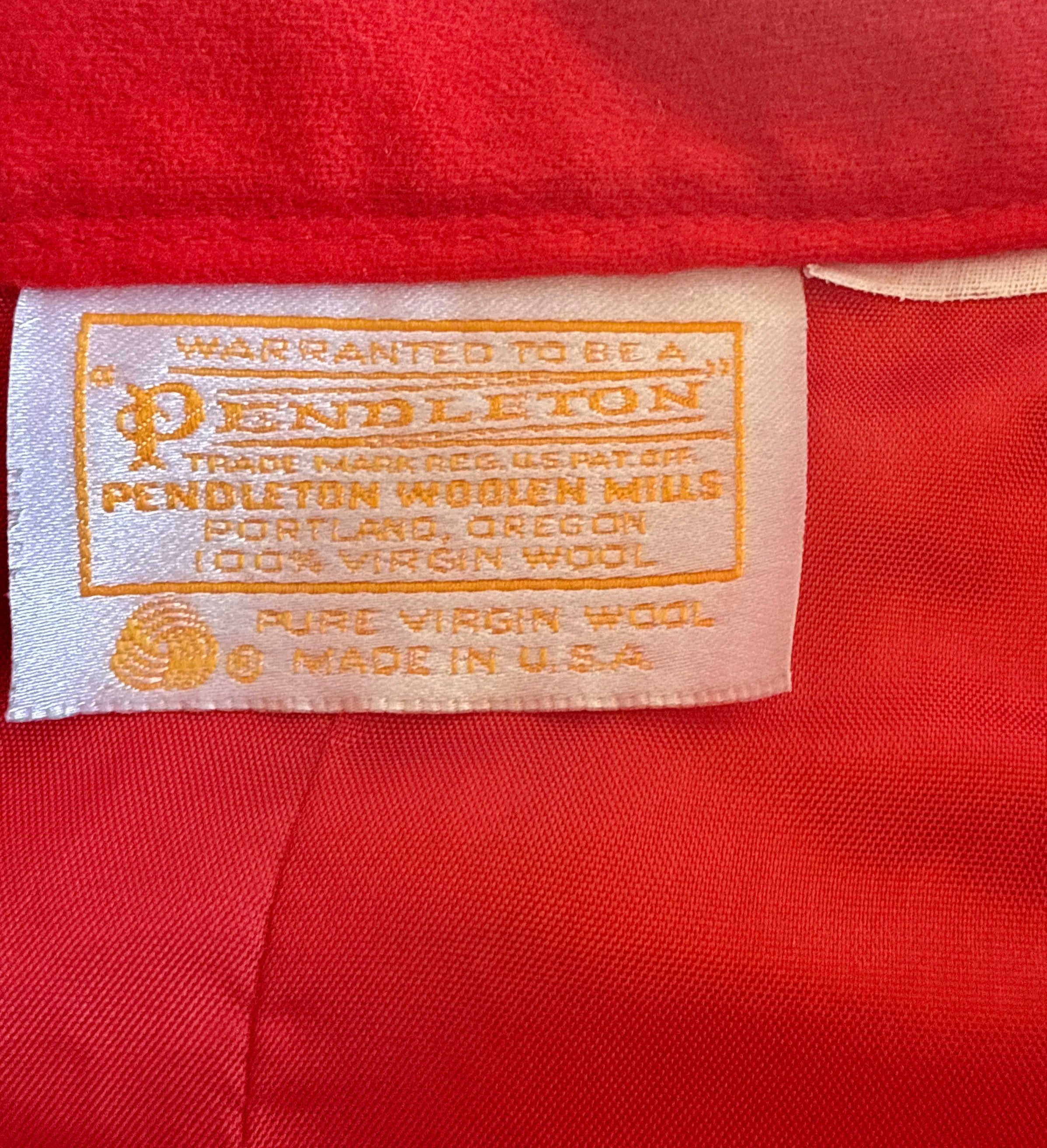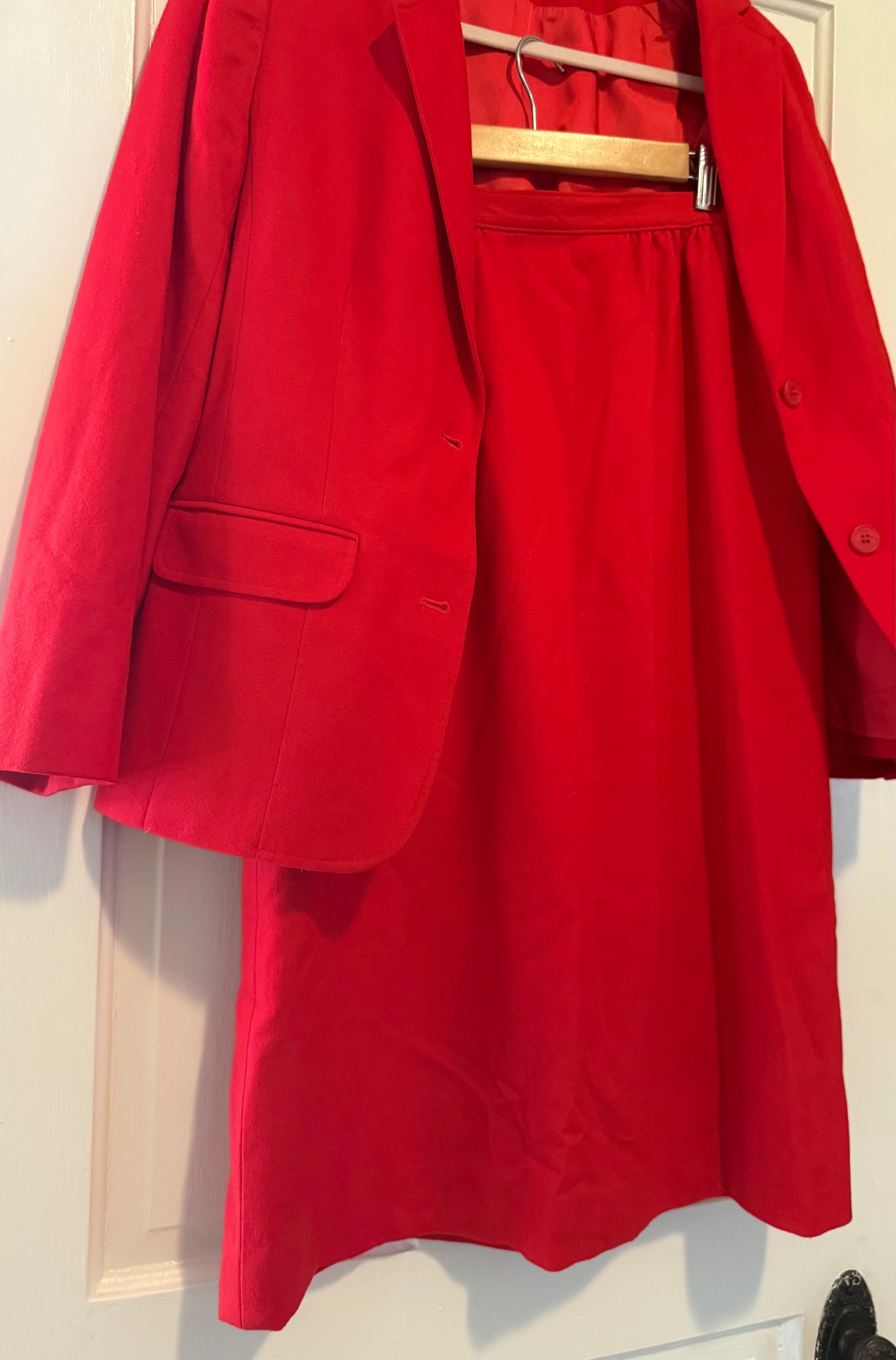 Stand out in timeless style with this stunning vintage Pendleton two-piece skirt suit. Crafted in the USA from pure virgin wool, this bold red ensemble includes a tailored two-button blazer and matching A-line skirt. The classic silhouette and Pendleton’s signature quality make this set perfect for business, special occasions, or as a statement vintage look.