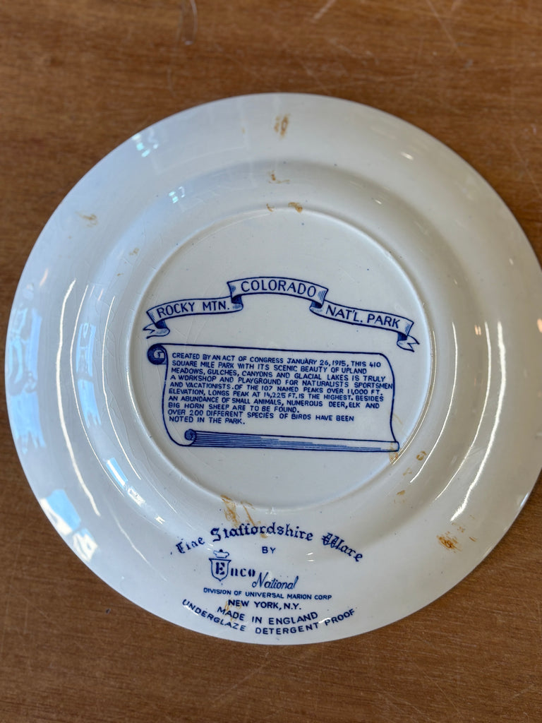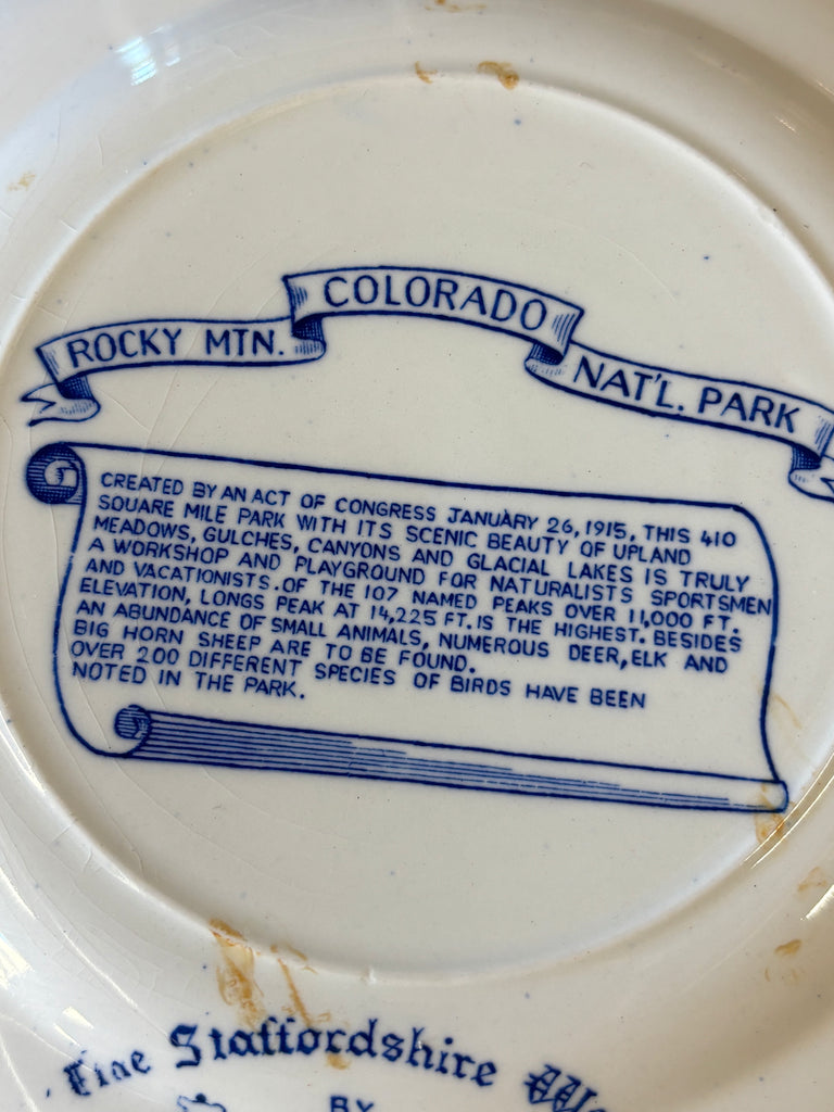 Bring a touch of American history and English craftsmanship to your collection with this vintage souvenir plate featuring Rocky Mountain National Park, Colorado.