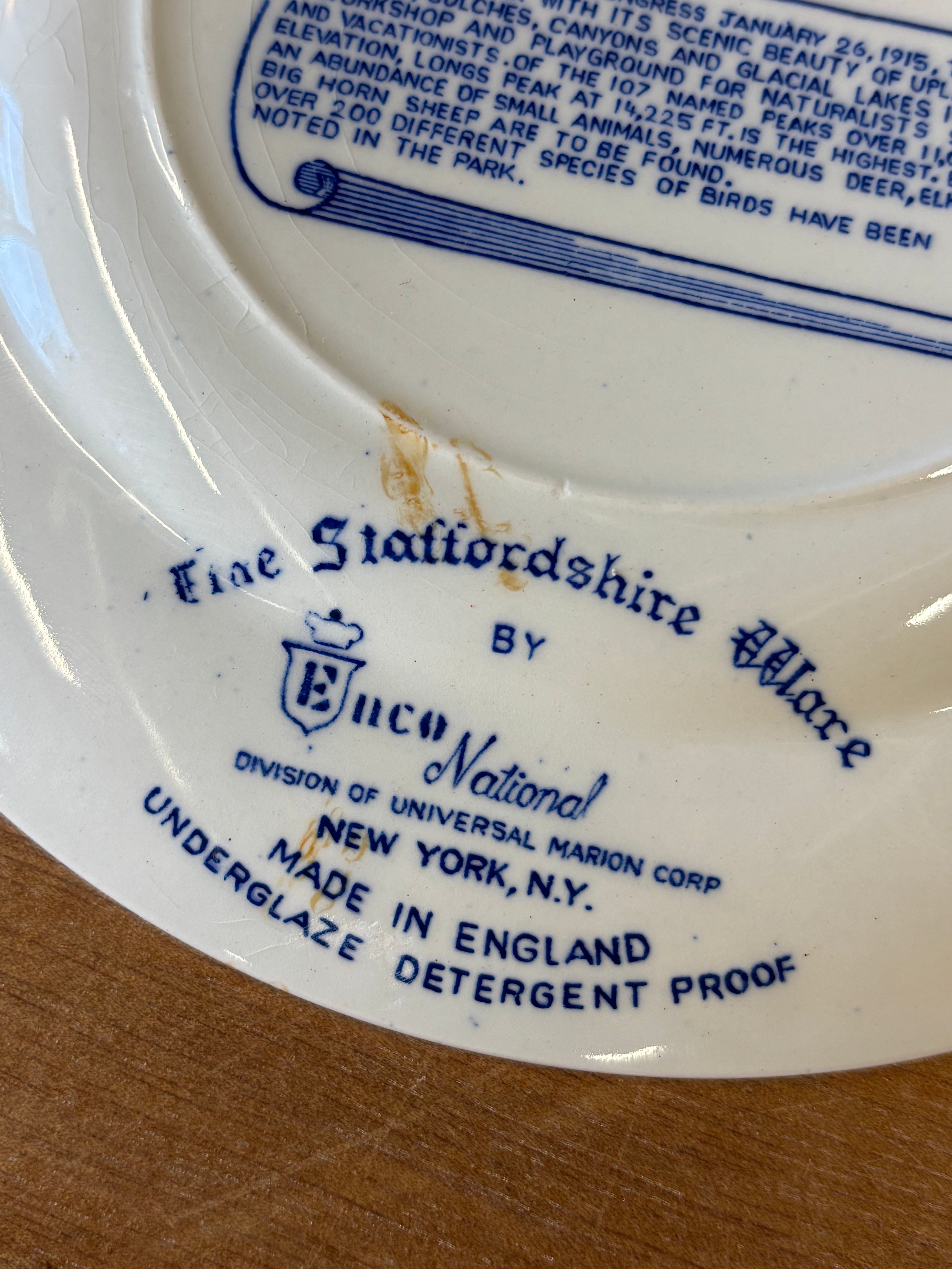 Made by Enco National (Division of Universal Marion Corp., New York) in England, this Staffordshire Ware plate displays a stunning blue-and-white transferware scene of Bear Lake and Long’s Peak surrounded by a floral border.