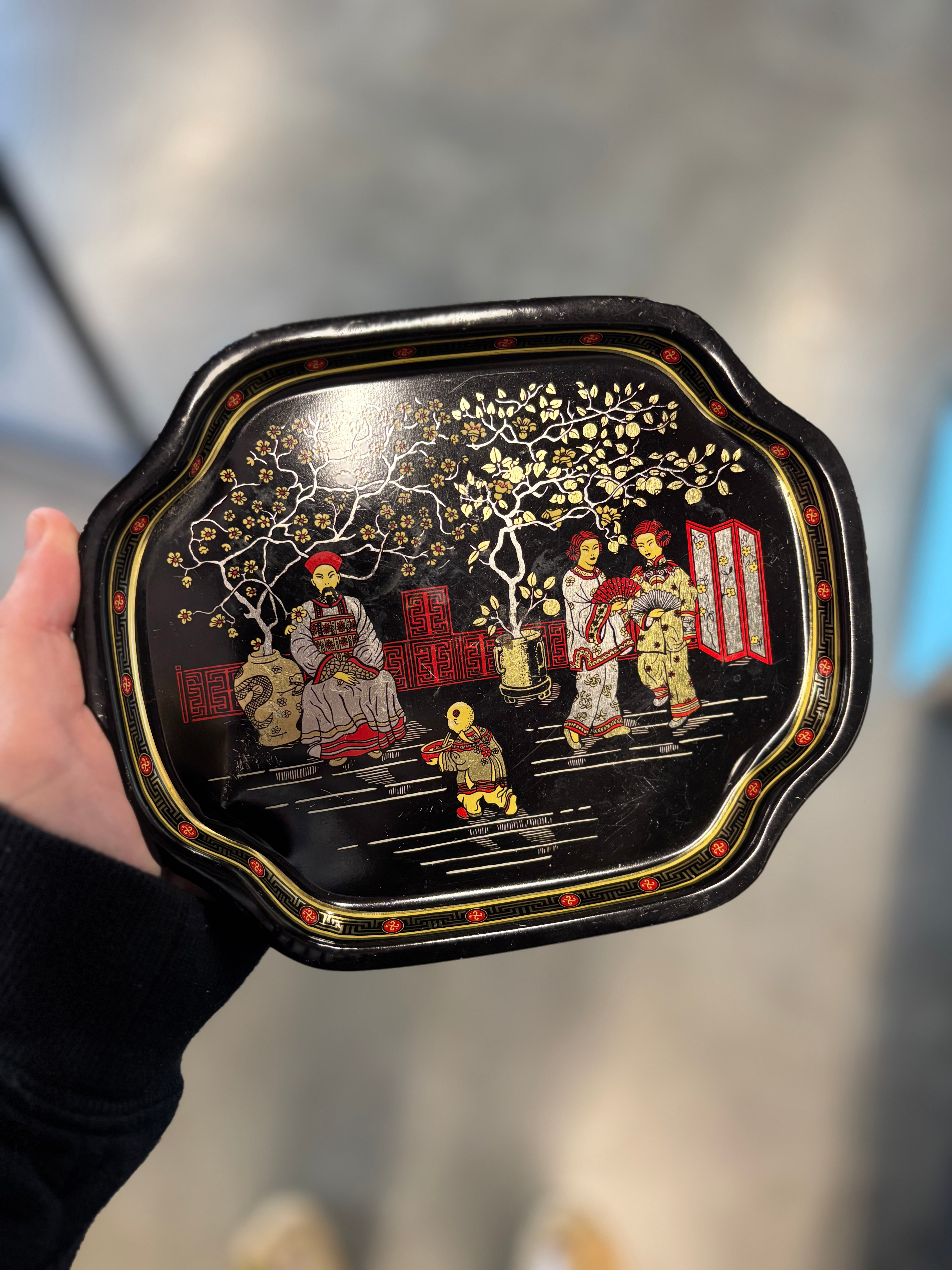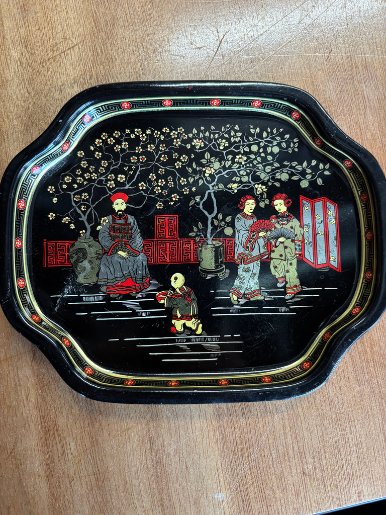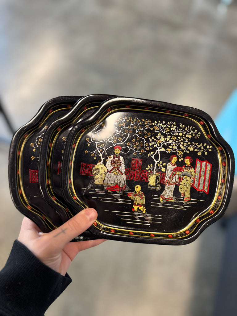 Bring a touch of mid-century charm into your home with this set of 3 vintage tin trays. Each tray features an elegant Asian-inspired courtyard scene in black, gold, red, and cream, with beautifully detailed figures and floral motifs.