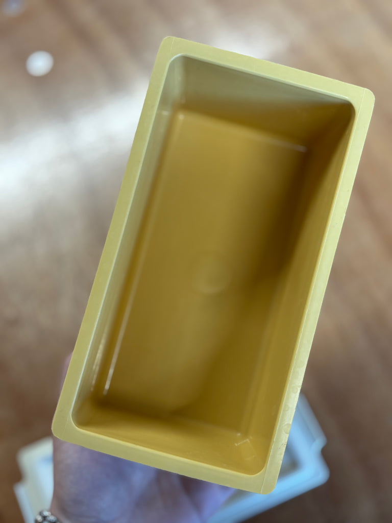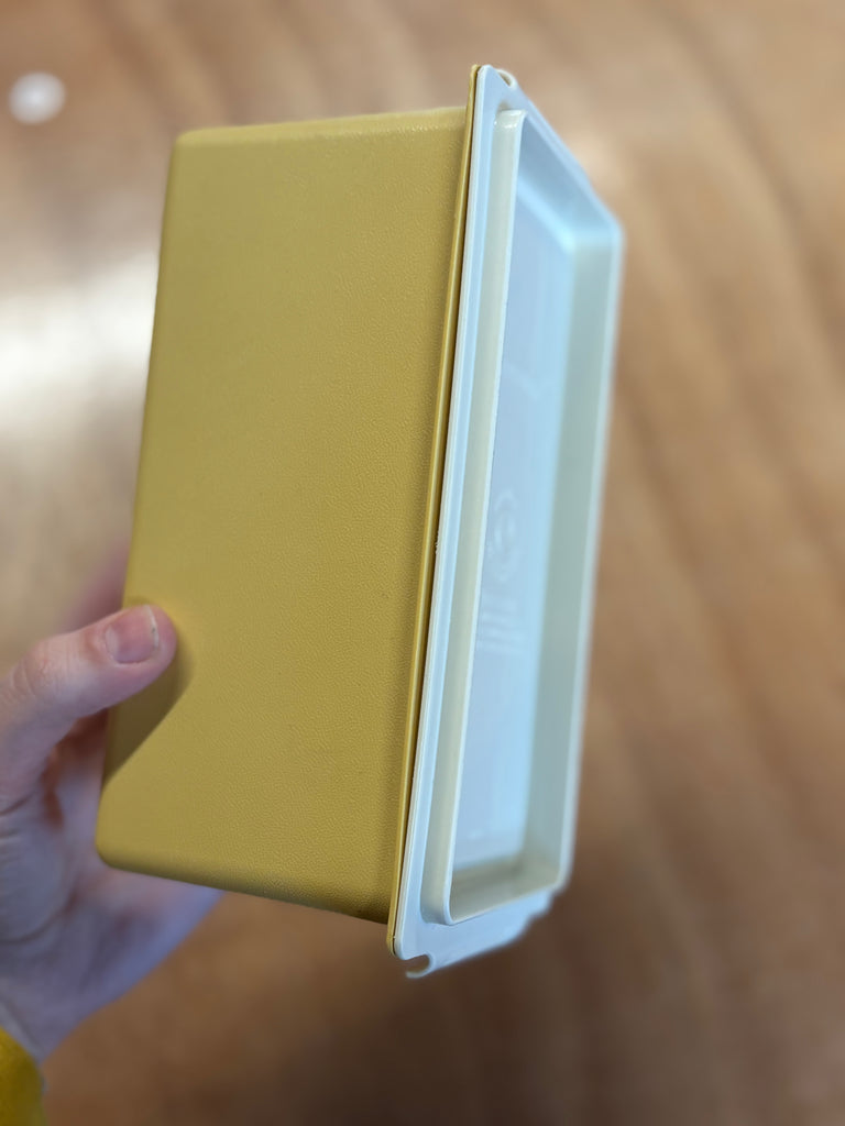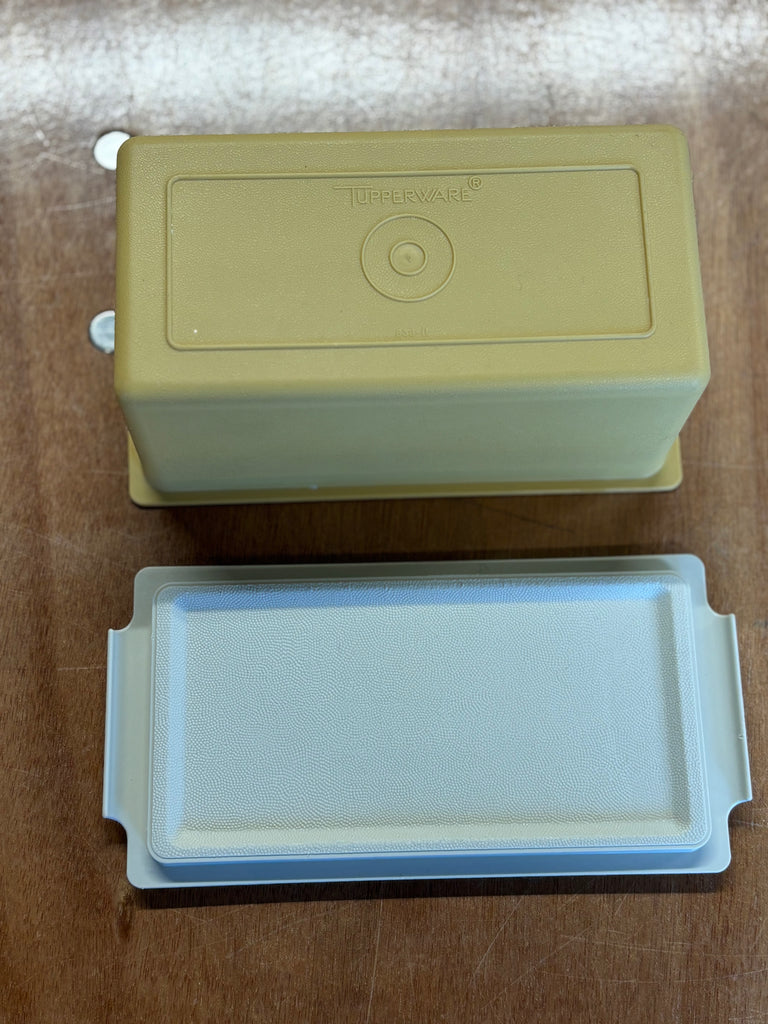 Made in the USA, this piece features the signature harvest gold/yellow lid and off-white base — part of Tupperware’s popular 1970s color line. The rectangular shape fits a standard stick of butter and includes the airtight seal design that made Tupperware famous.