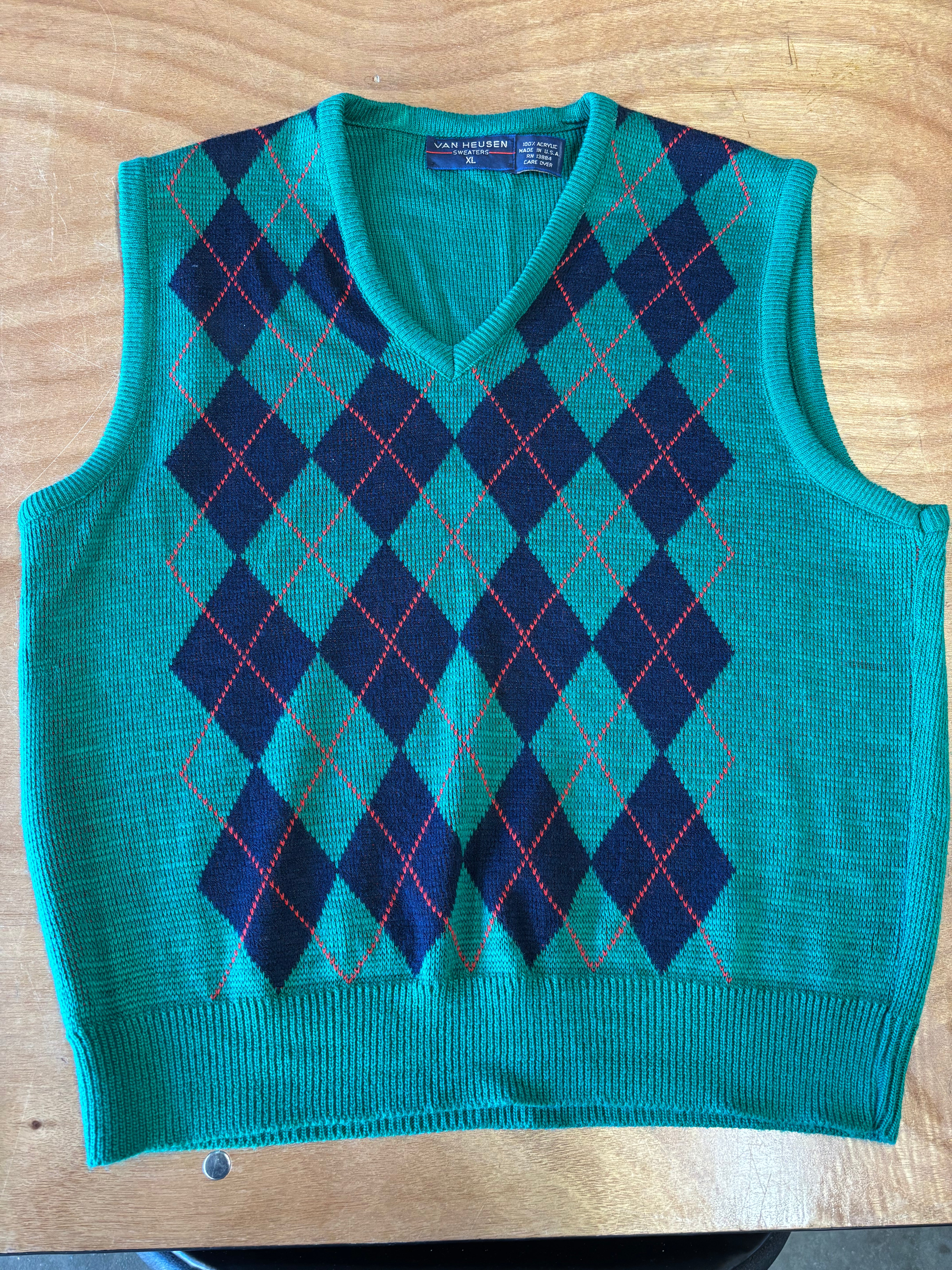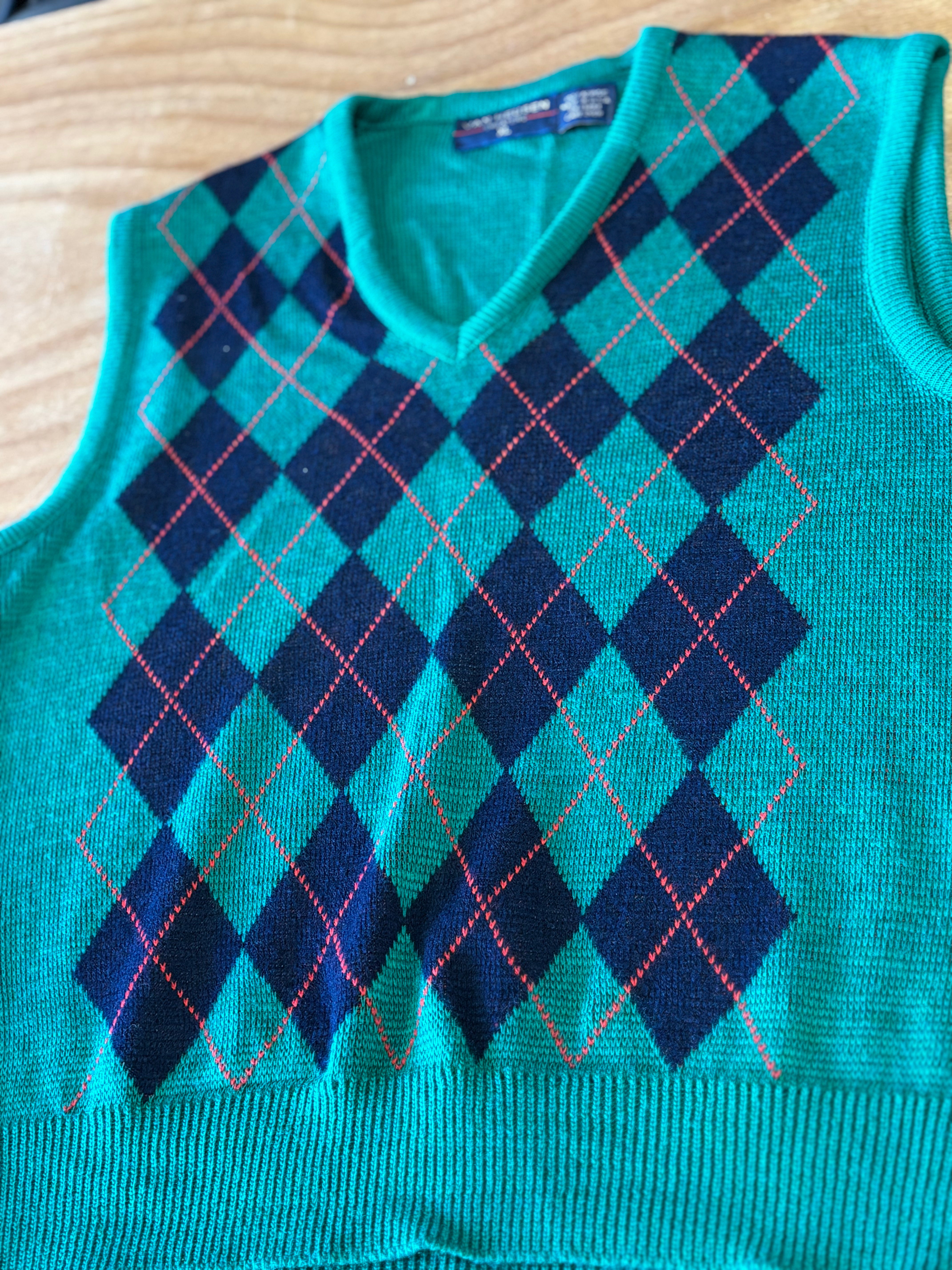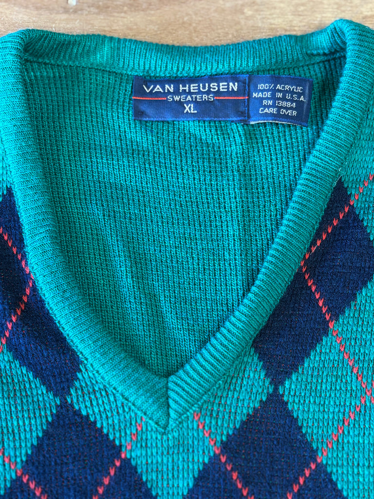 Classic vintage argyle sweater vest by Van Heusen, featuring bold teal and navy diamond patterning with fine red stitching accents. Crafted from soft 100% acrylic knit, this vest delivers that preppy retro aesthetic perfect for layering over collared shirts or turtlenecks.
